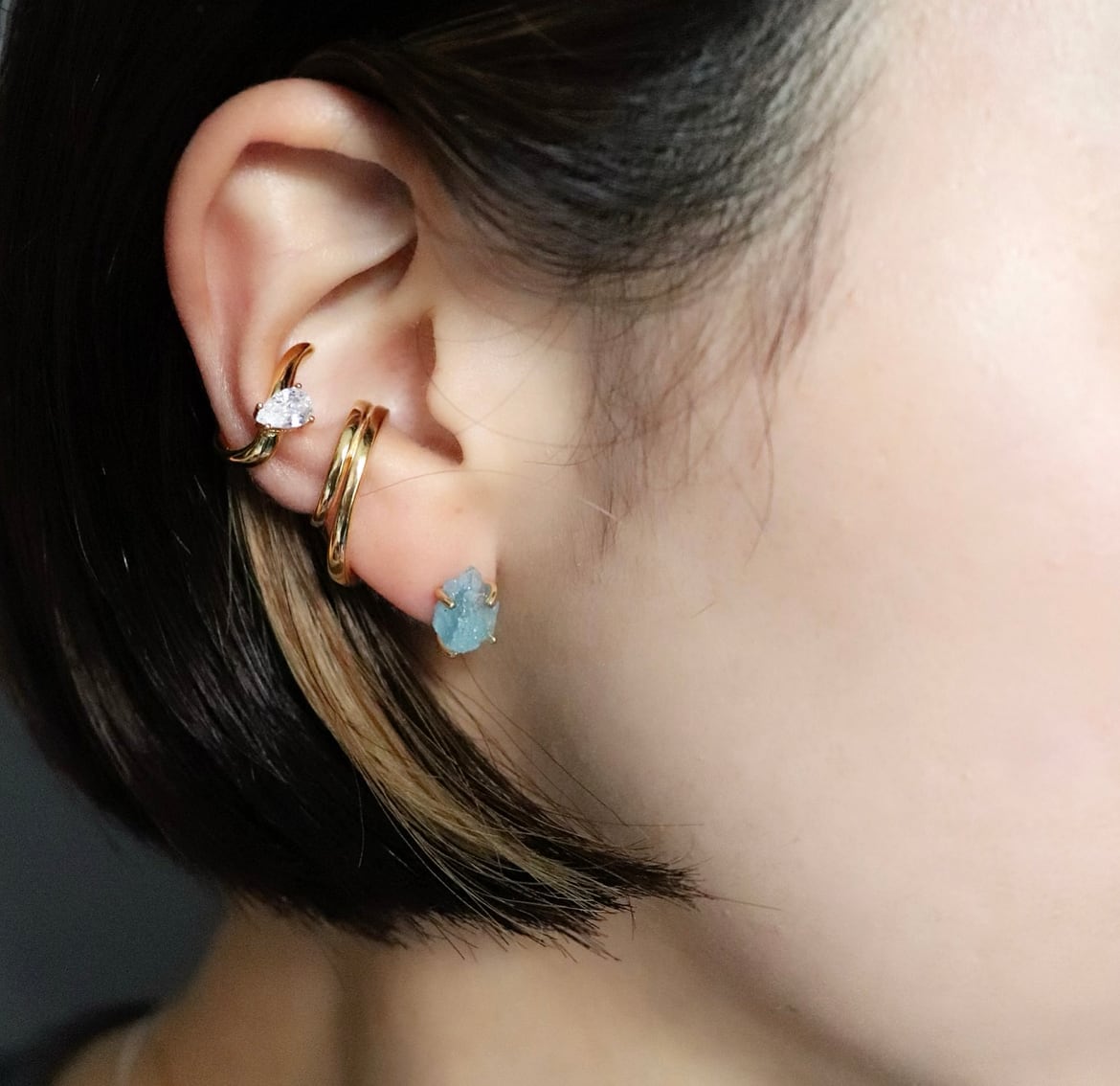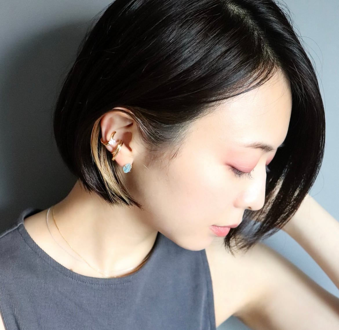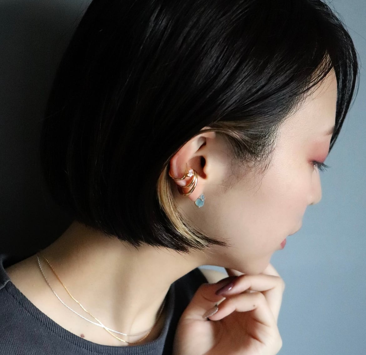 イヤーカフとの重ね付けもおすすめ。