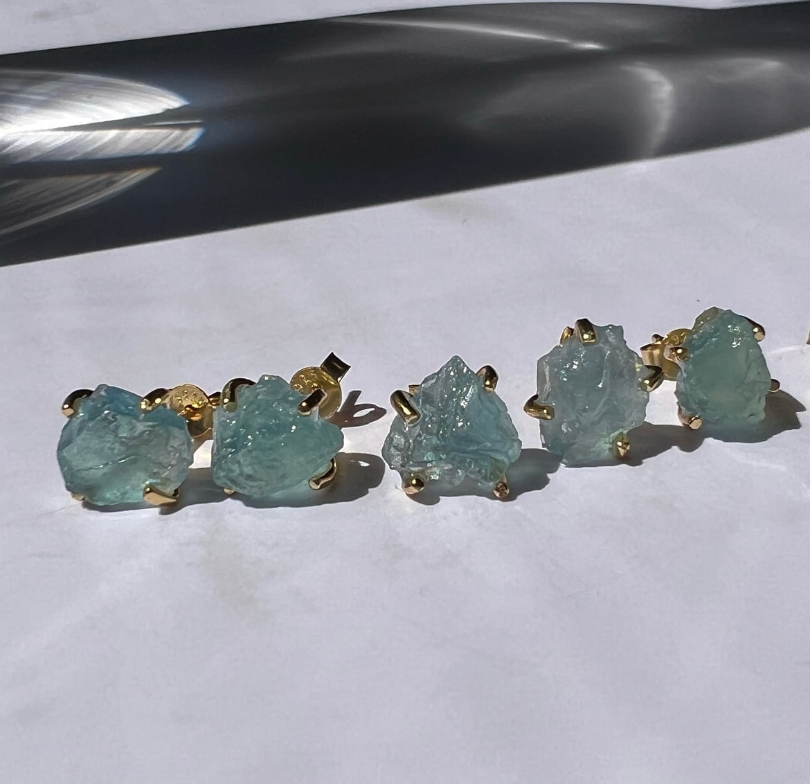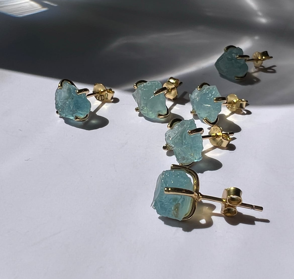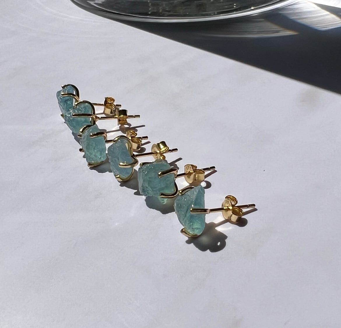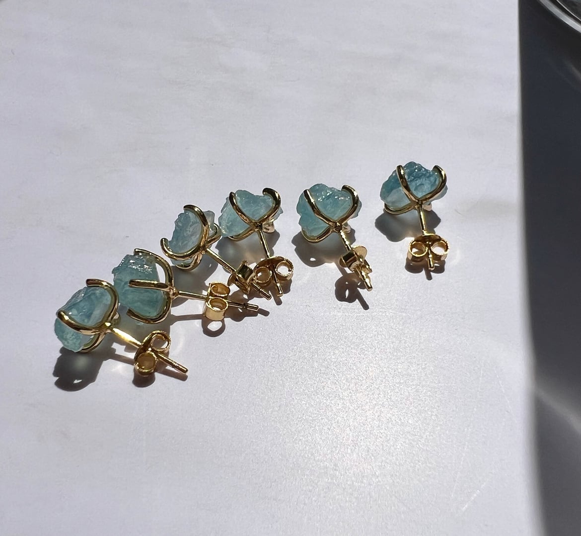 身につけた瞬間に気持ちが明るくなるような、鮮やかなブルーが目を引く、原石の風合いを生かしたアクアマリンのピアス。