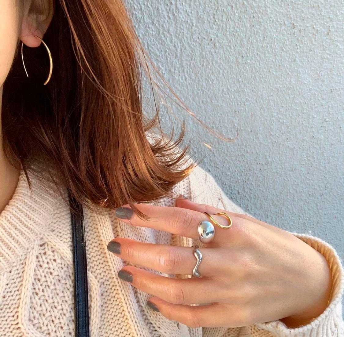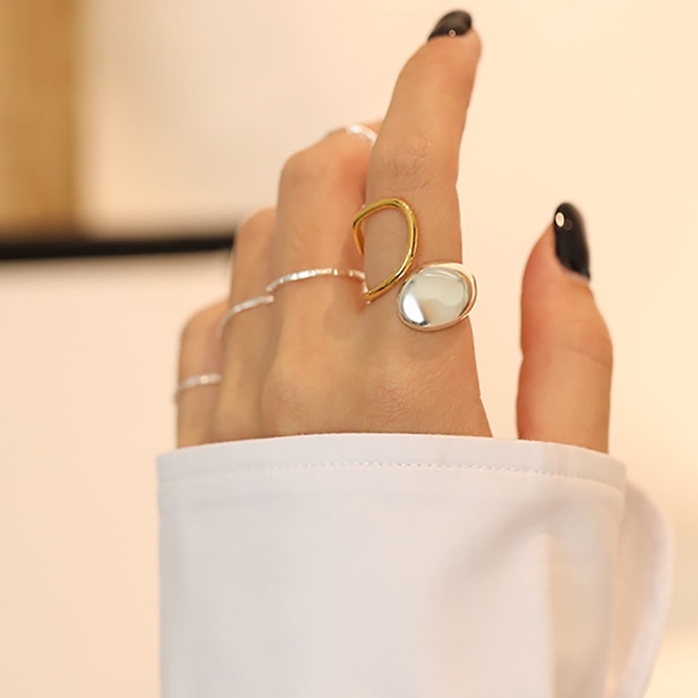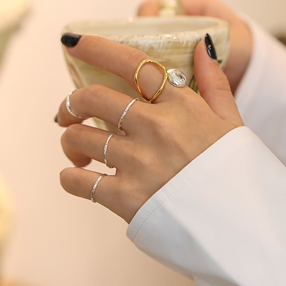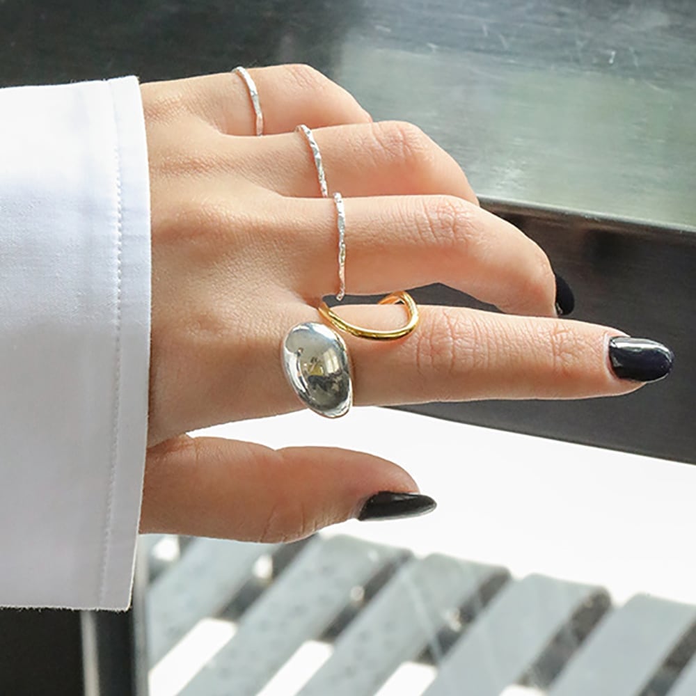 身に着ける指によってガラッと印象も変わり、他のリングとも重ね付けしやすく、大きめのシルエットが指を細く長く見せてくれます◎