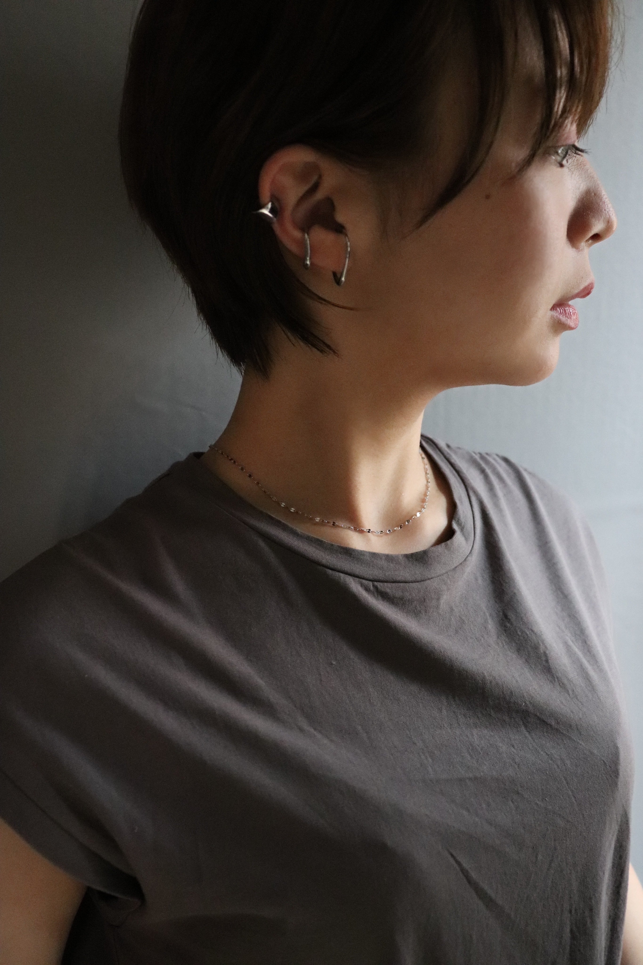 鎖骨辺りにすっきりとおさまり上品な印象でつけていただけ、お手持ちのネックレスとの重ねづけもおすすめです。