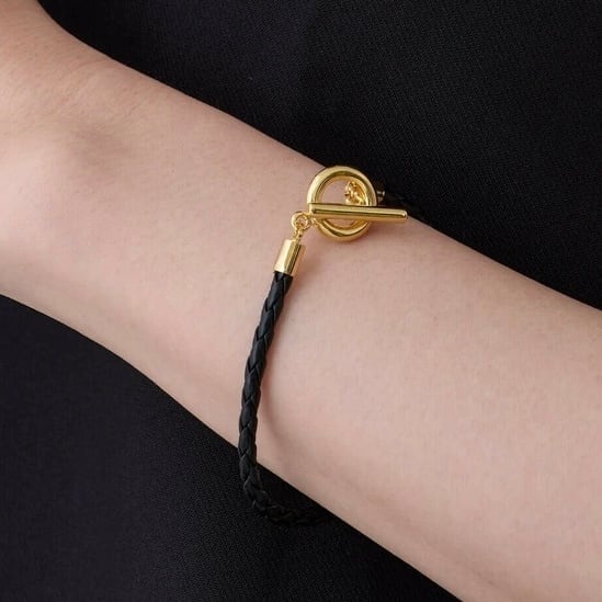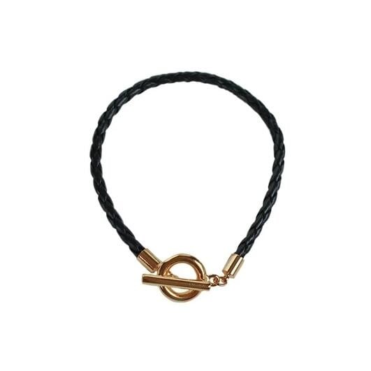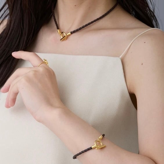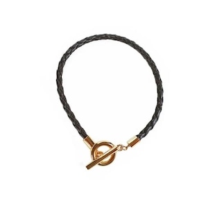 上品なツヤ感のあるメタルパーツと、シックな編み込みレザーを組み合わせたシンプルなブレスレットです。