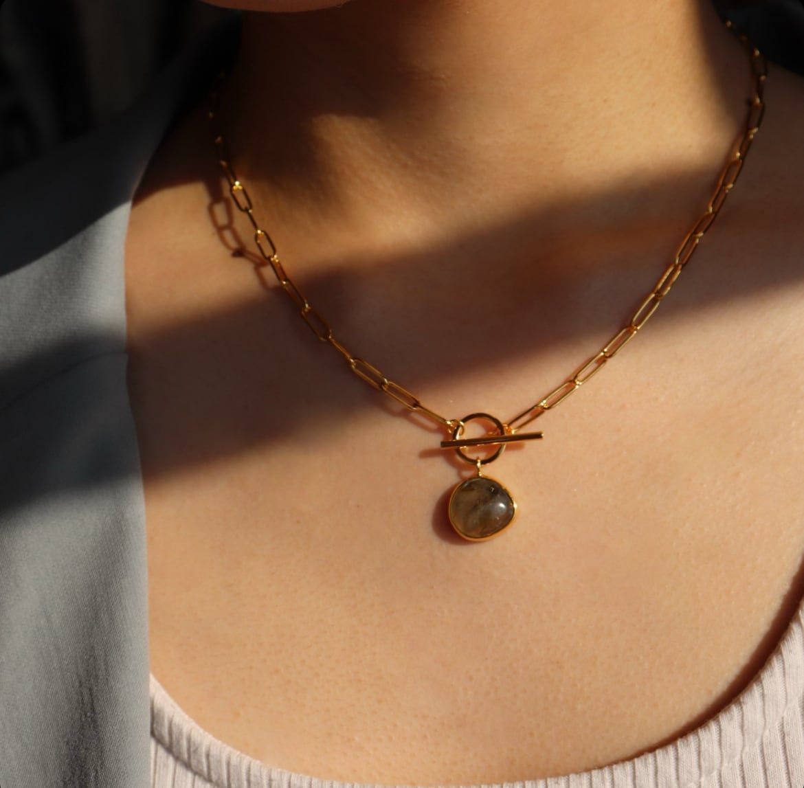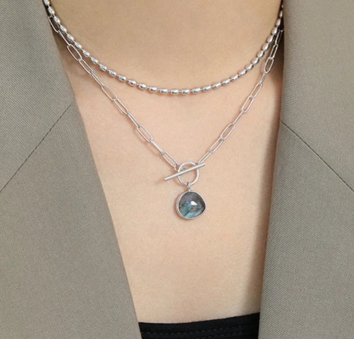 ラブラドライトならではの、角度によって青やグリーンに輝く美しさが胸元できらり。