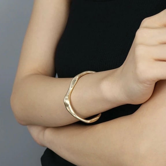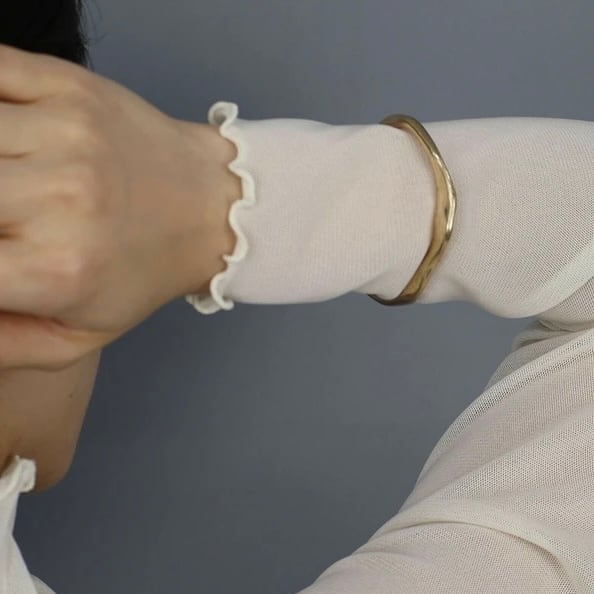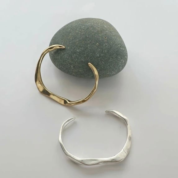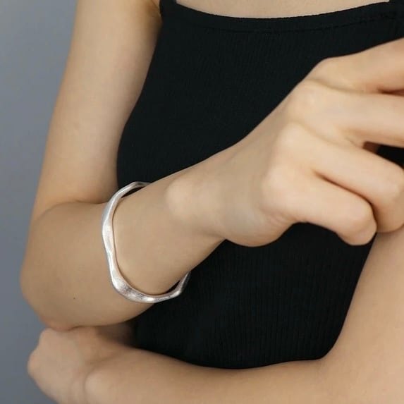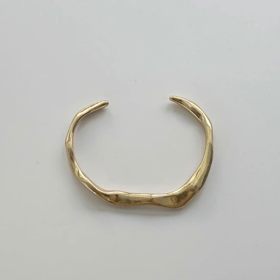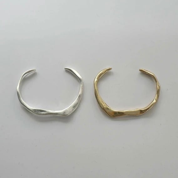 正面から見た時の動きのある細やかな曲線と、側面から見た時の厚み・凸凹ディテールが、どの角度から見ても美しいラインを放つメタルバングル。