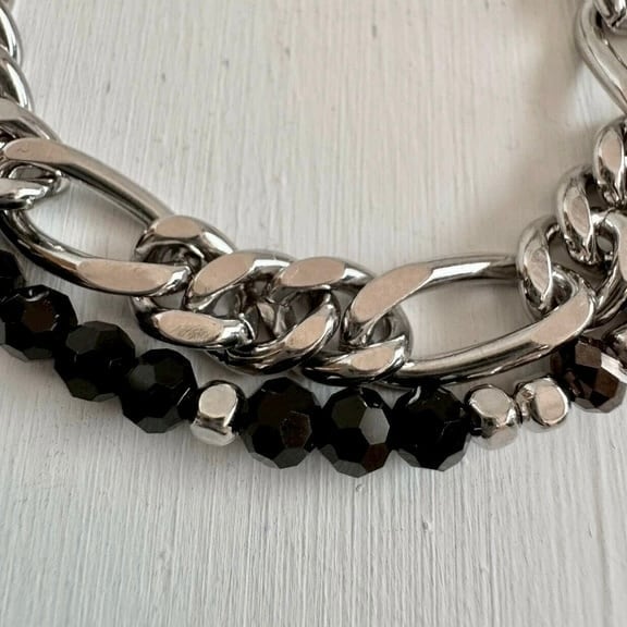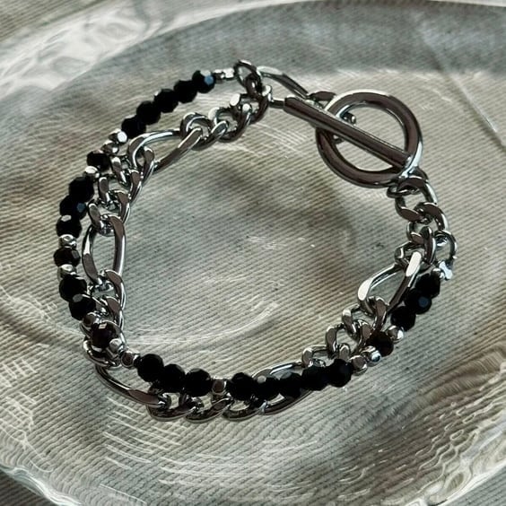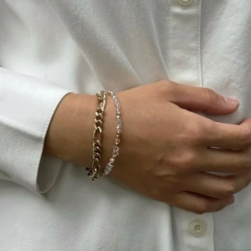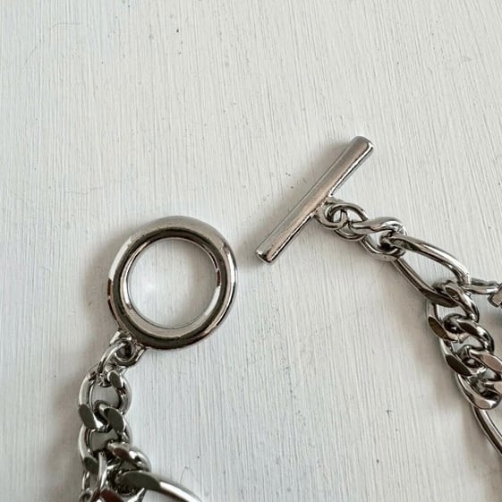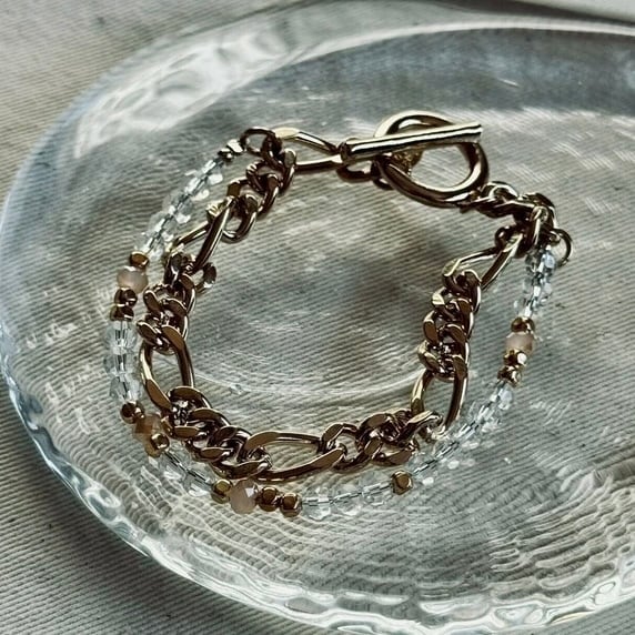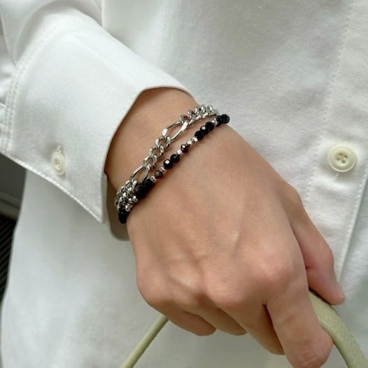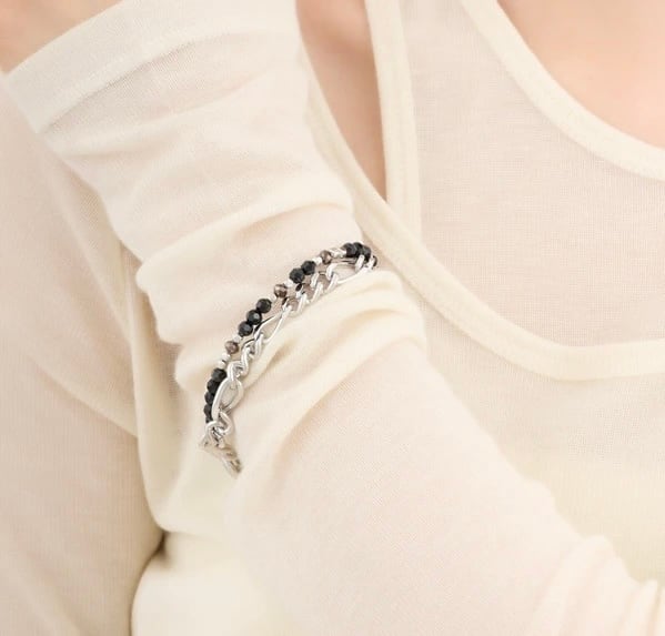 カラービーズチェーンとボリュームメタルチェーンをコンビにした2連チェーンブレスレット。