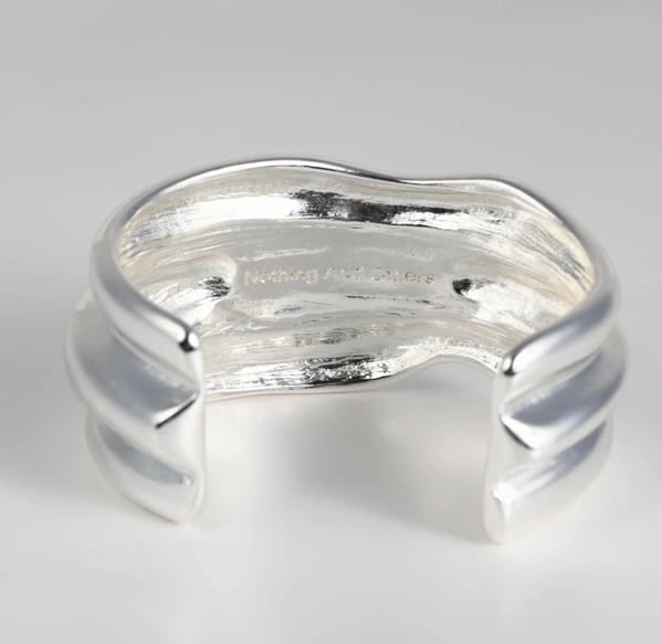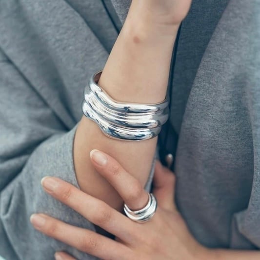 アシンメトリーにウェーブしたデザインは、手元のコーディネートのポイントとなるアイテムです。