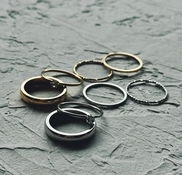 モダンな雰囲気を漂わせるデザインリングやひと粒サイズのクリアストーン、プレーンなシンプルリングなど、お手持ちのリングとも合わせやすくおすすめです。