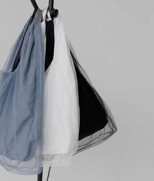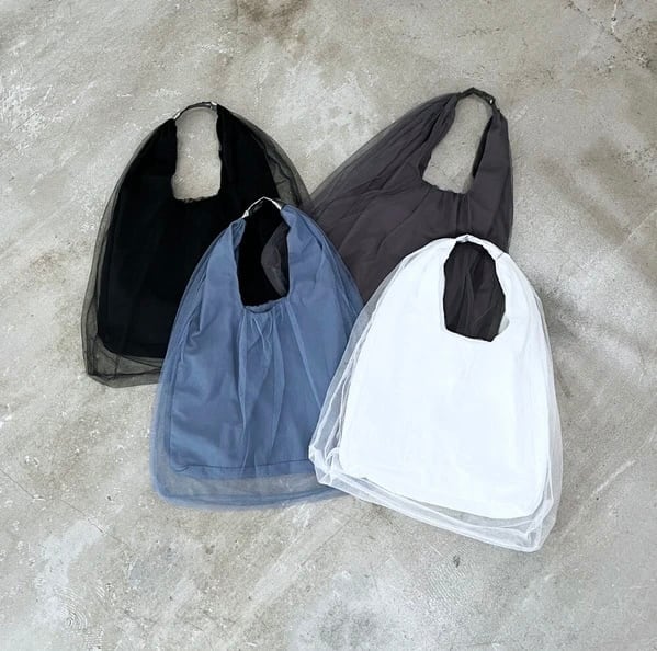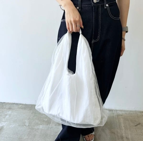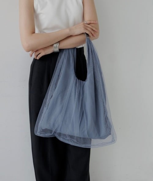 チュールで覆った大胆なデザインが特徴的で、ハンドル部分のメタリック素材がトレンド感をプラス。