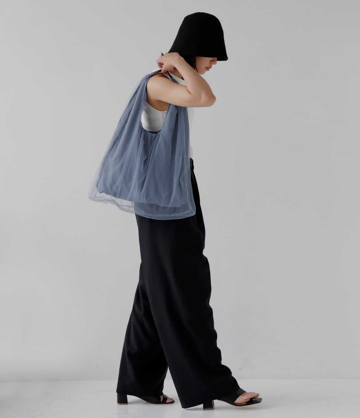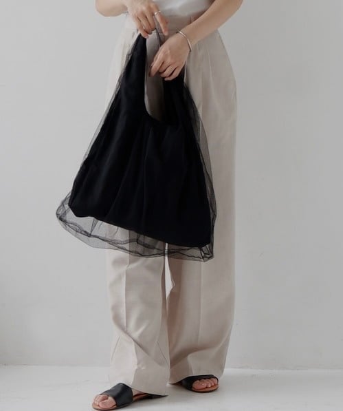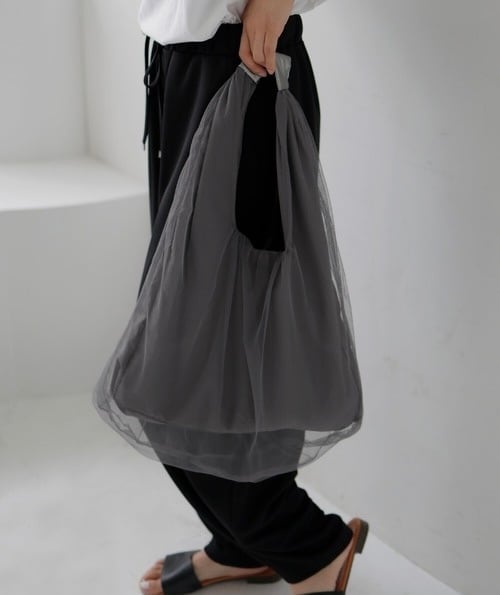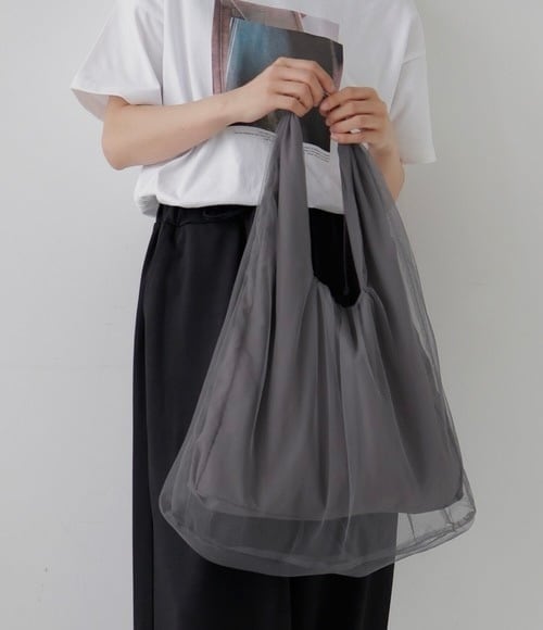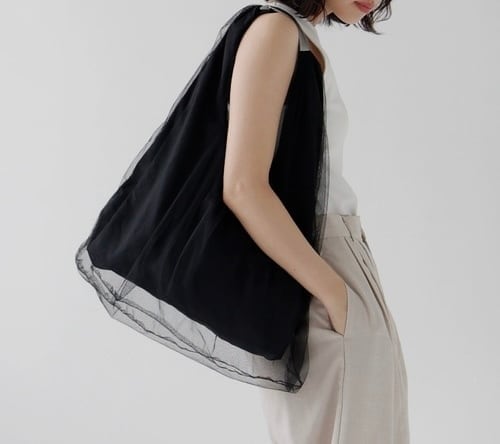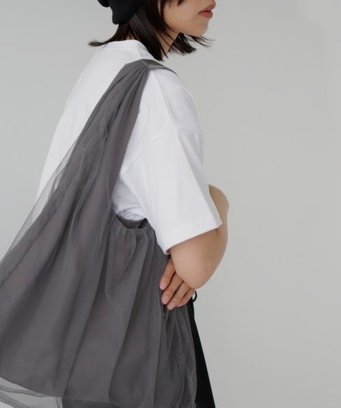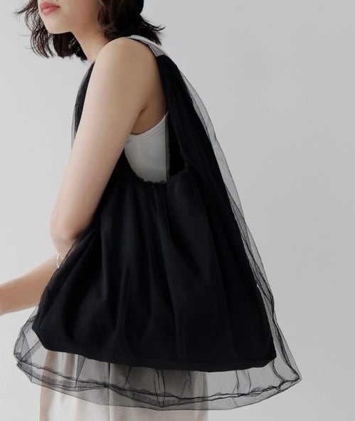 チュールデザインがコーディネートのアクセントになる大容量が嬉しいお出かけバック。