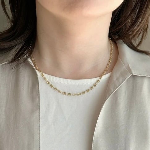 小さなドットパーツを集め装飾したチェーンが存在感を放つネックレス。