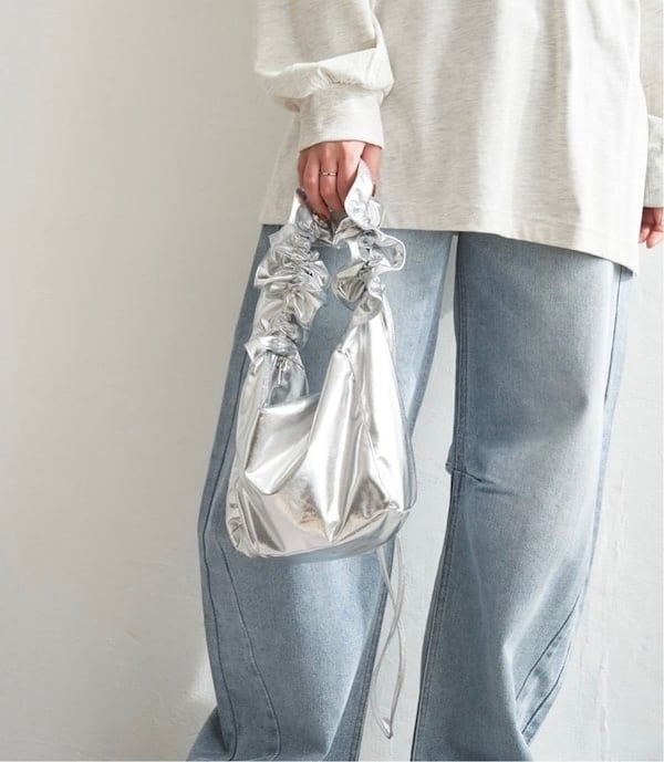 完全に絞ってギャザー持ち手のハンドバッグ持ちが今季らしくおすすめ。