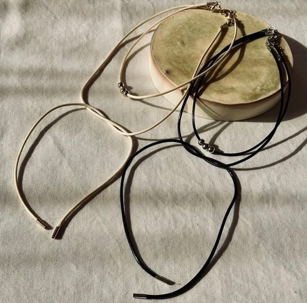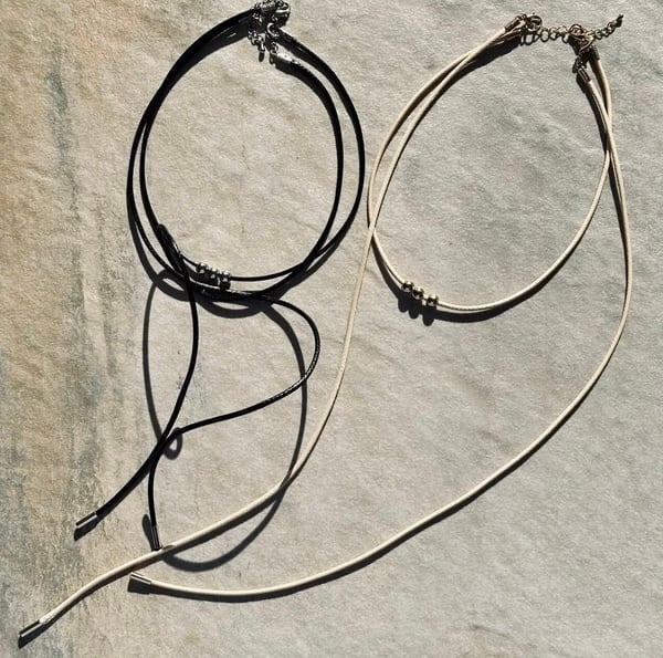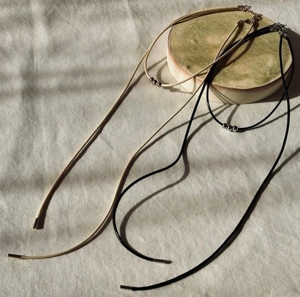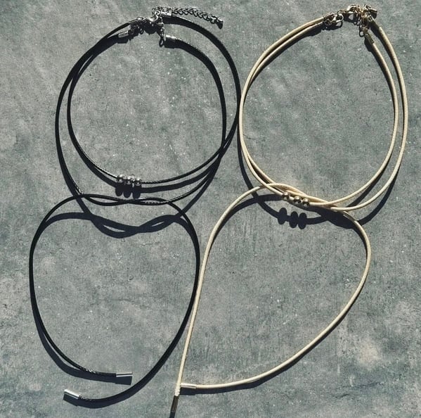 メタルパーツを異素材のコードに配置した、2WAYネックレスチョーカー。