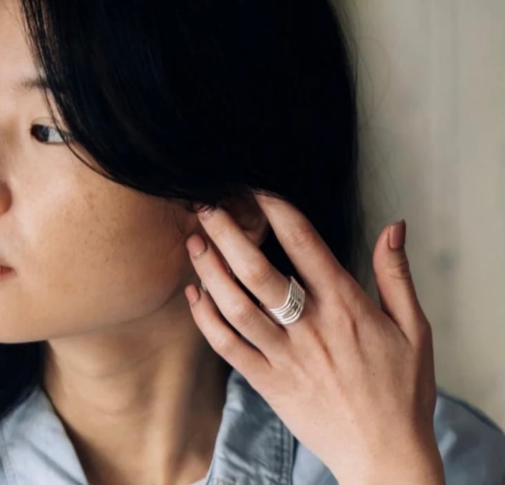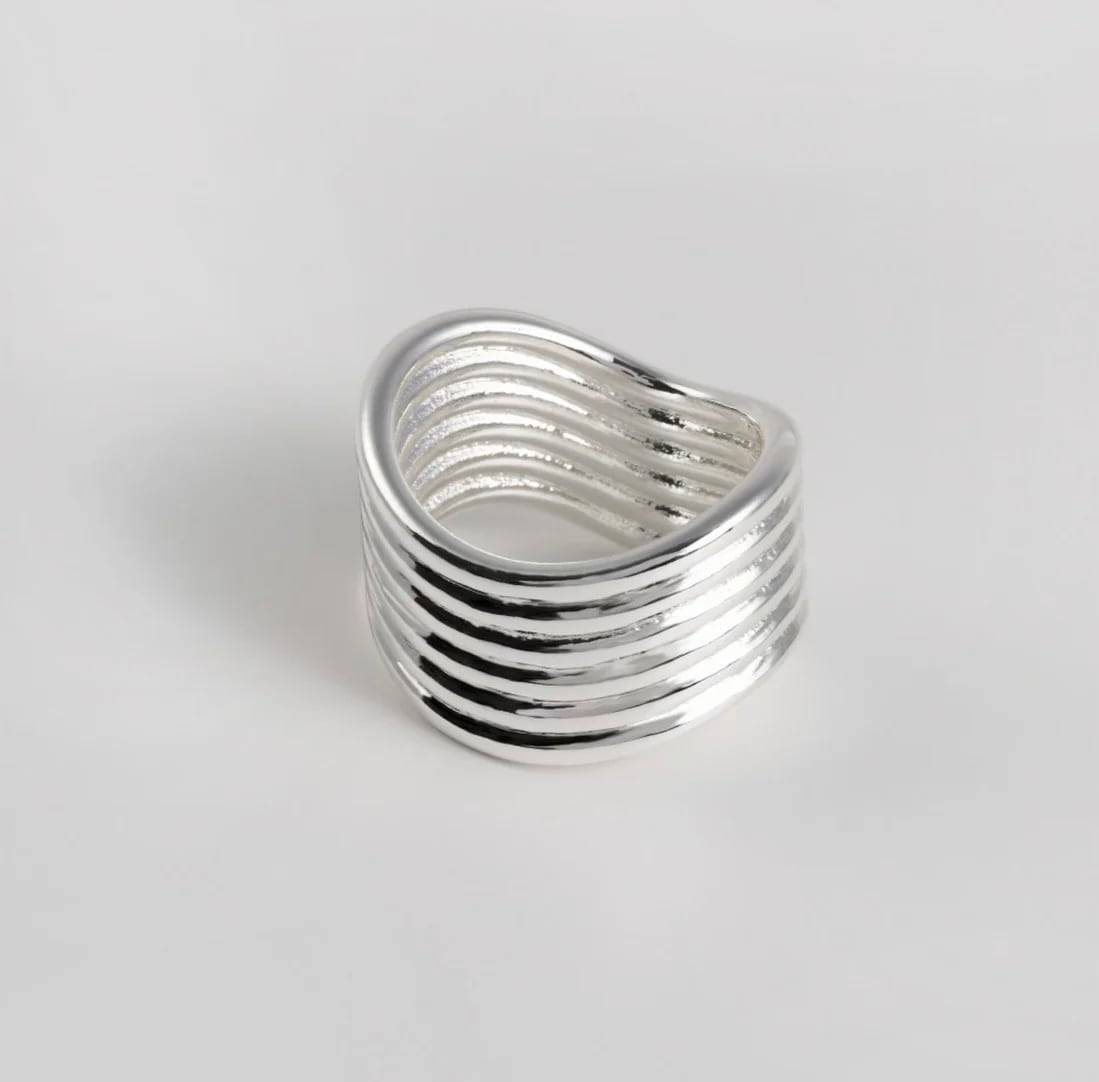 細いラインを重ねたラインでデザインされたボリュームリングです。