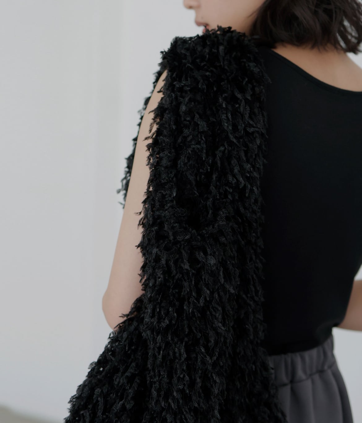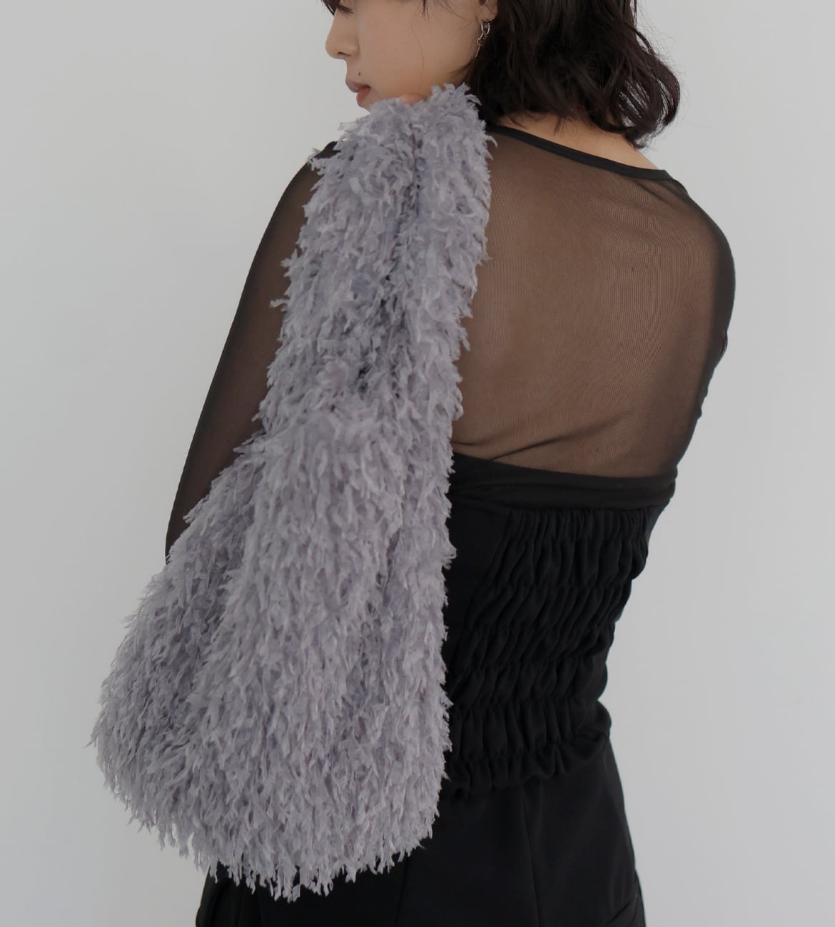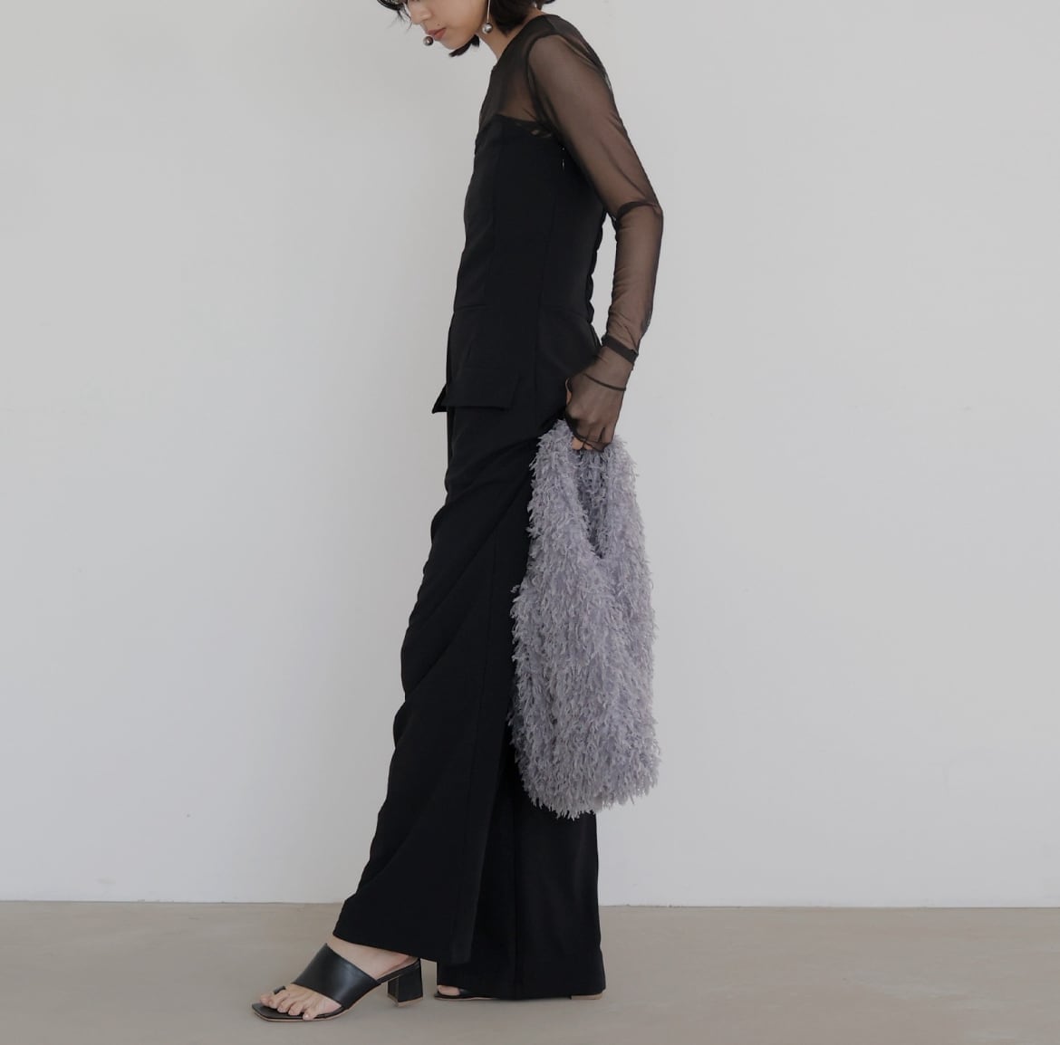 存在感のあるフェザー素材がコーデのワンポイントとなります。