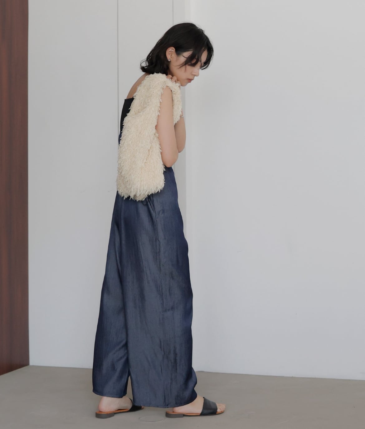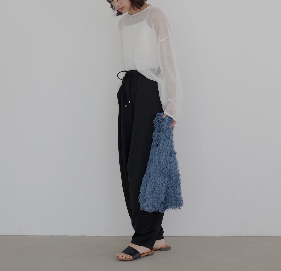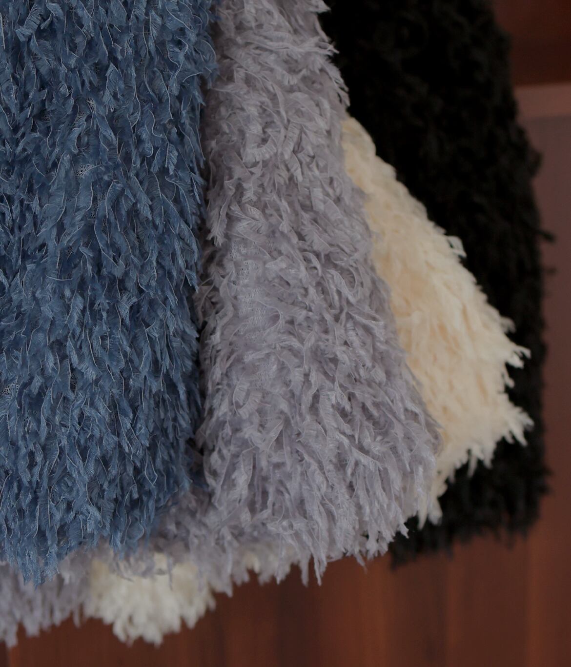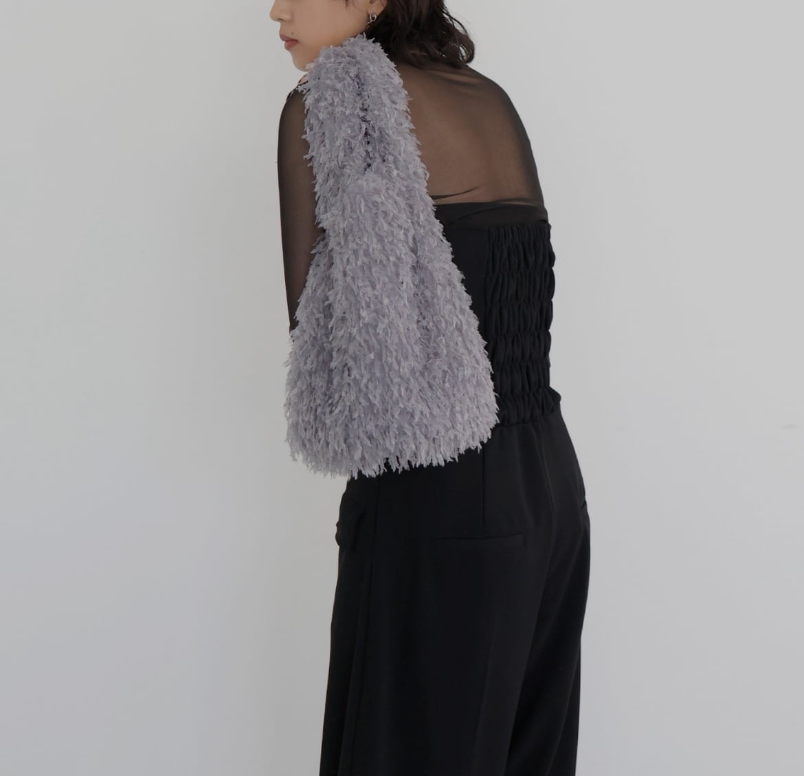 存在感のあるフェザー素材がコーデのワンポイントとなります。