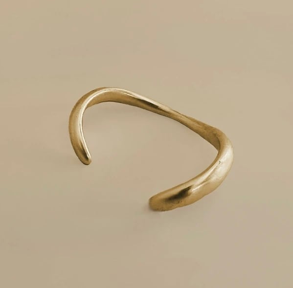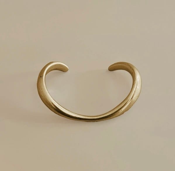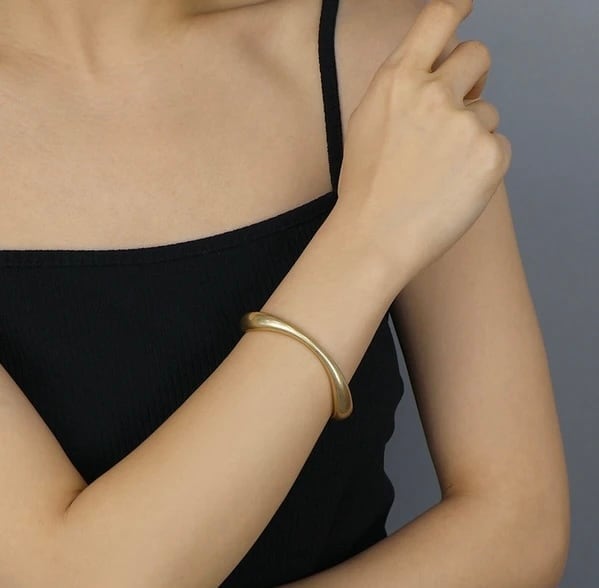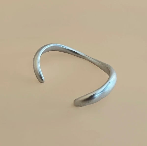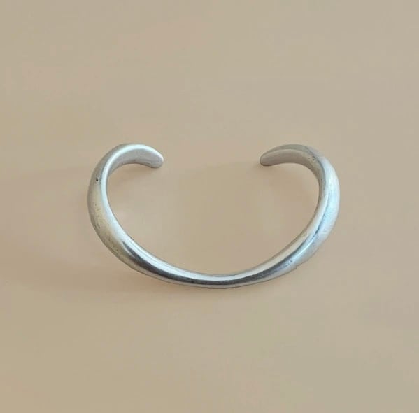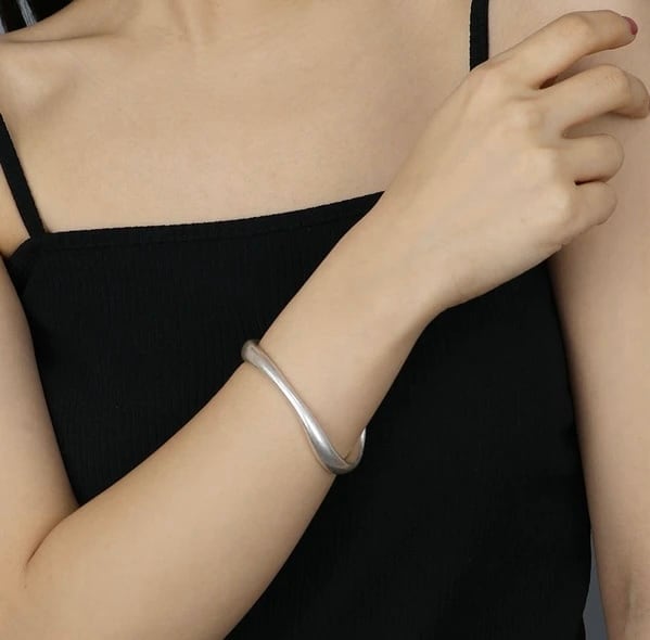 緩やかに幅を変えるボリューミーなラインが手元を印象的に飾るメタルバングル。