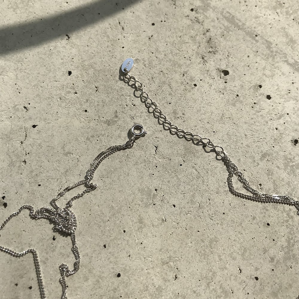 チェーンは45cm+アジャスター5cmと長めなので、短めのシンプルなネックレスと重ねても上品な首元に仕上がります。