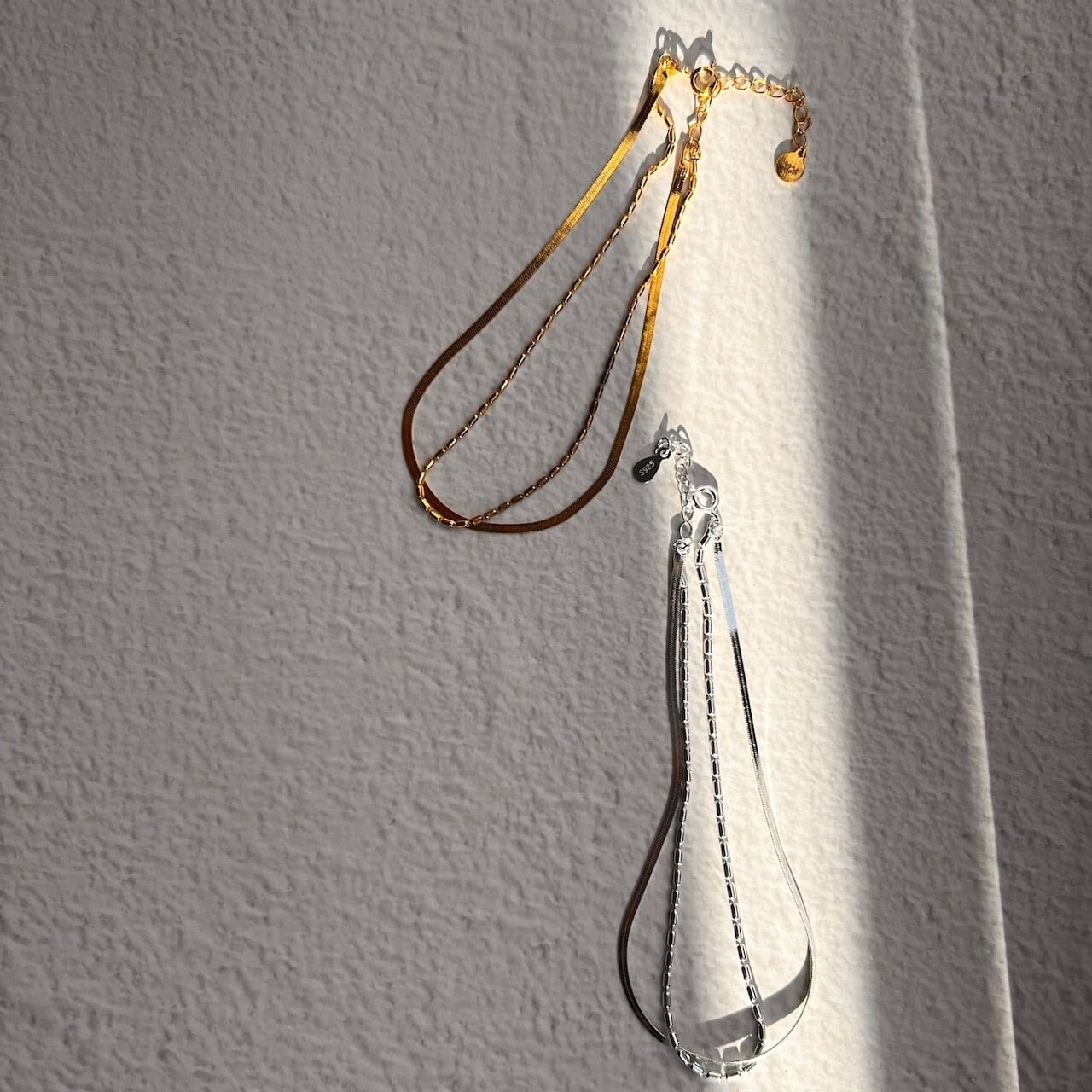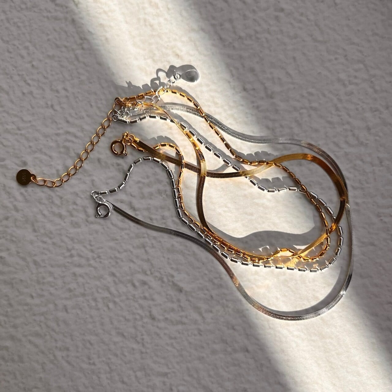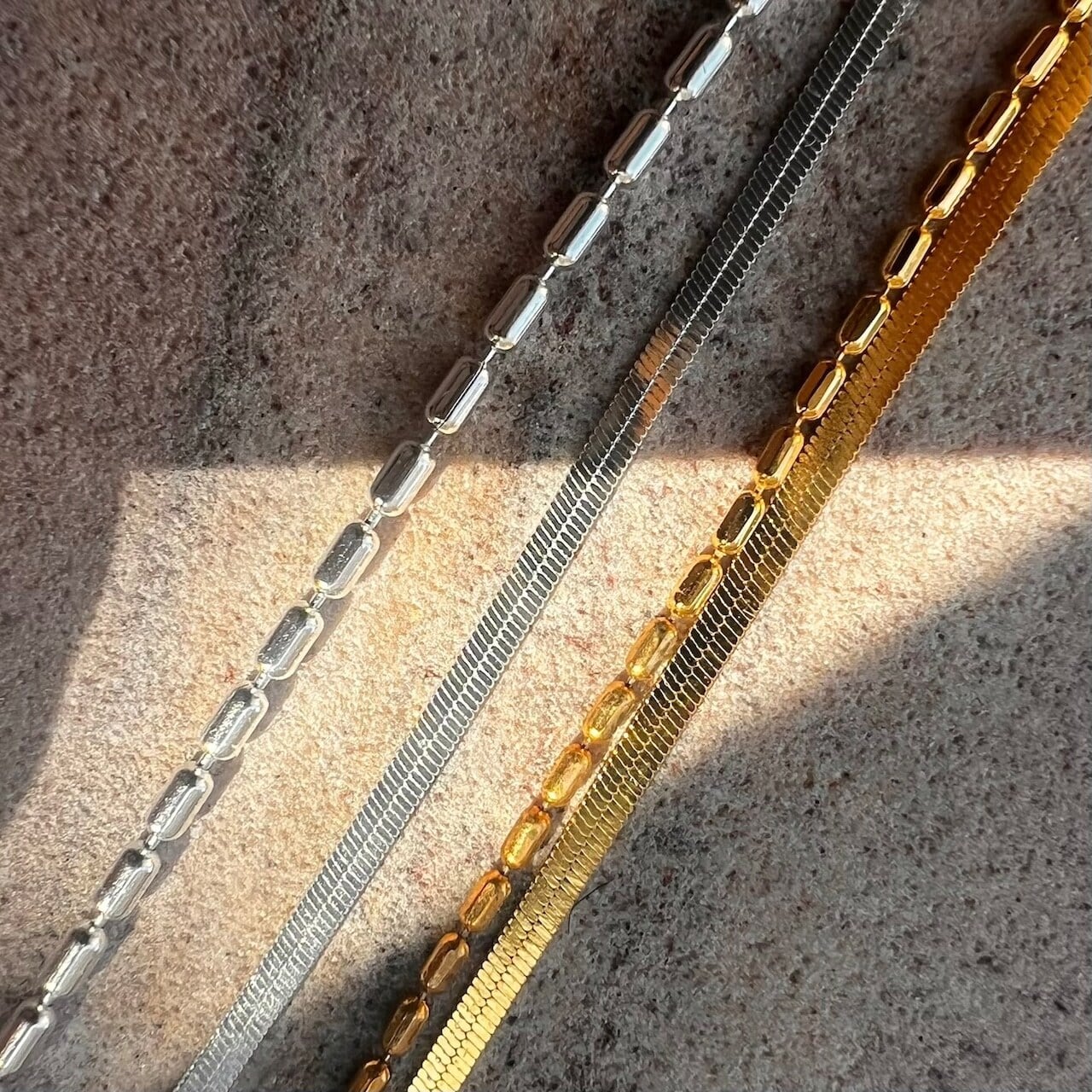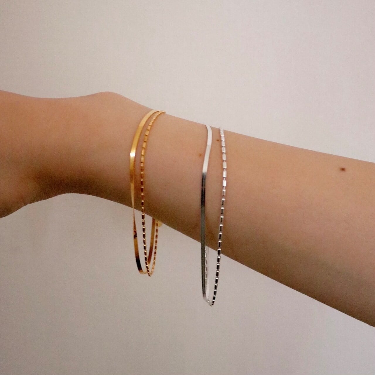 繊細なプレートチェーンと、程よい存在感のあるチェーンを組み合わせたデザインで、手元にモダンなアクセントを添えます。