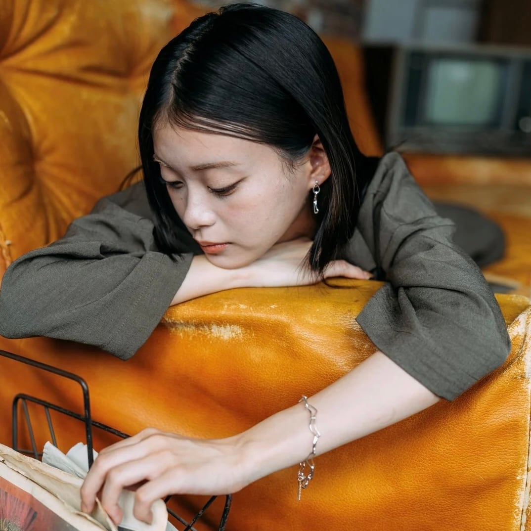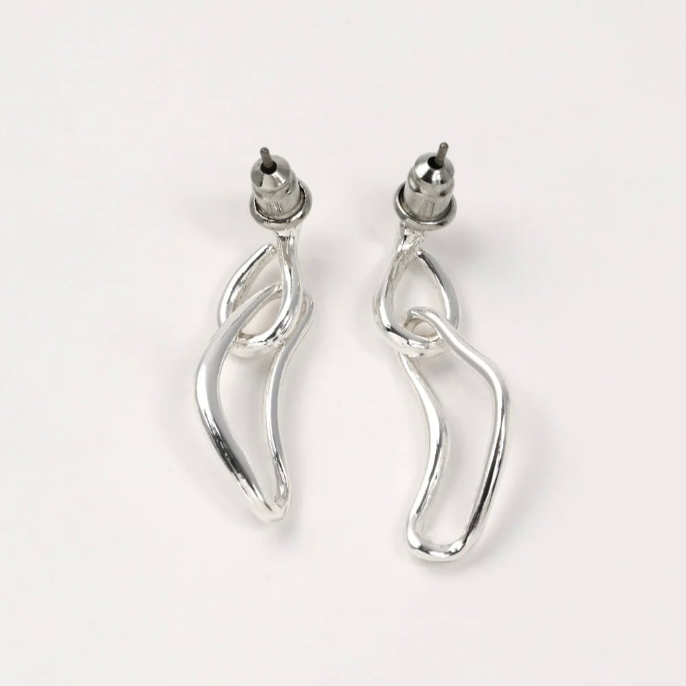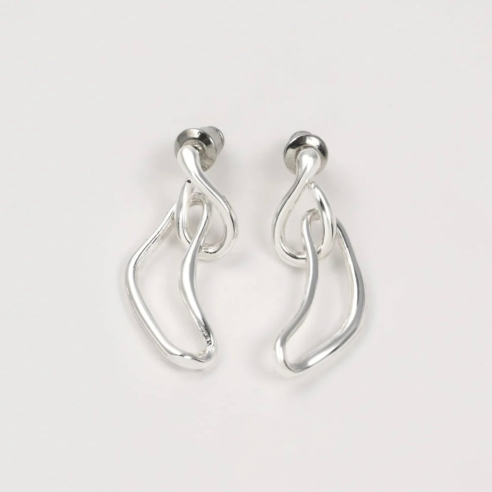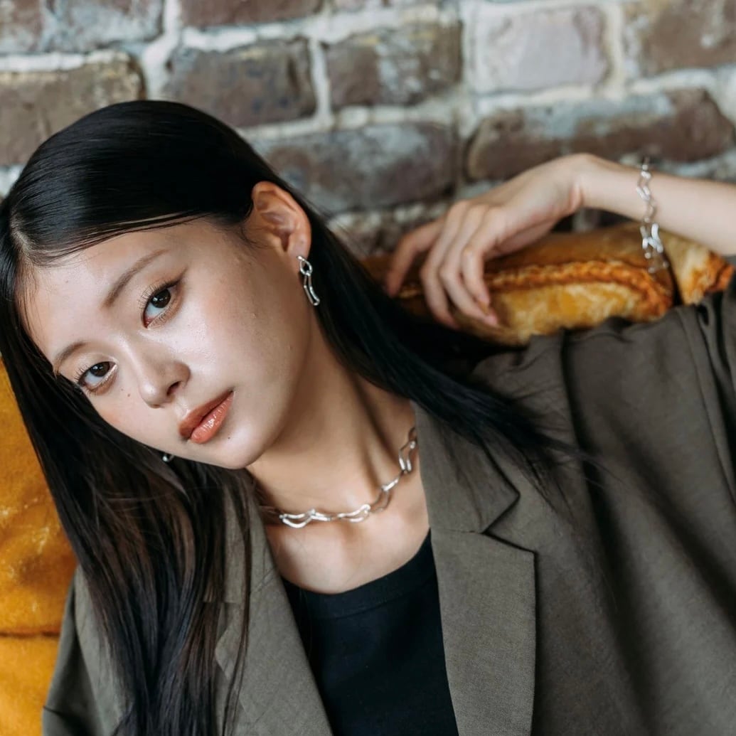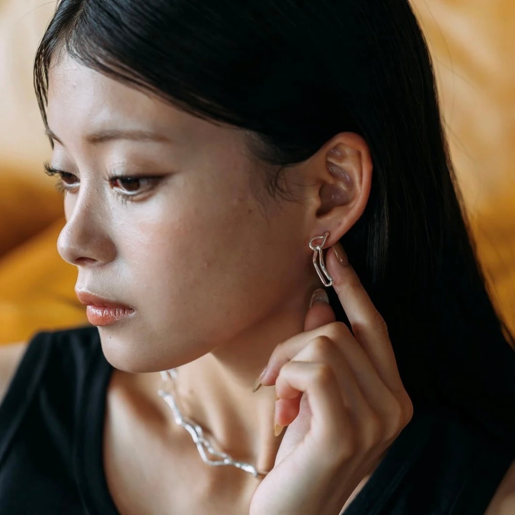 ピアスは、チェーンの一コマを取り入れたシンプルながら、動くたびに揺れるフォルムが印象的。