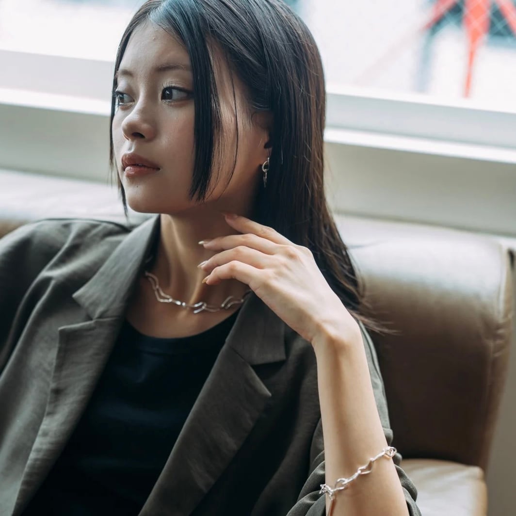ネックレスはしっかりとした存在感がありながらも、長すぎない絶妙なレングスで首元をすっきりと綺麗に魅せてくれます。