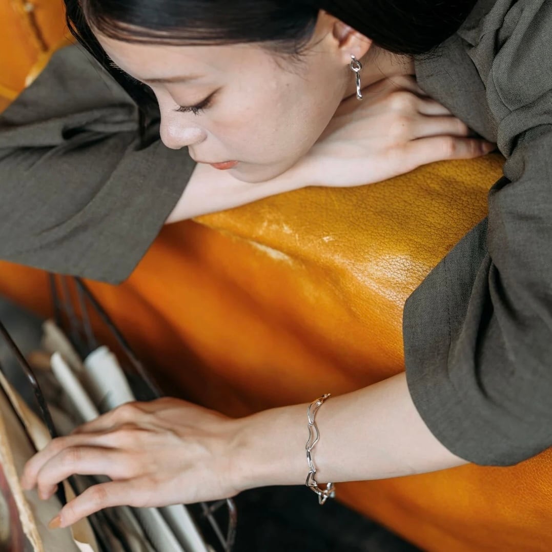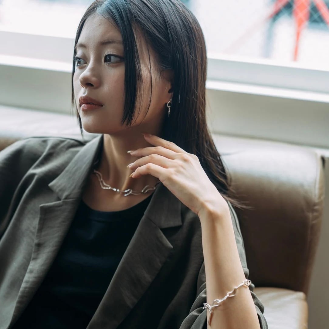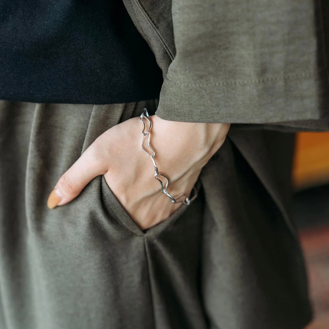 ブレスレットは、シンプルながらも目を惹くボリューム感で、カジュアルにもモードなスタイリングにも自然と馴染みます。