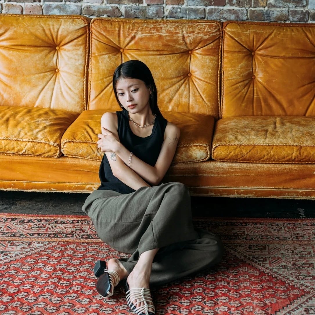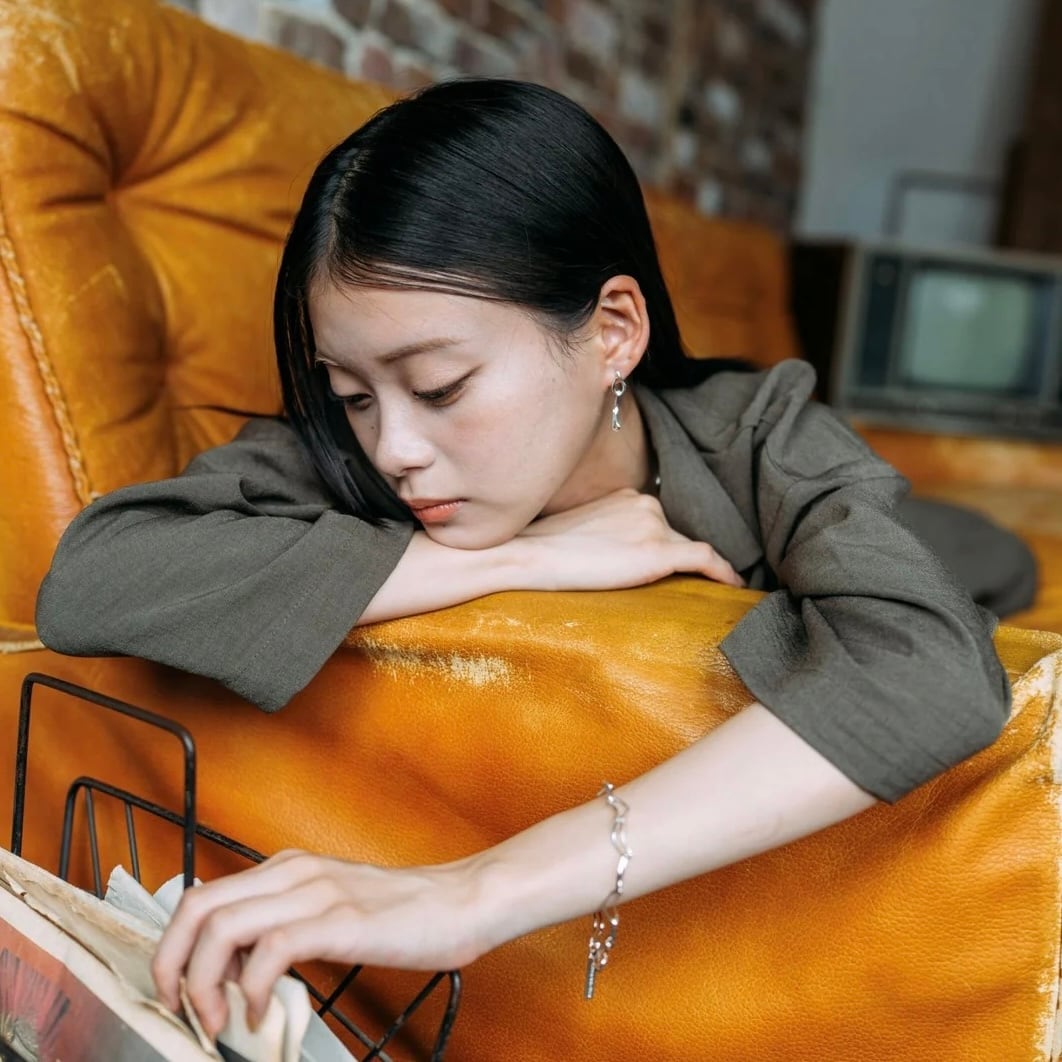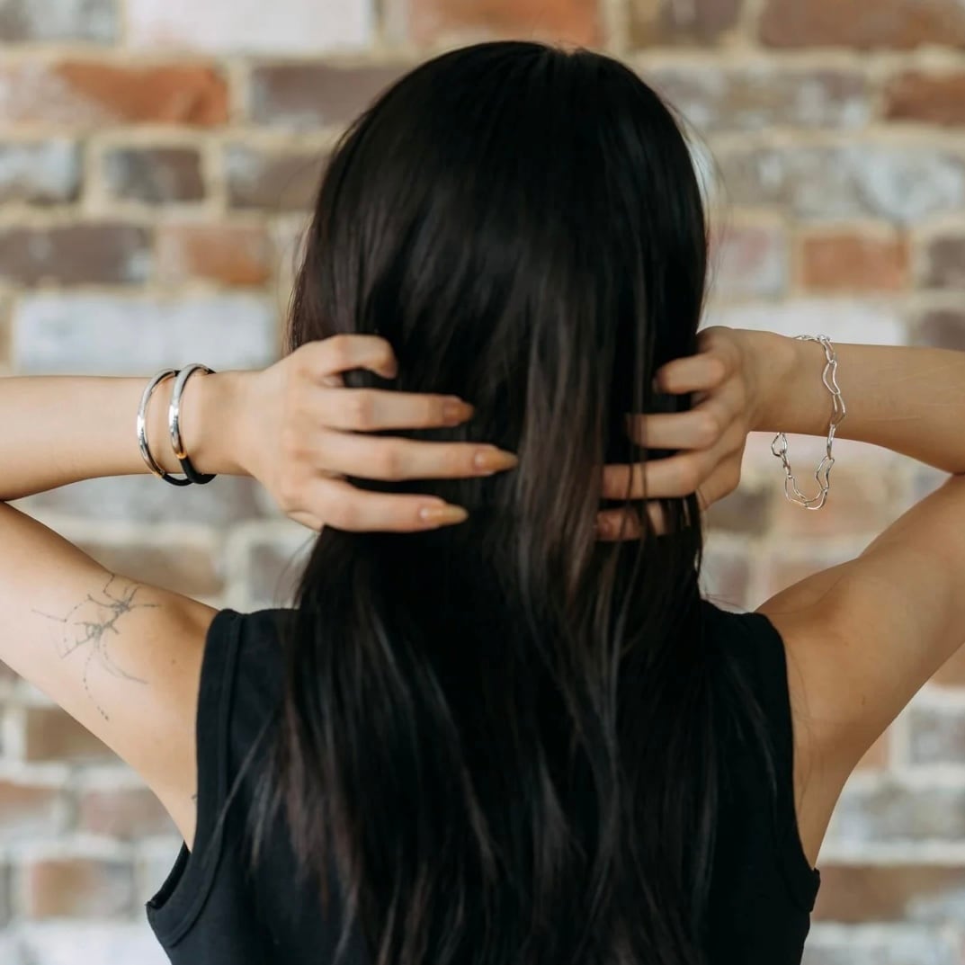 ブレスレットは、シンプルながらも目を惹くボリューム感で、カジュアルにもモードなスタイリングにも自然と馴染みます。