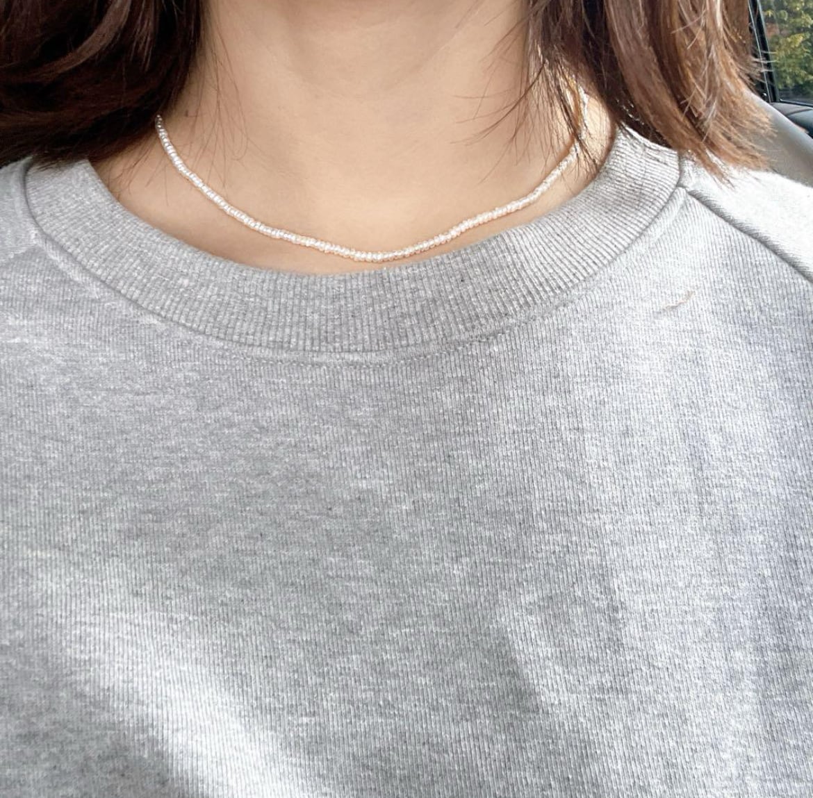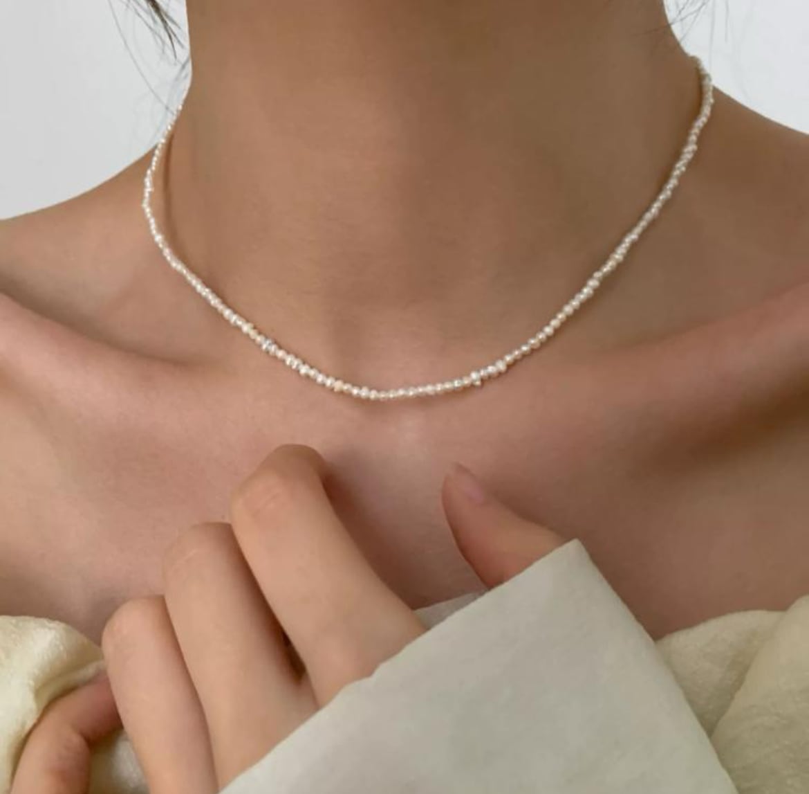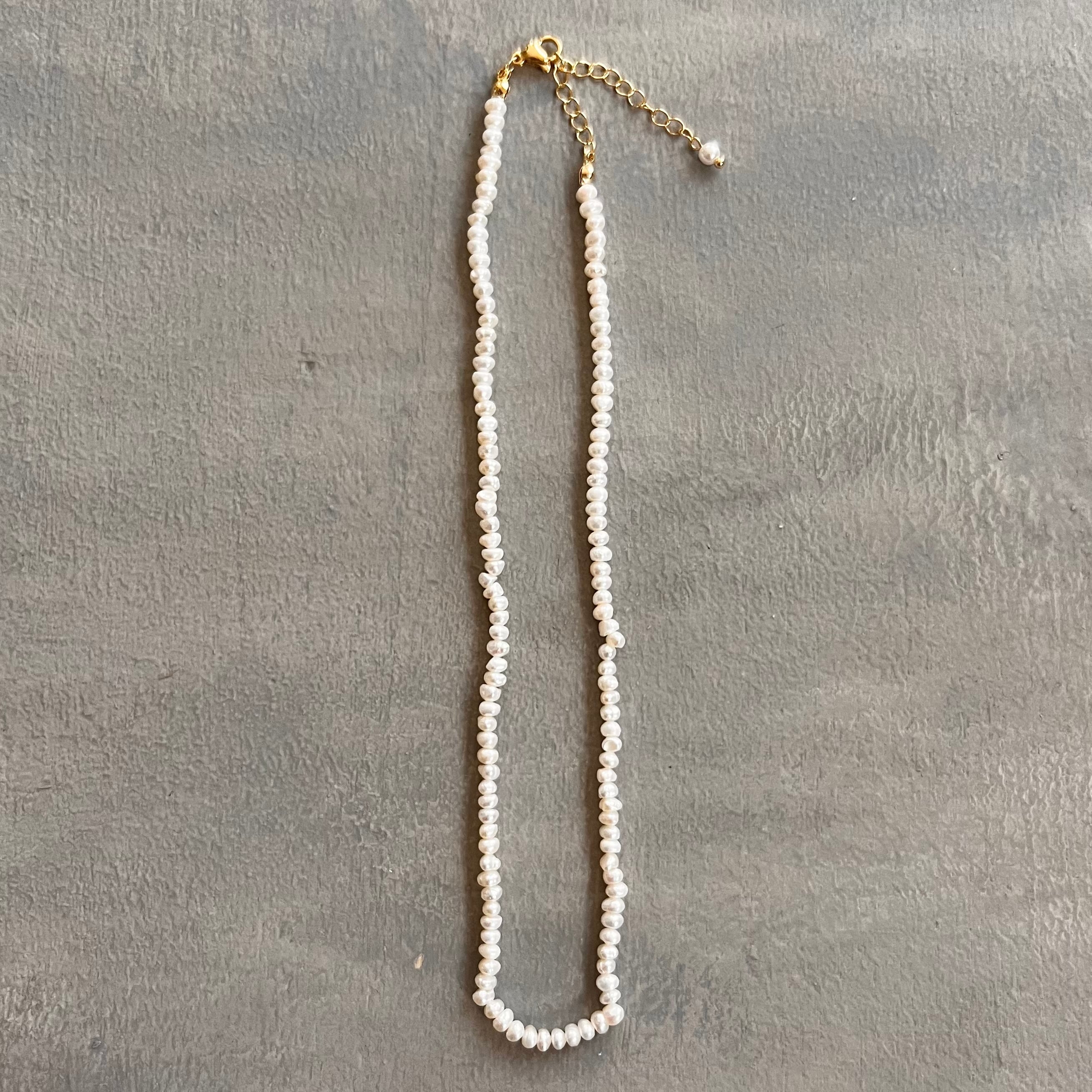 さりげなく華やかさを添える、約2から3ミリの天然淡水パールを使用したネックレス。