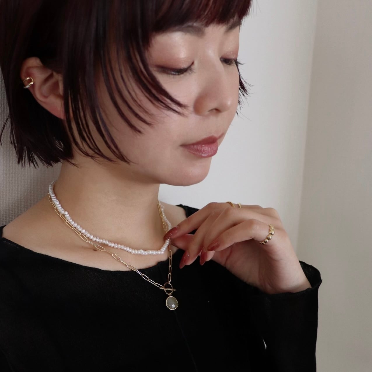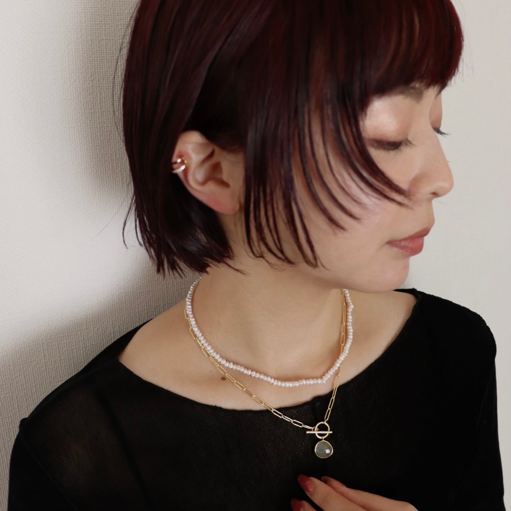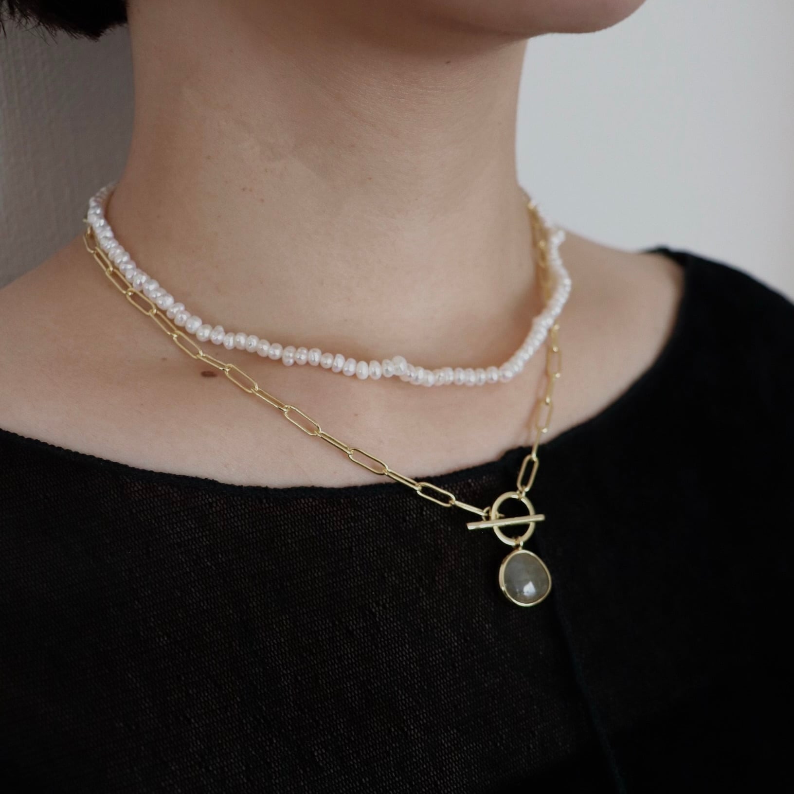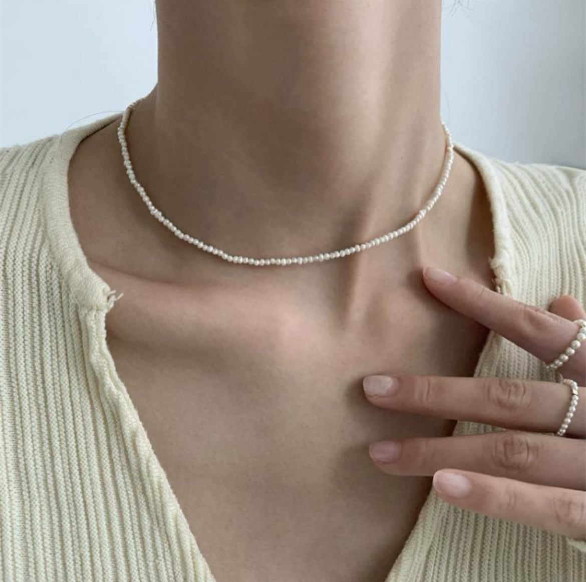 さりげなく華やかさを添える、約2から3ミリの天然淡水パールを使用したネックレス。