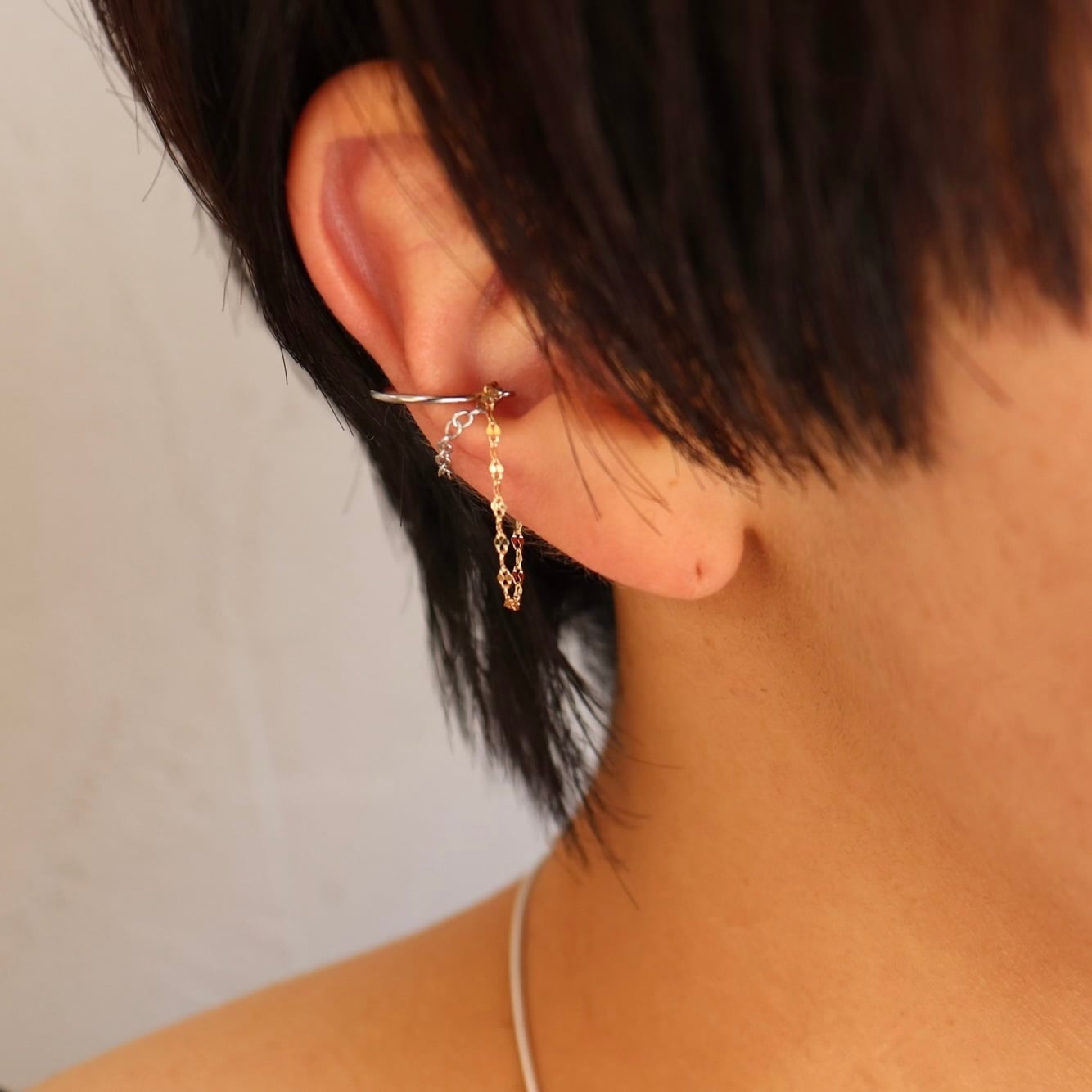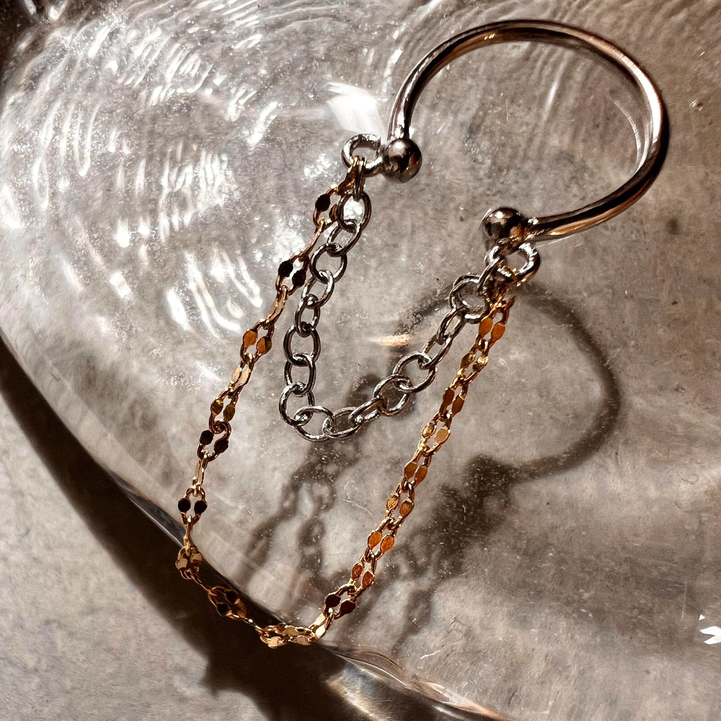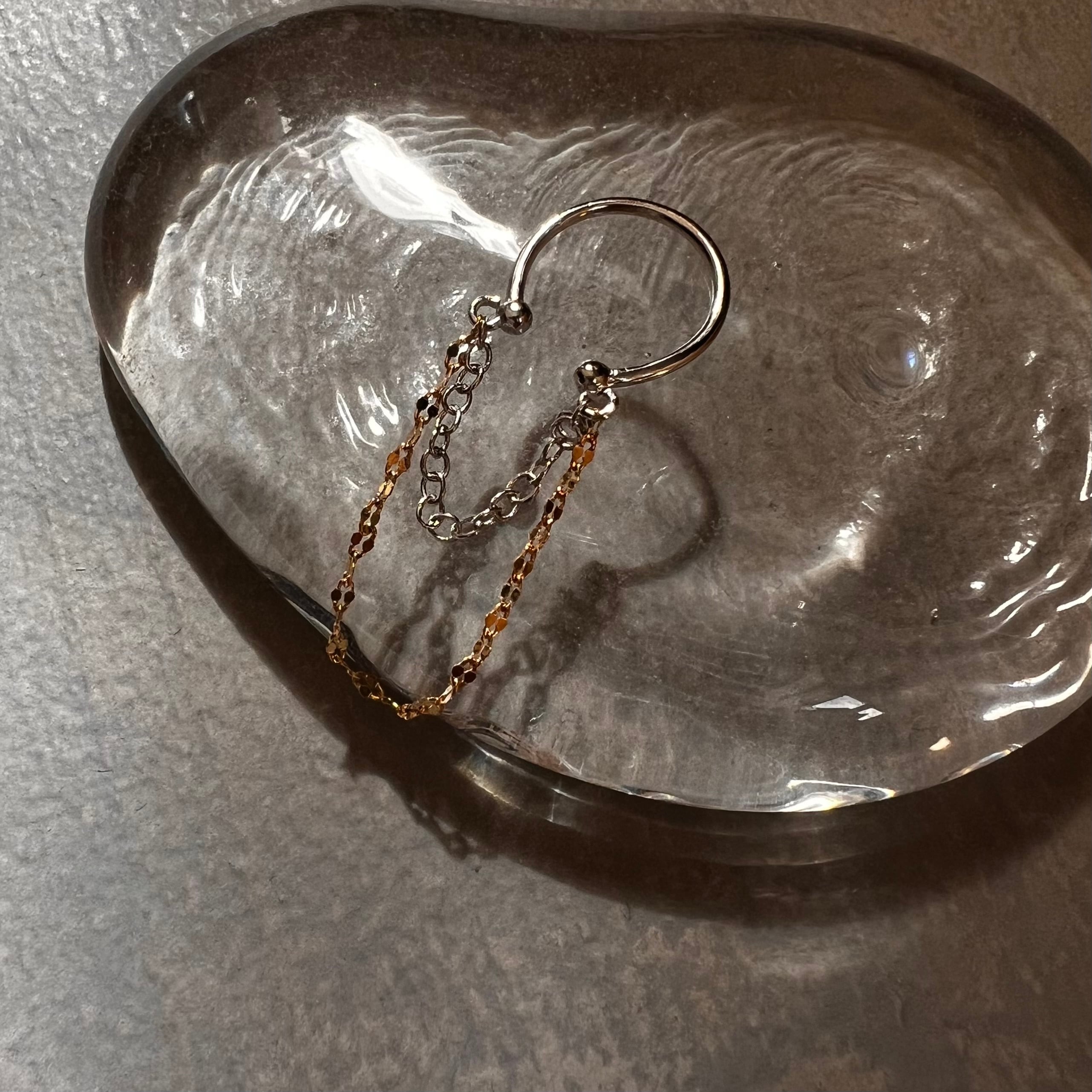 シンプルなリングに、シルバーとゴールドの2種類のチェーンを組み合わせた個性派イヤーカフ。