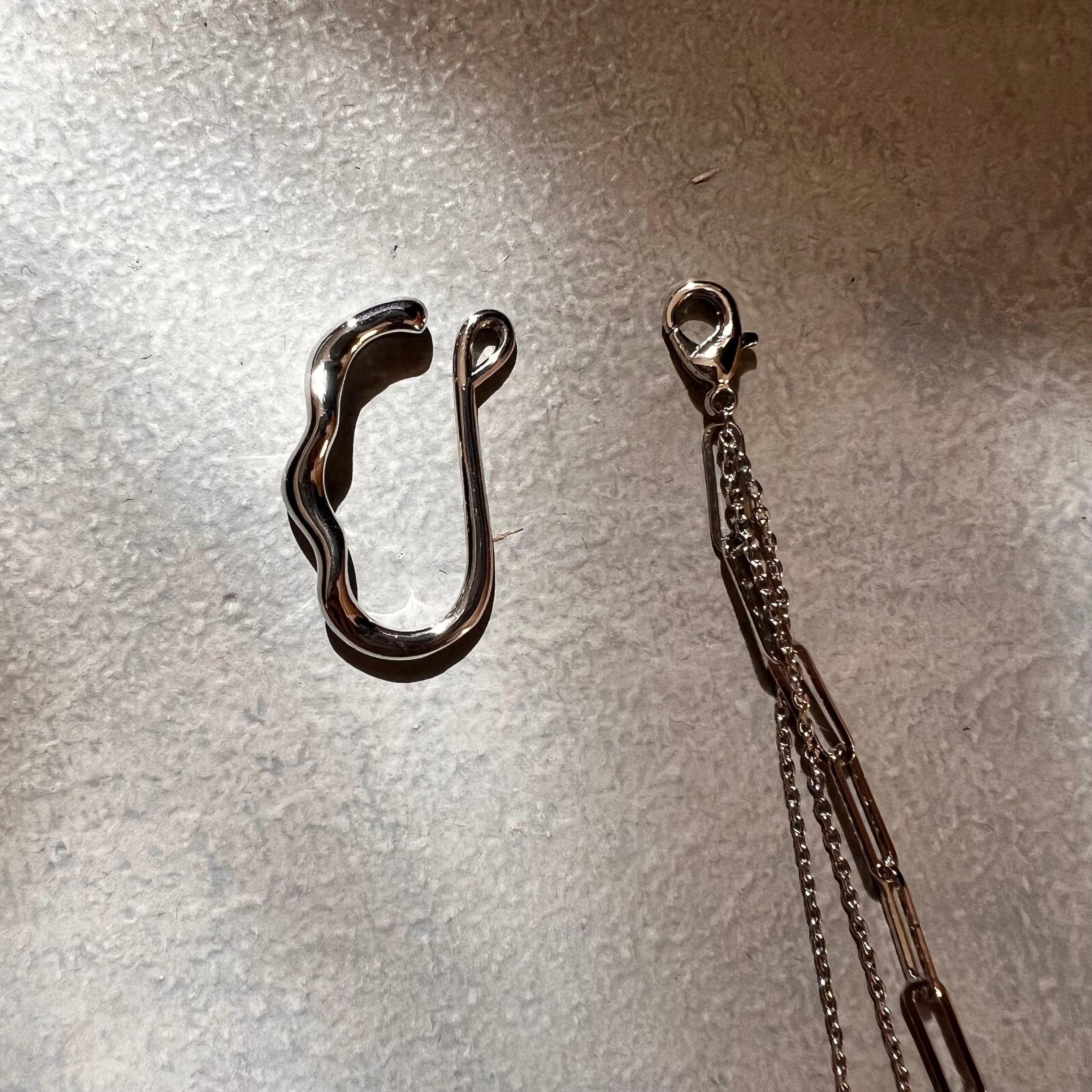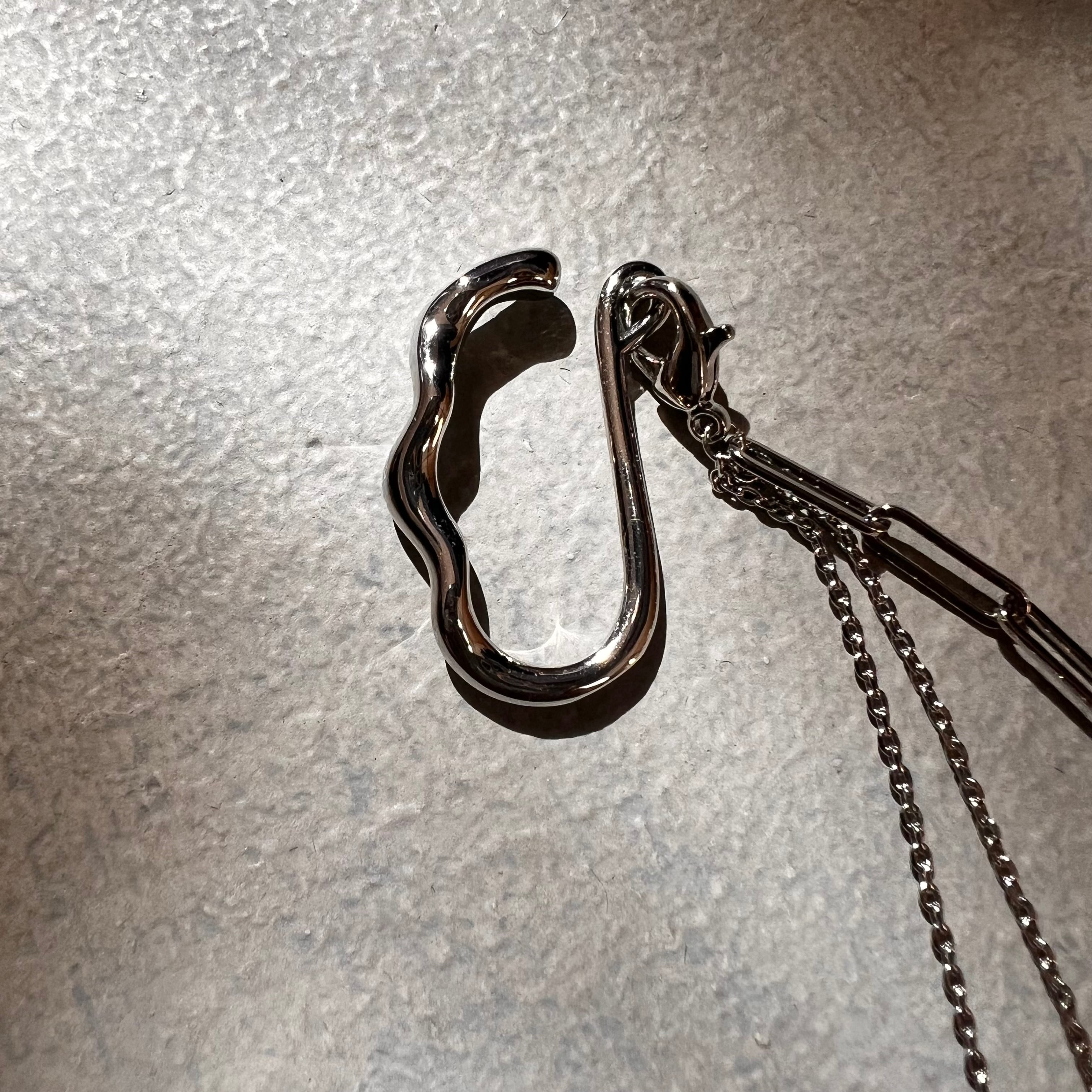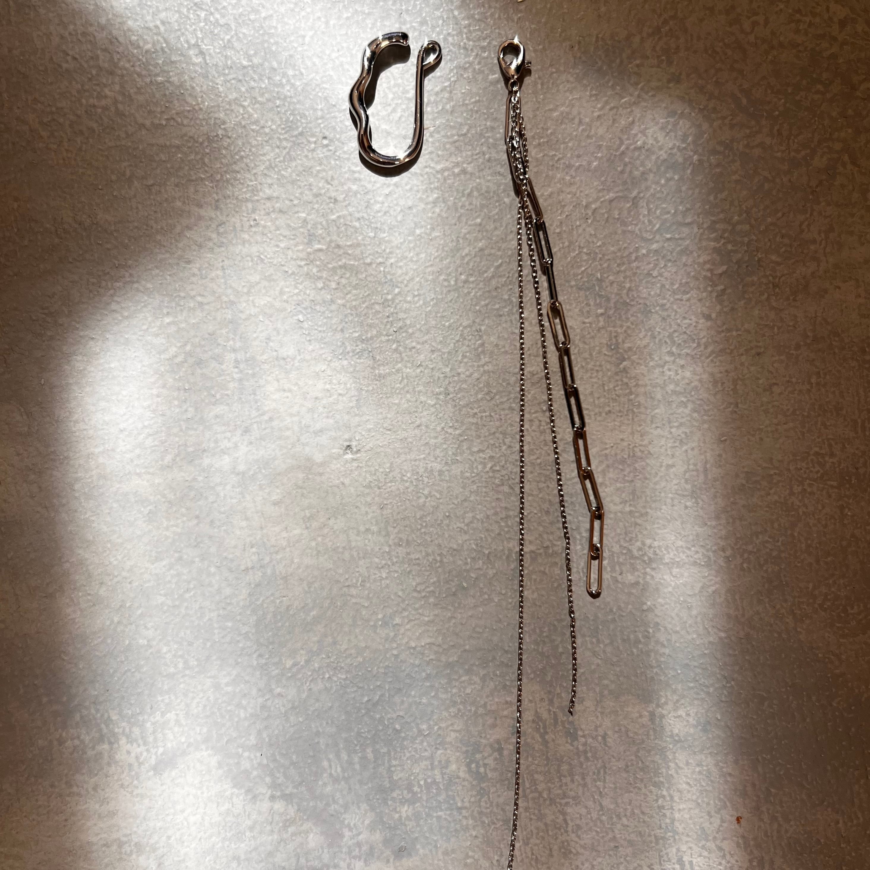 有機的なラインを描くモードなカフ部分と、しなやかに揺れるロングチェーンの組み合わせで、ひとつ着けるだけでスタイルが決まるアイテム。