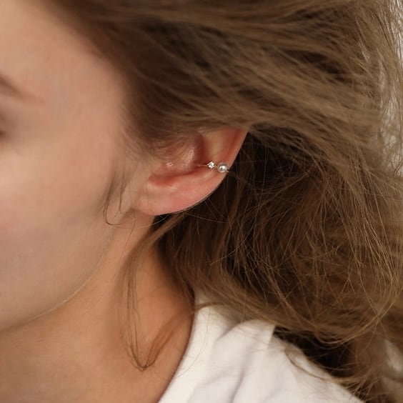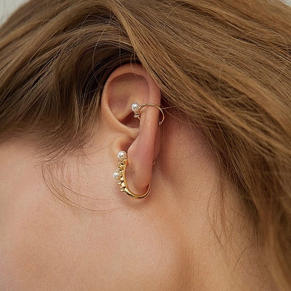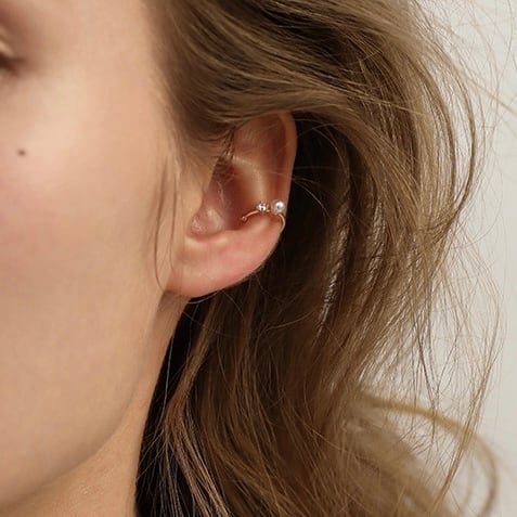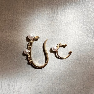 大小異なるサイズのイヤーカフを重ね付けすることで、耳元に立体感と華やかさをプラスします。