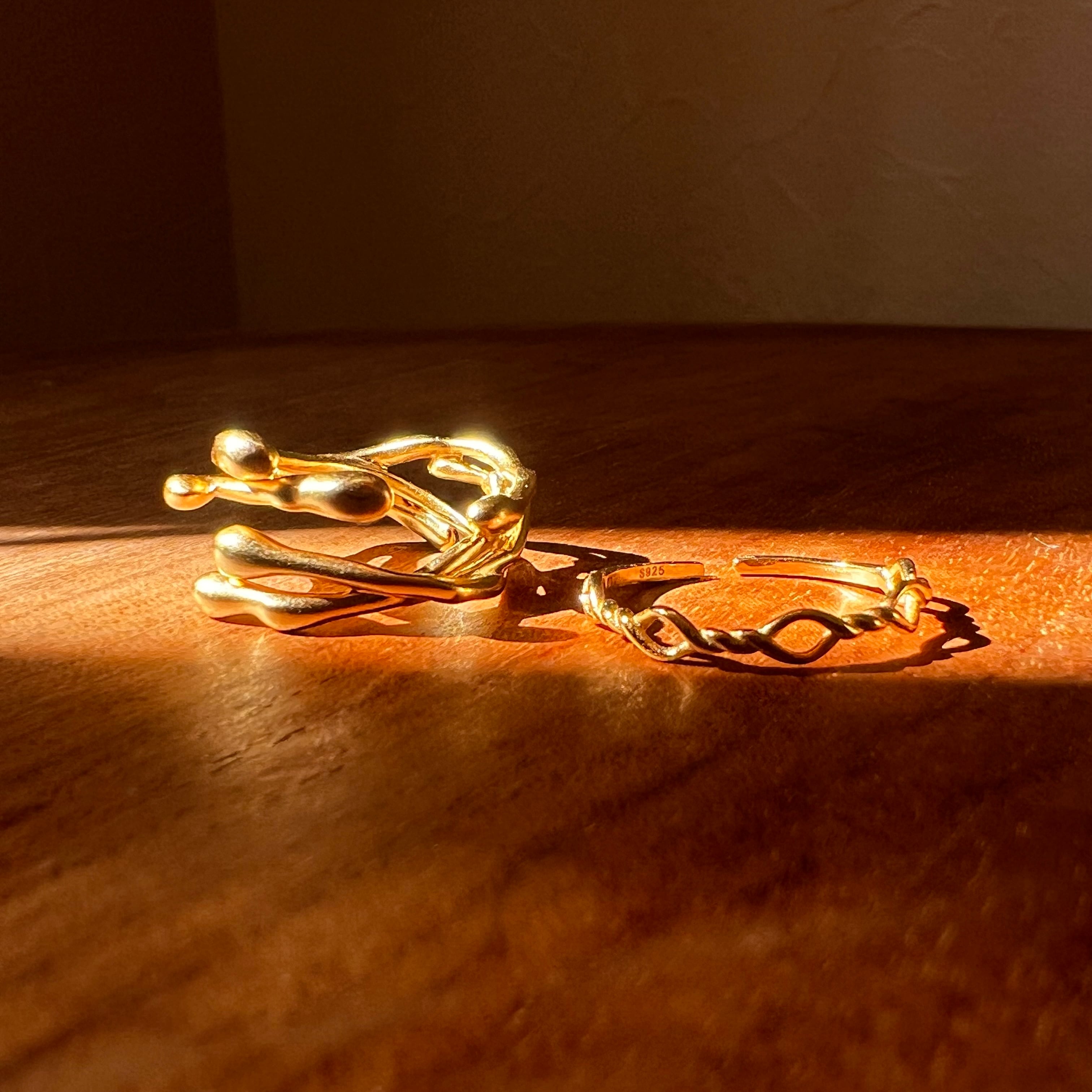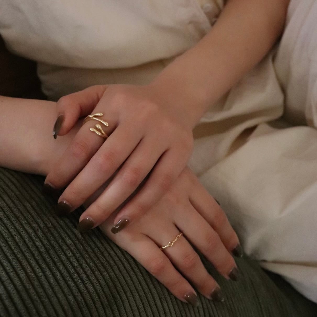 まるで自然の枝や水の滴を思わせる有機的なデザインは、指先に柔らかな表情を添えてくれます。