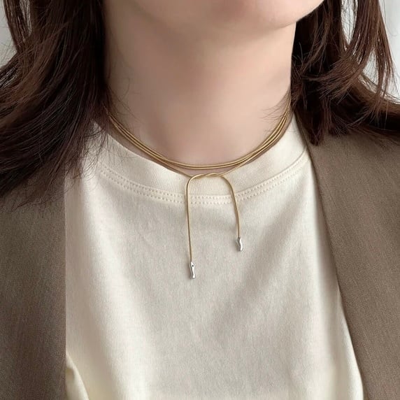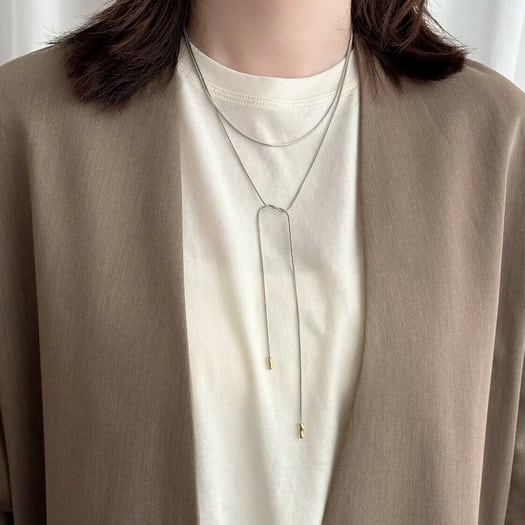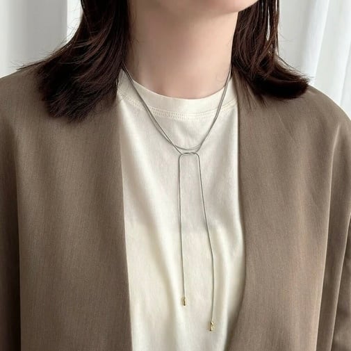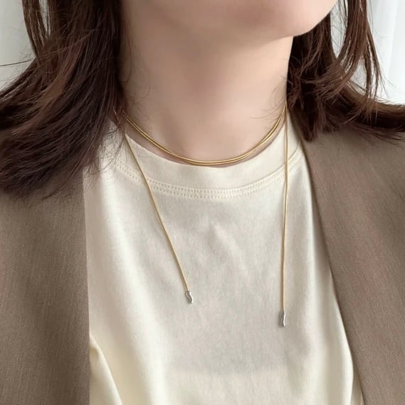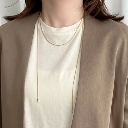 長さを自由に調節できるネックレスは、短めにしてチョーカー感覚で顔周りを引き締めたり、ロングスタイルで垂れるチェーンをアクセントにしたりと幅広いコーディネートに対応。