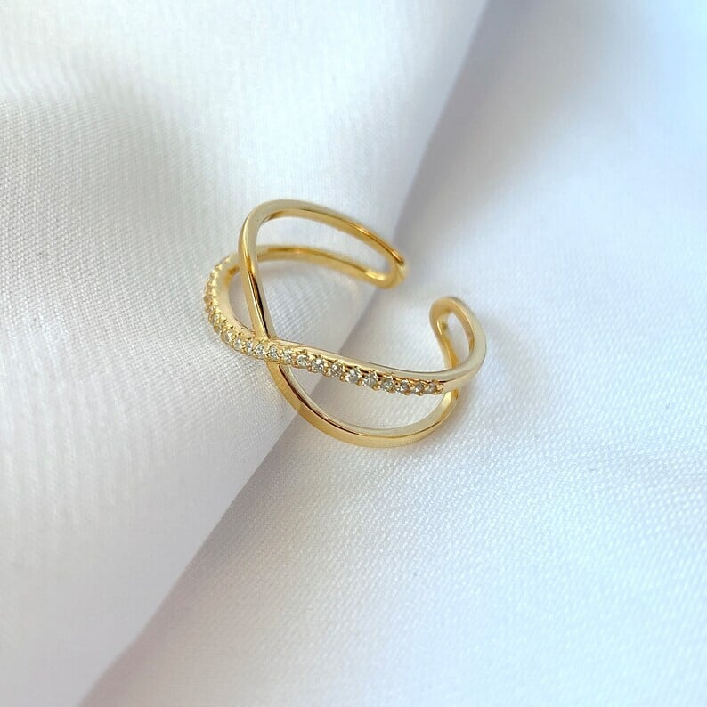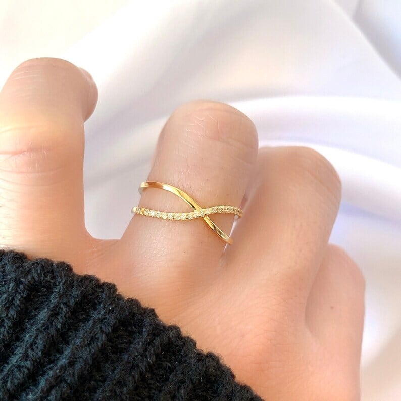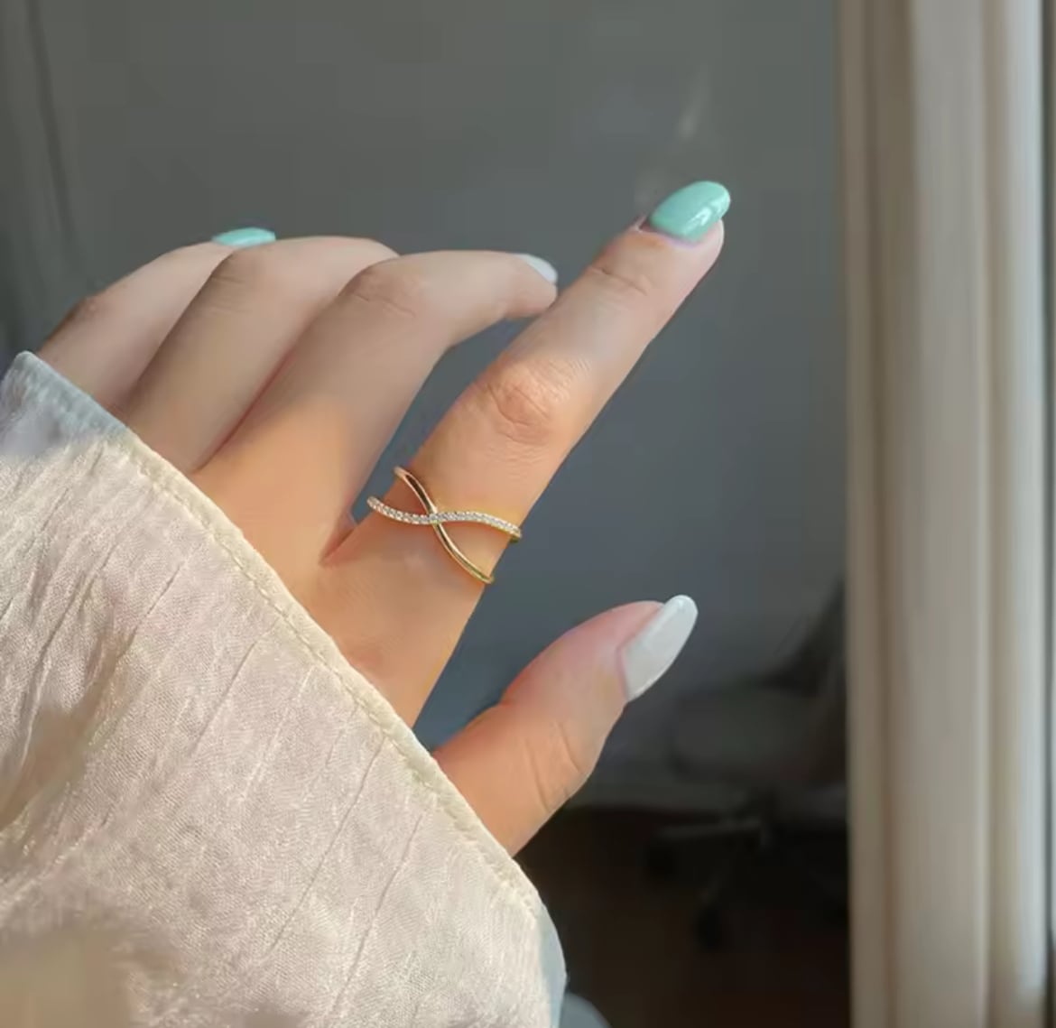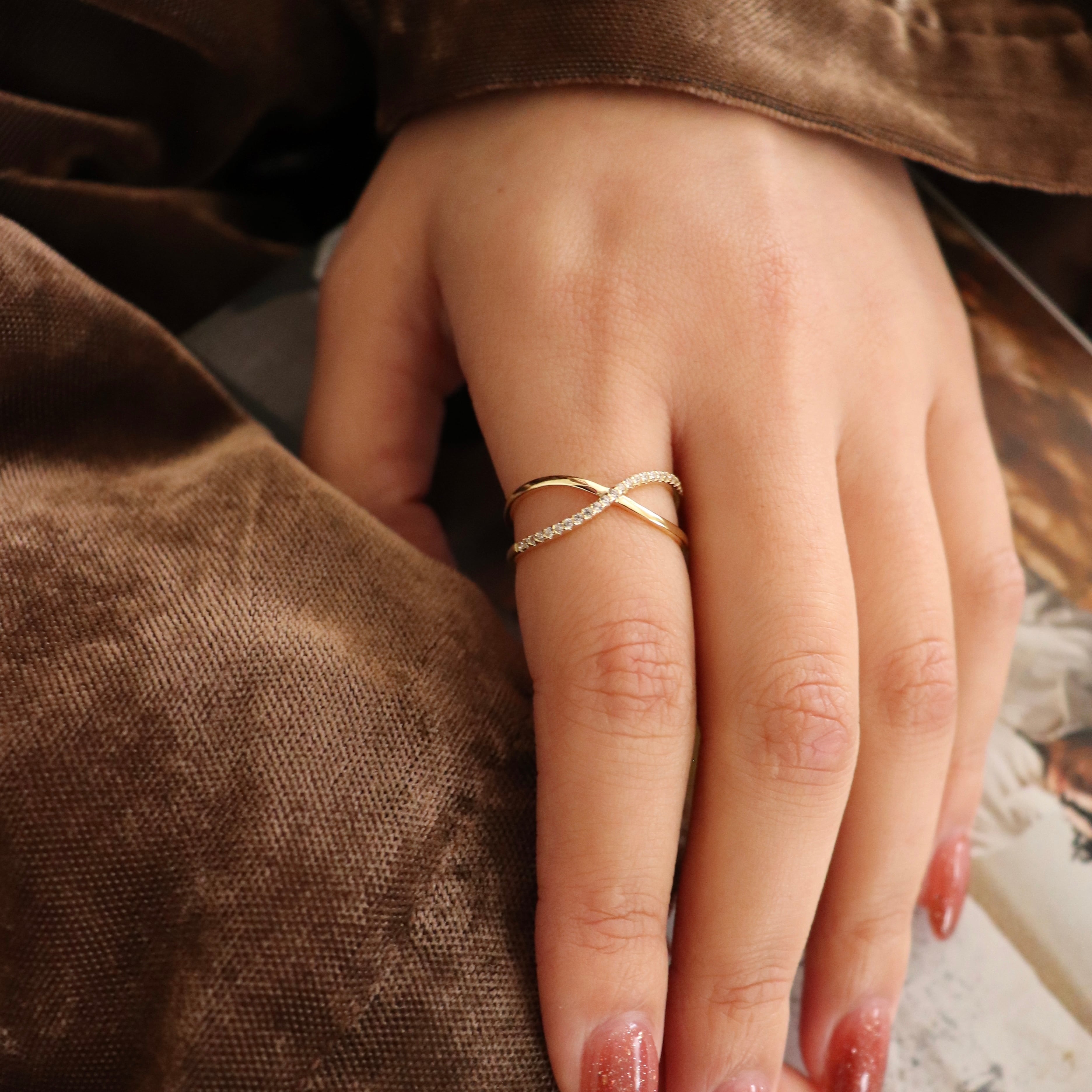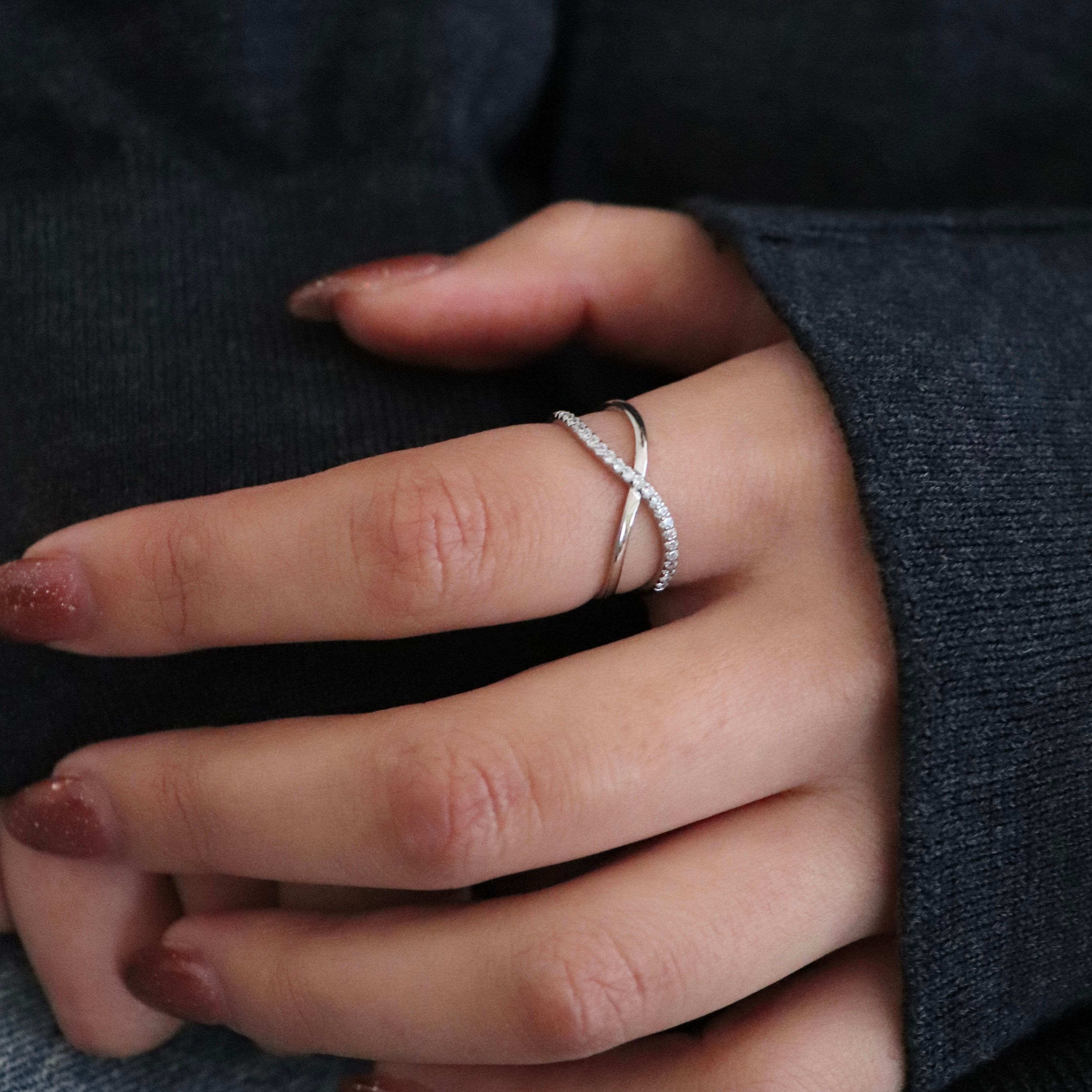 滑らかな地金のラインと、きらめくジルコニアを並べたラインが交わることで、光の角度によって異なる表情を見せます。