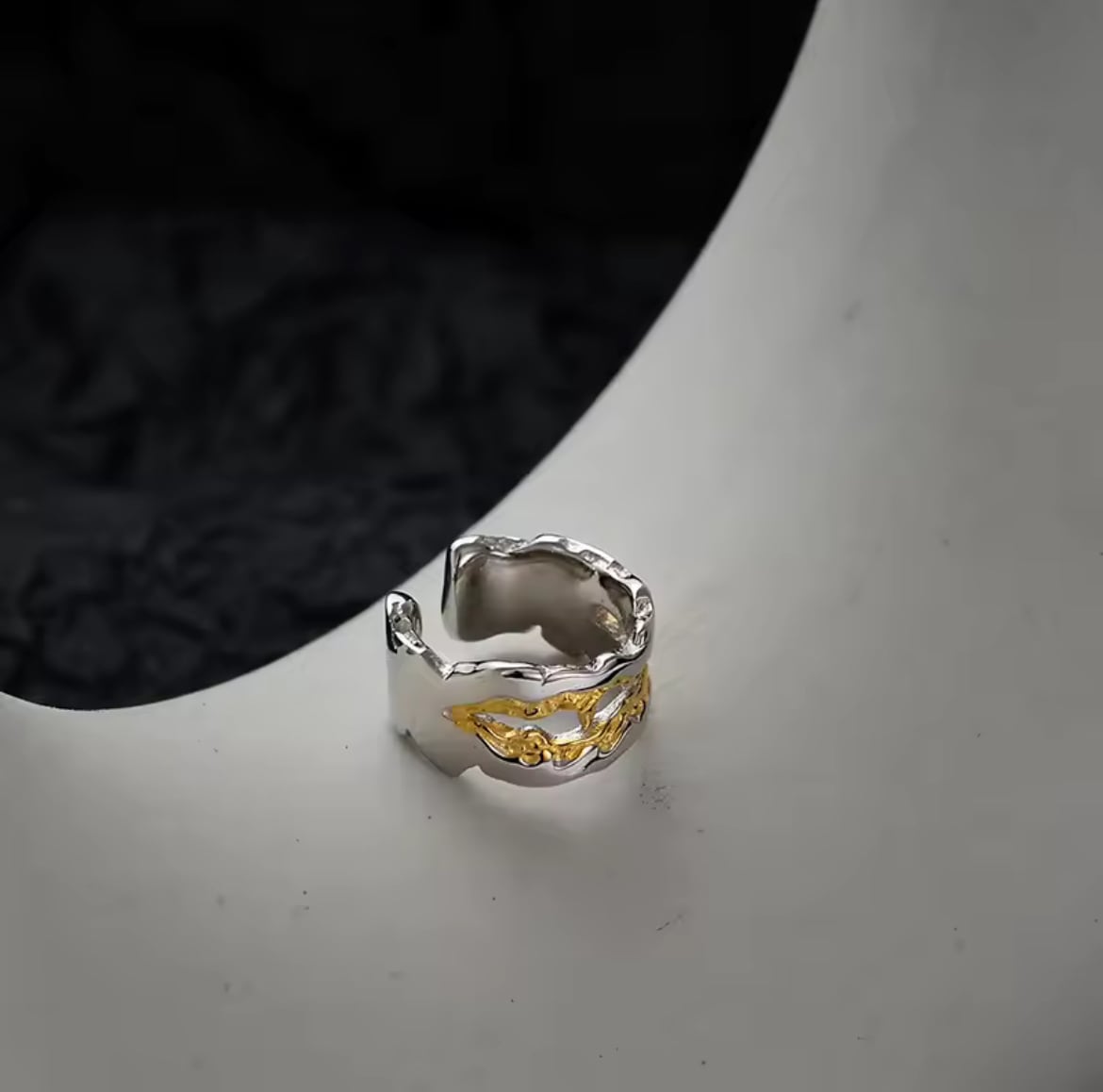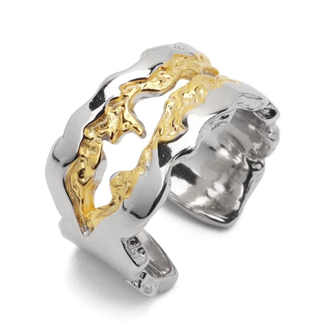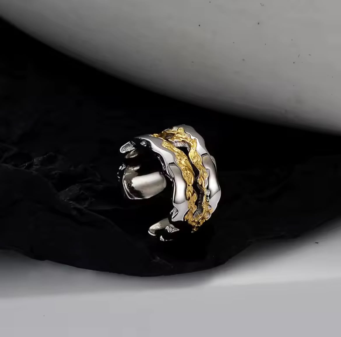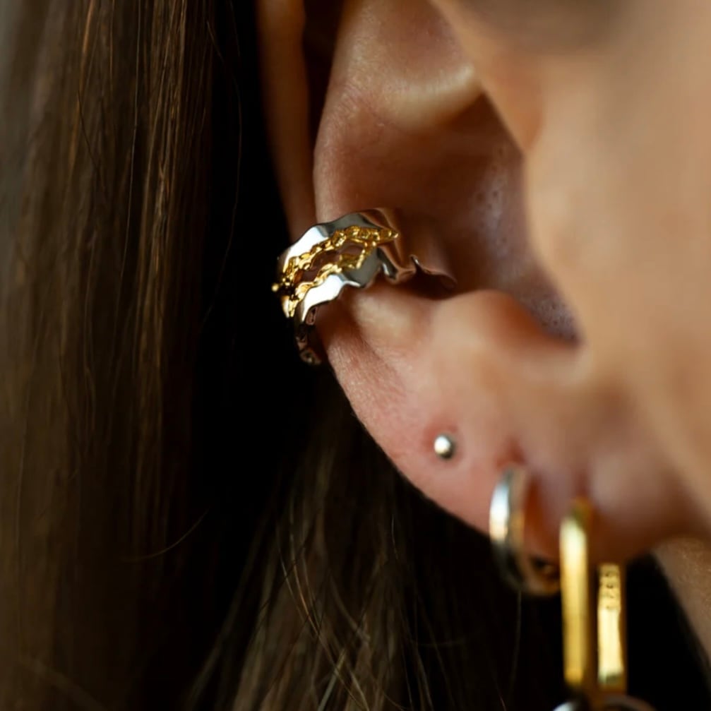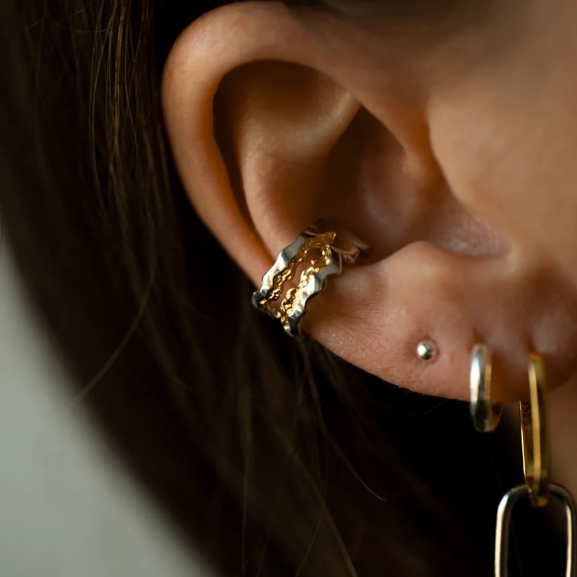 柔らかく波打つゴールドのラインが、シルバーの質感と重なり合い、自然の流れを感じさせるデザインイヤーカフ。