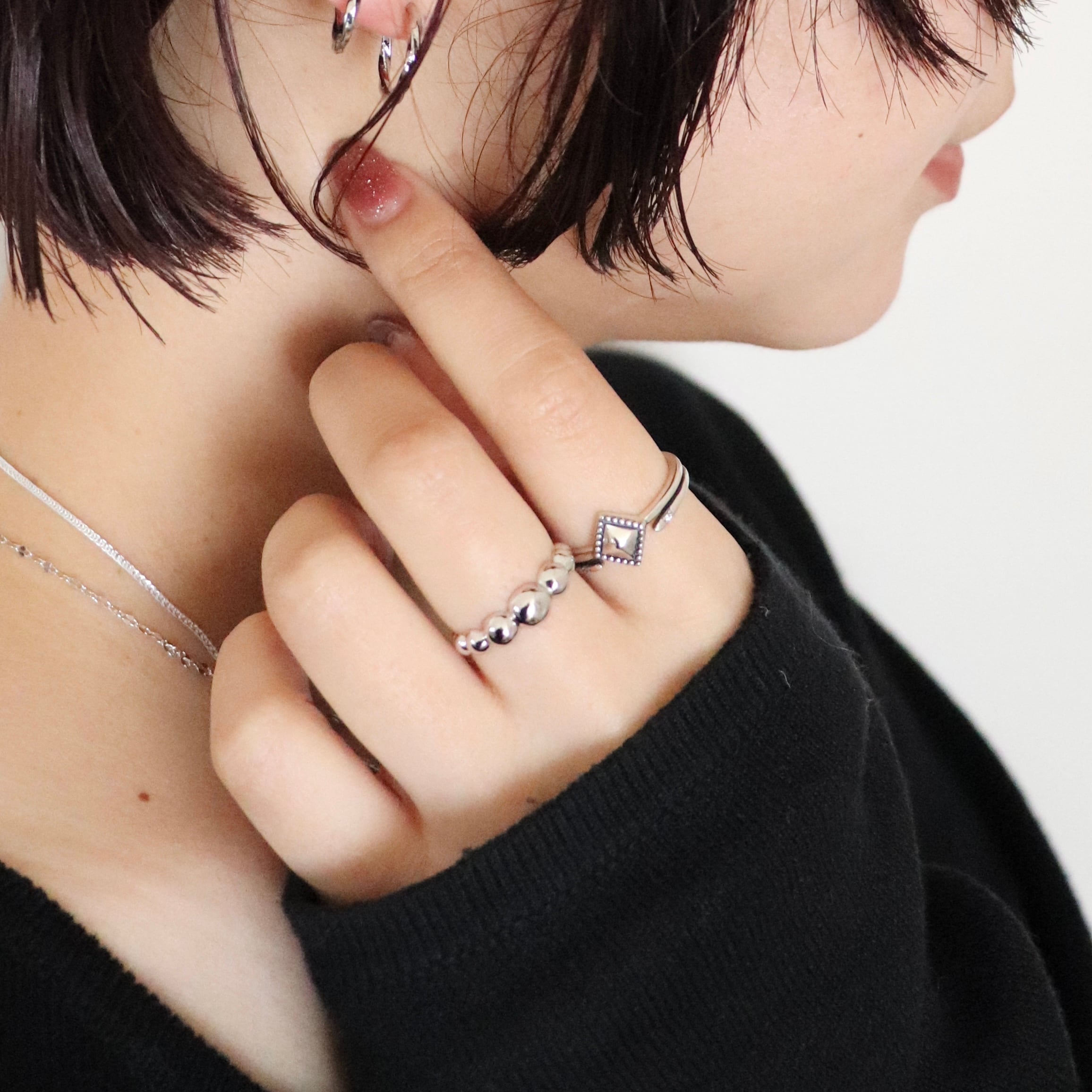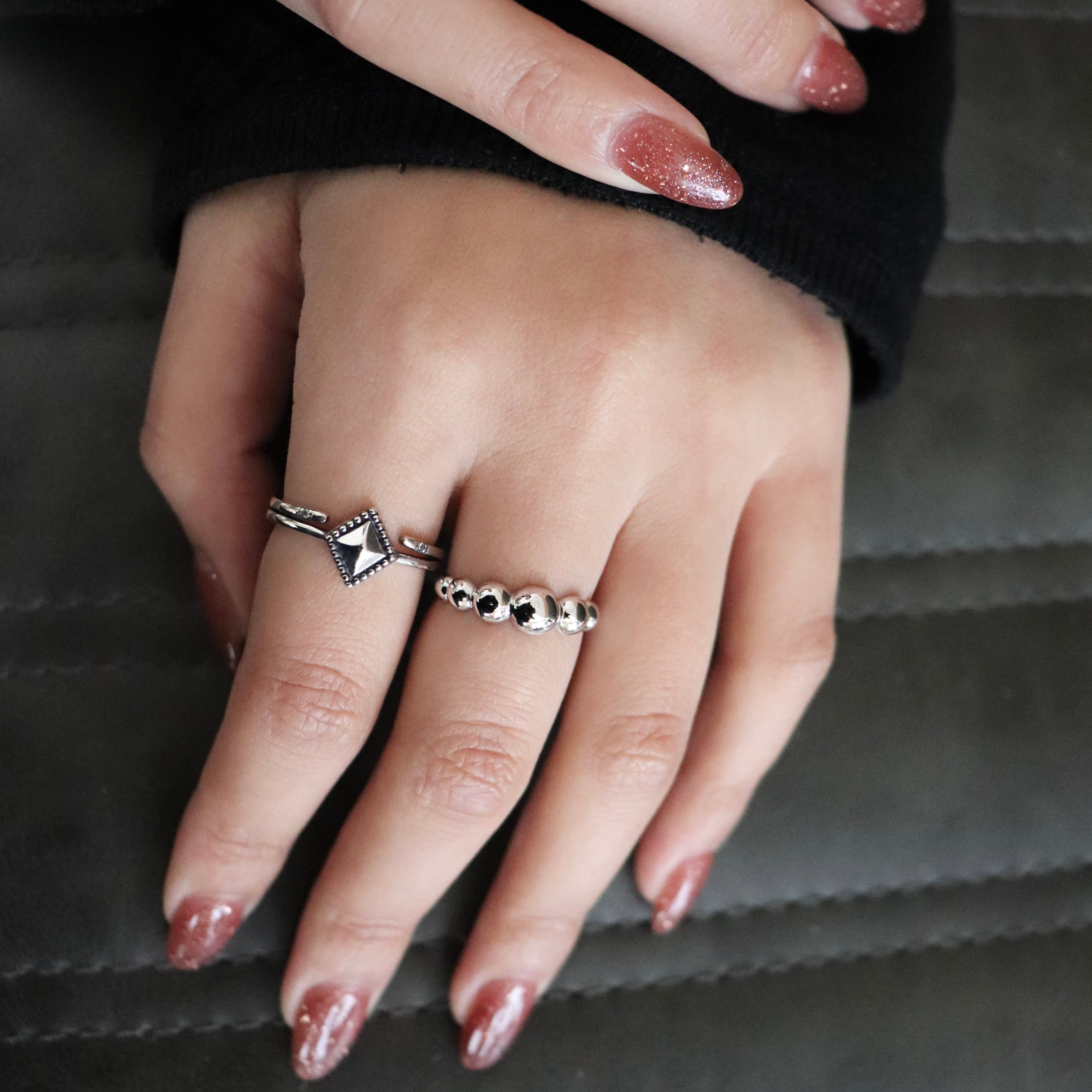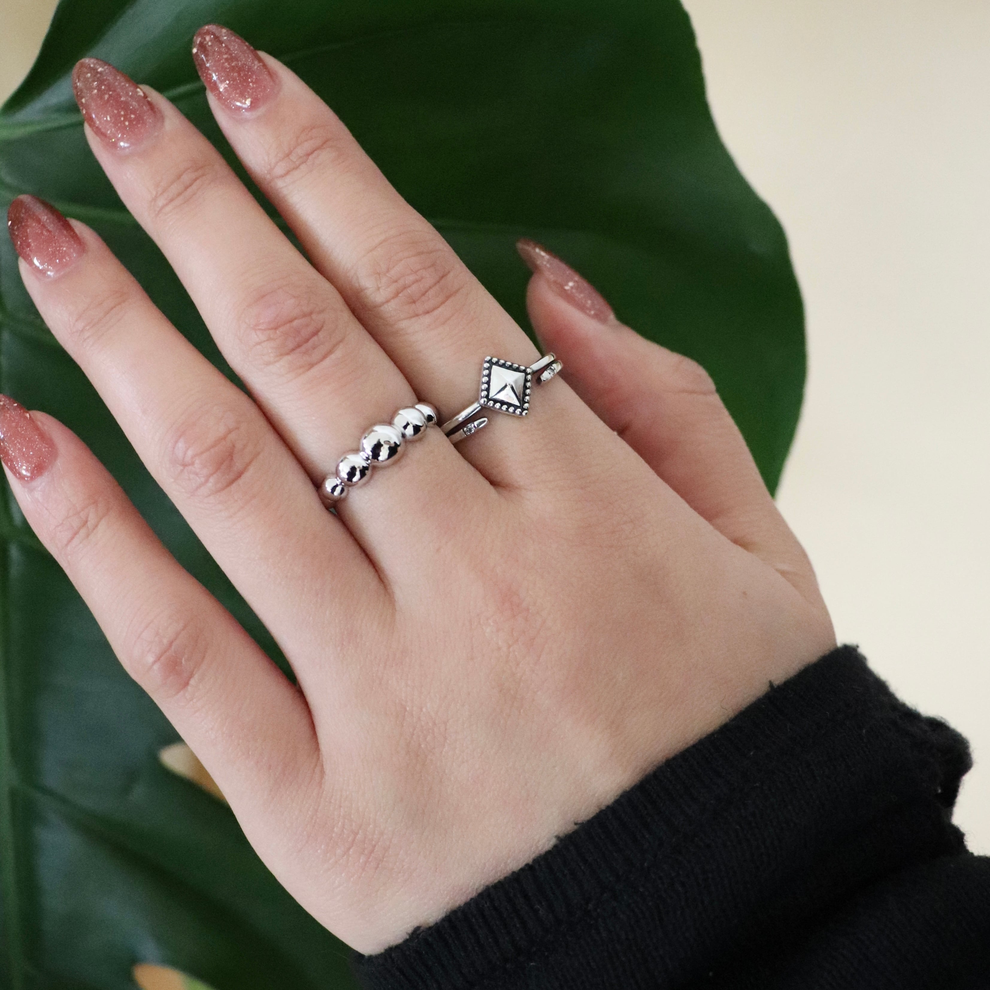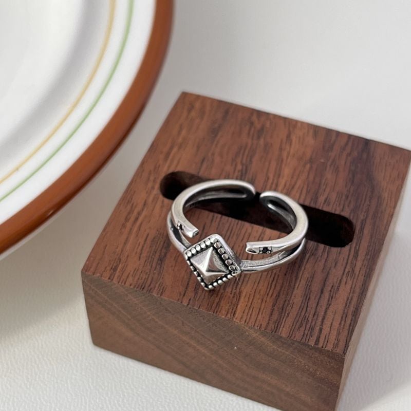 スタッズのように立体的なスクエアモチーフを中心に、両端には小粒のジルコニアがさりげなく光るエッジィなデザインリング。