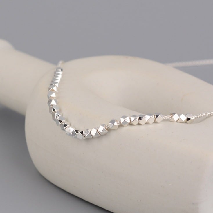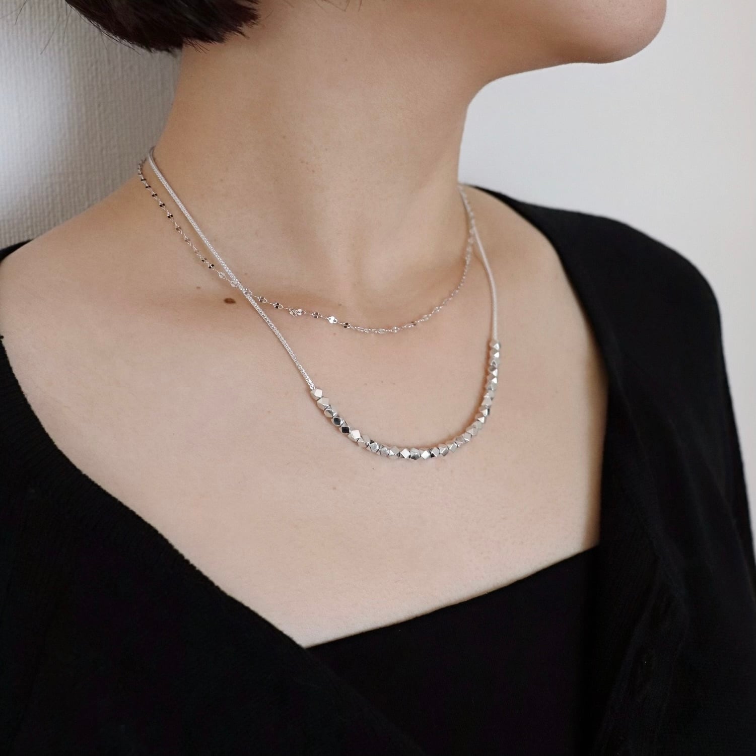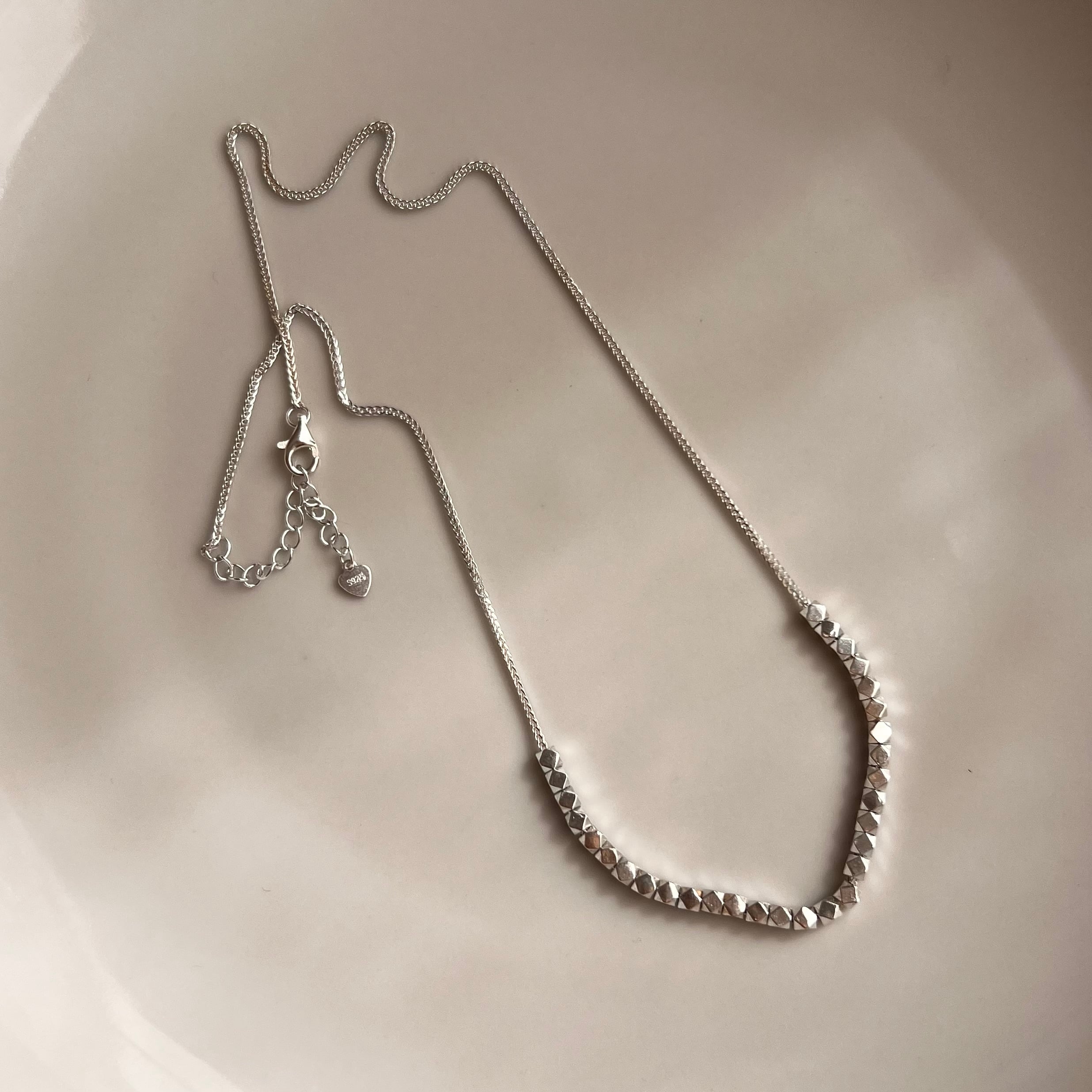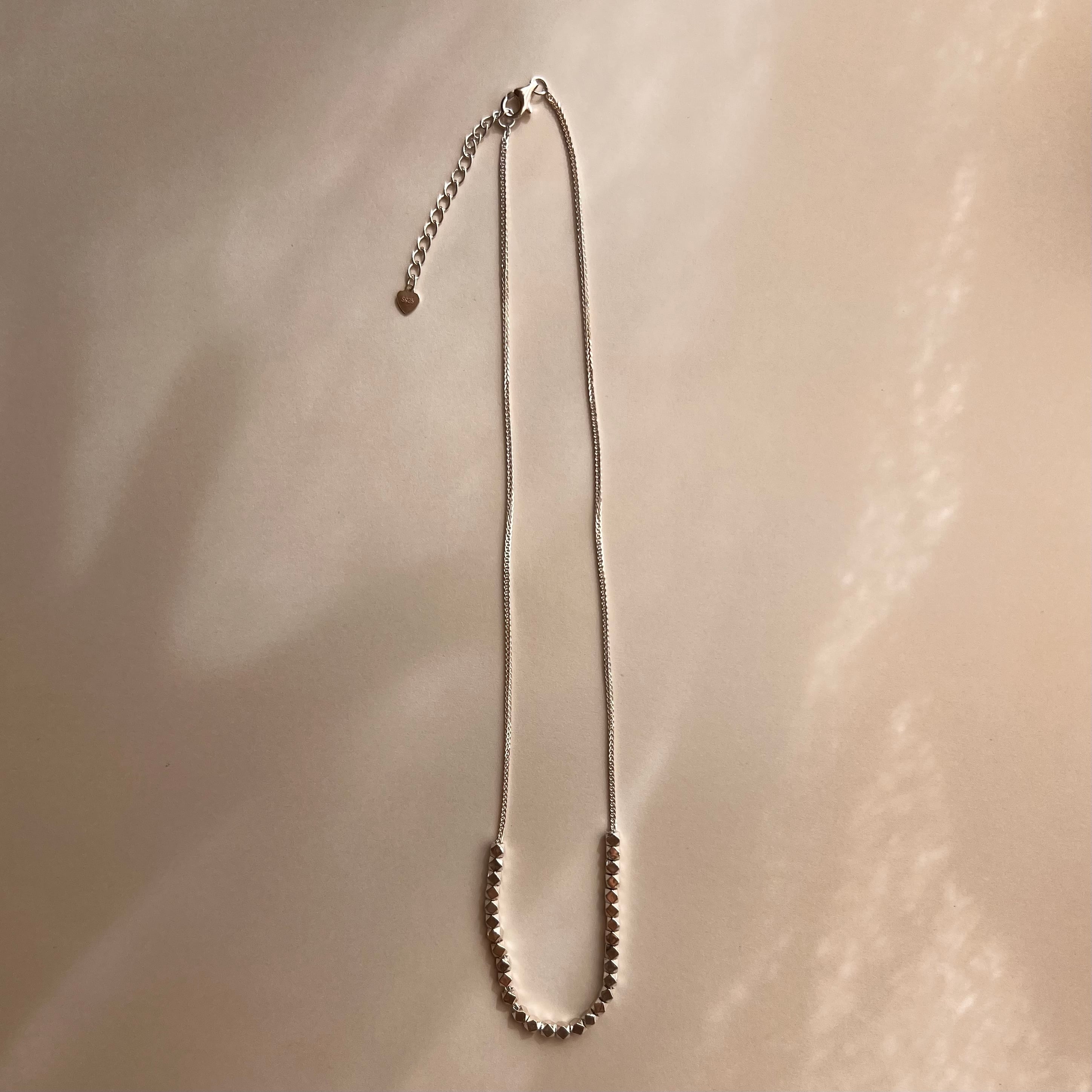 細やかなカットが施されたシルバービーズが、光を受けて繊細に瞬くスタッズチェーンネックレス。