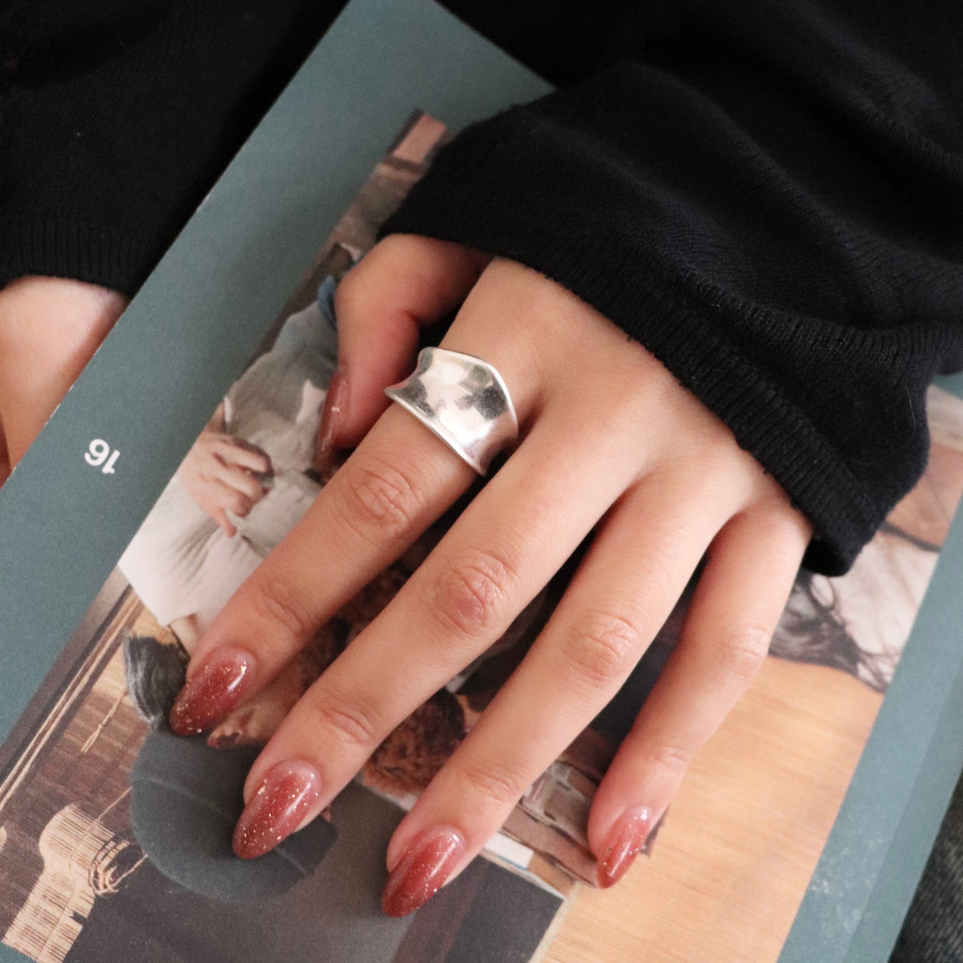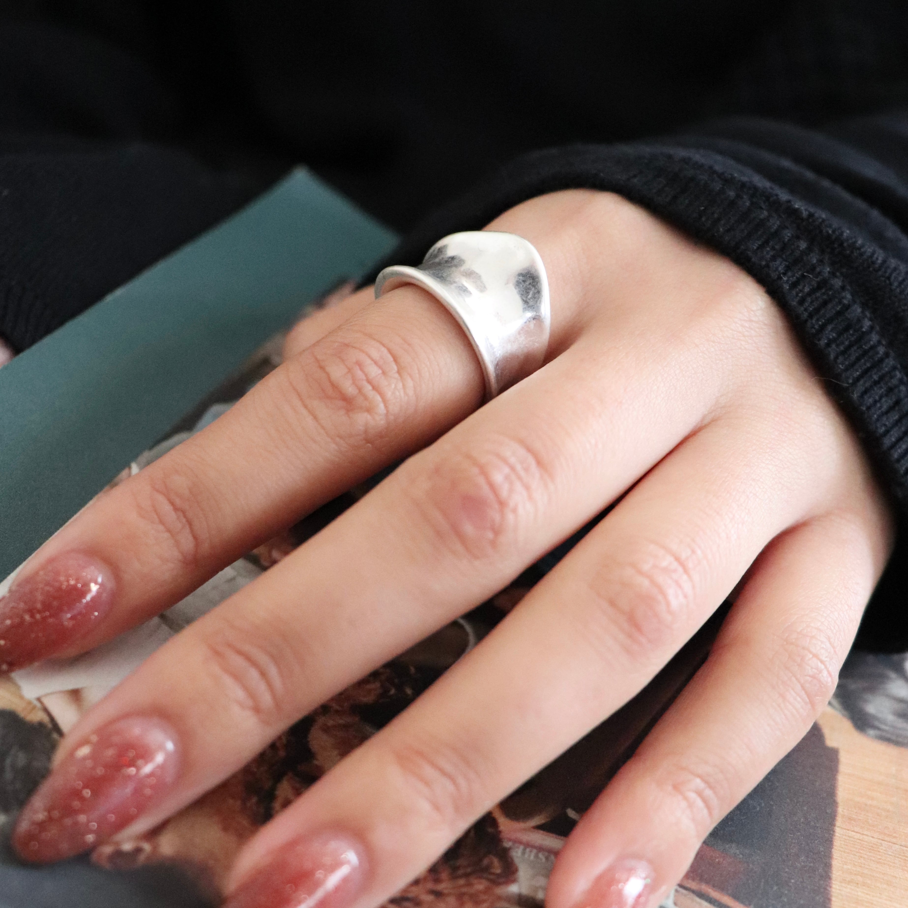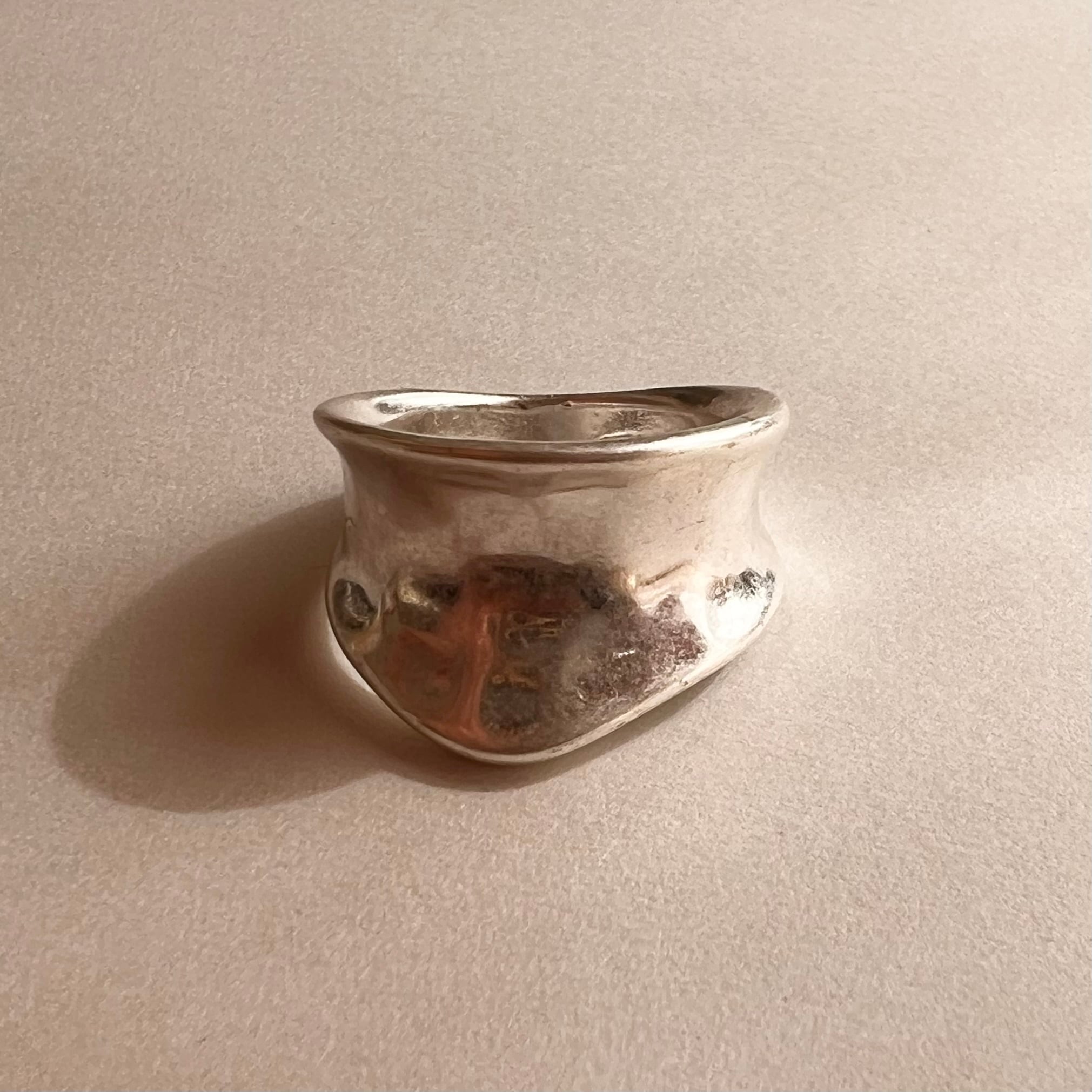 はっと目をひくシルバーの重厚さ、メルトリングの名の通り金属が溶け出すようなやわらかな曲面がデザイン。大ぶりなサイズ感でありながらたおやかな印象をあたえてくれます。