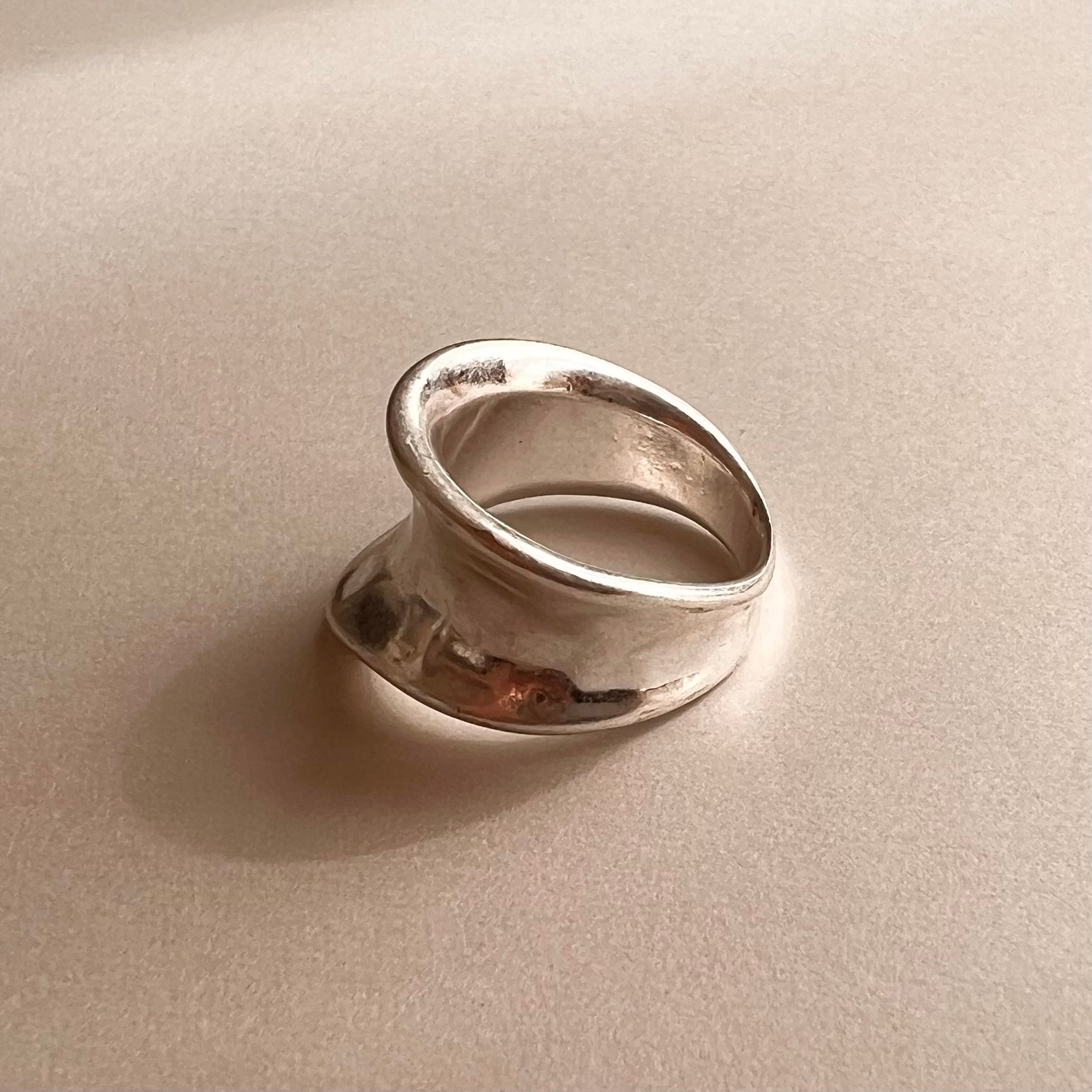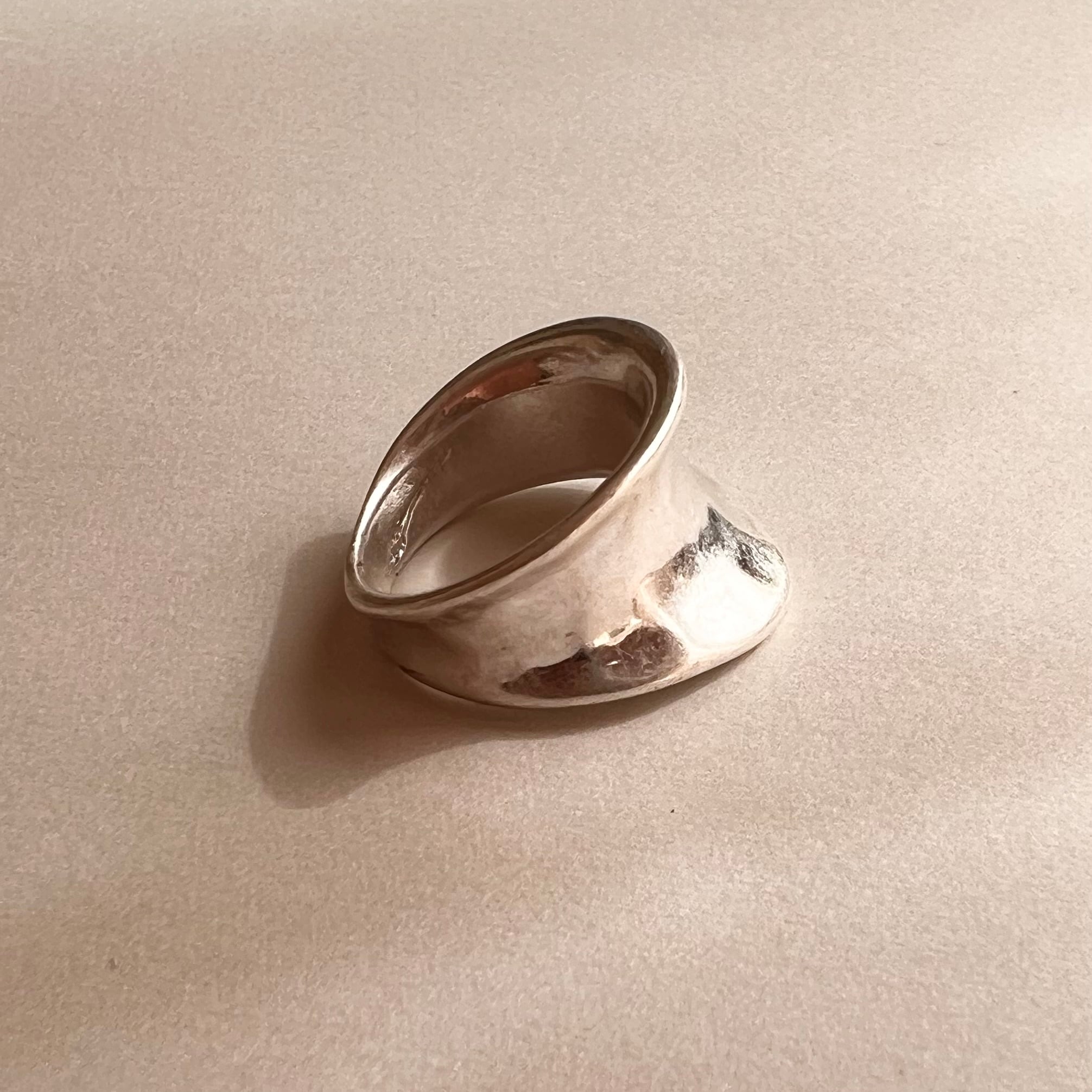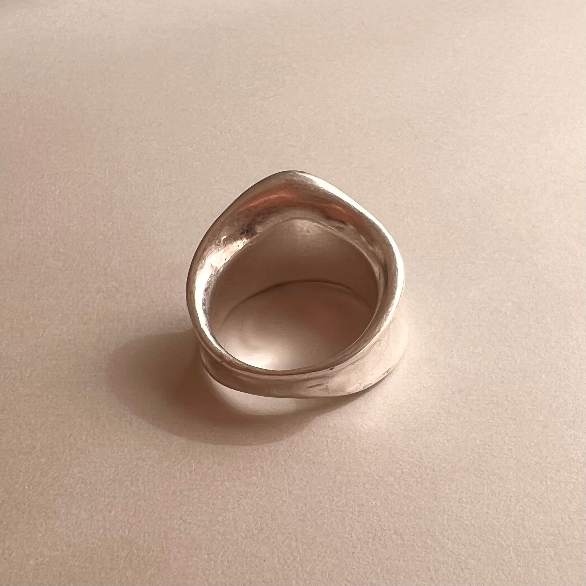 はっと目をひくシルバーの重厚さ、メルトリングの名の通り金属が溶け出すようなやわらかな曲面がデザイン。大ぶりなサイズ感でありながらたおやかな印象をあたえてくれます。