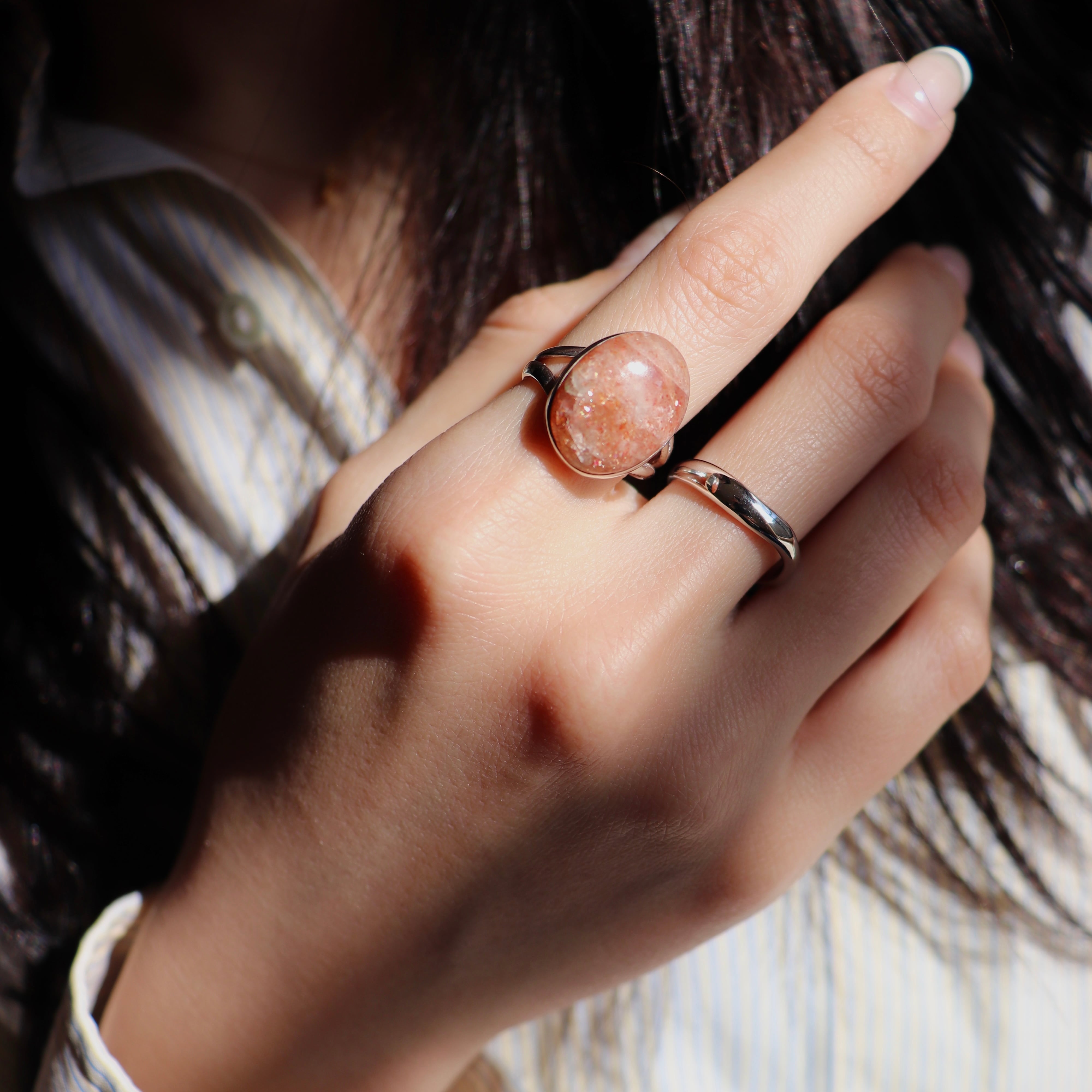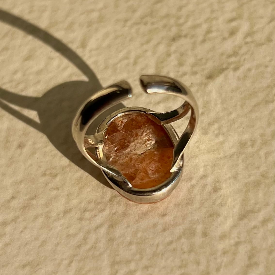 内側から光を宿したような輝きが美しい、サンストーンを主役に仕立てた一点物リング。