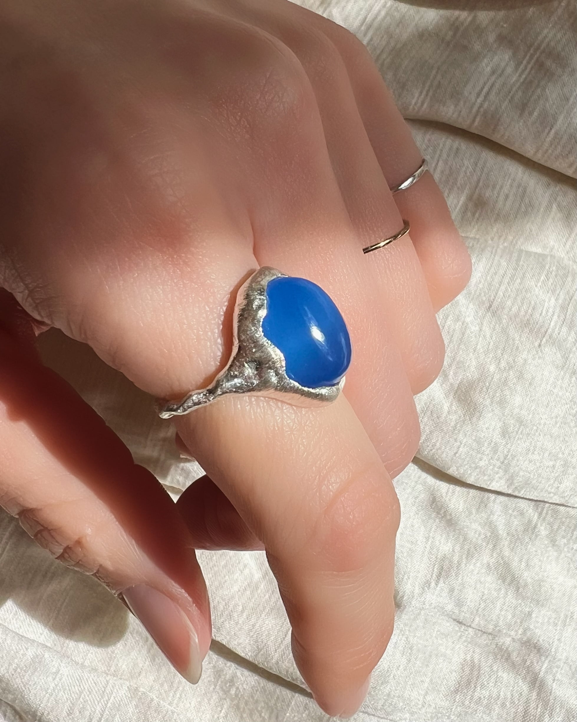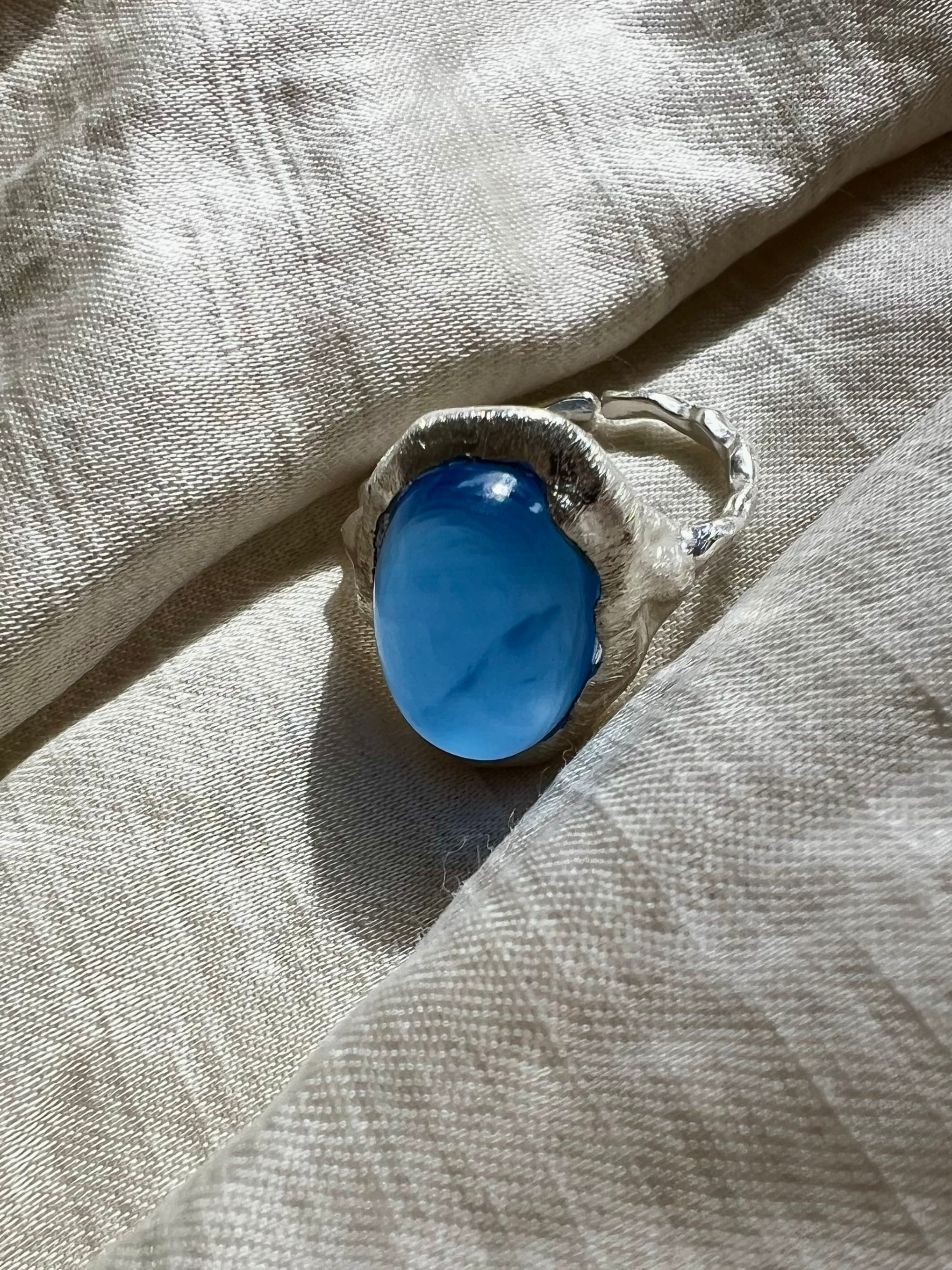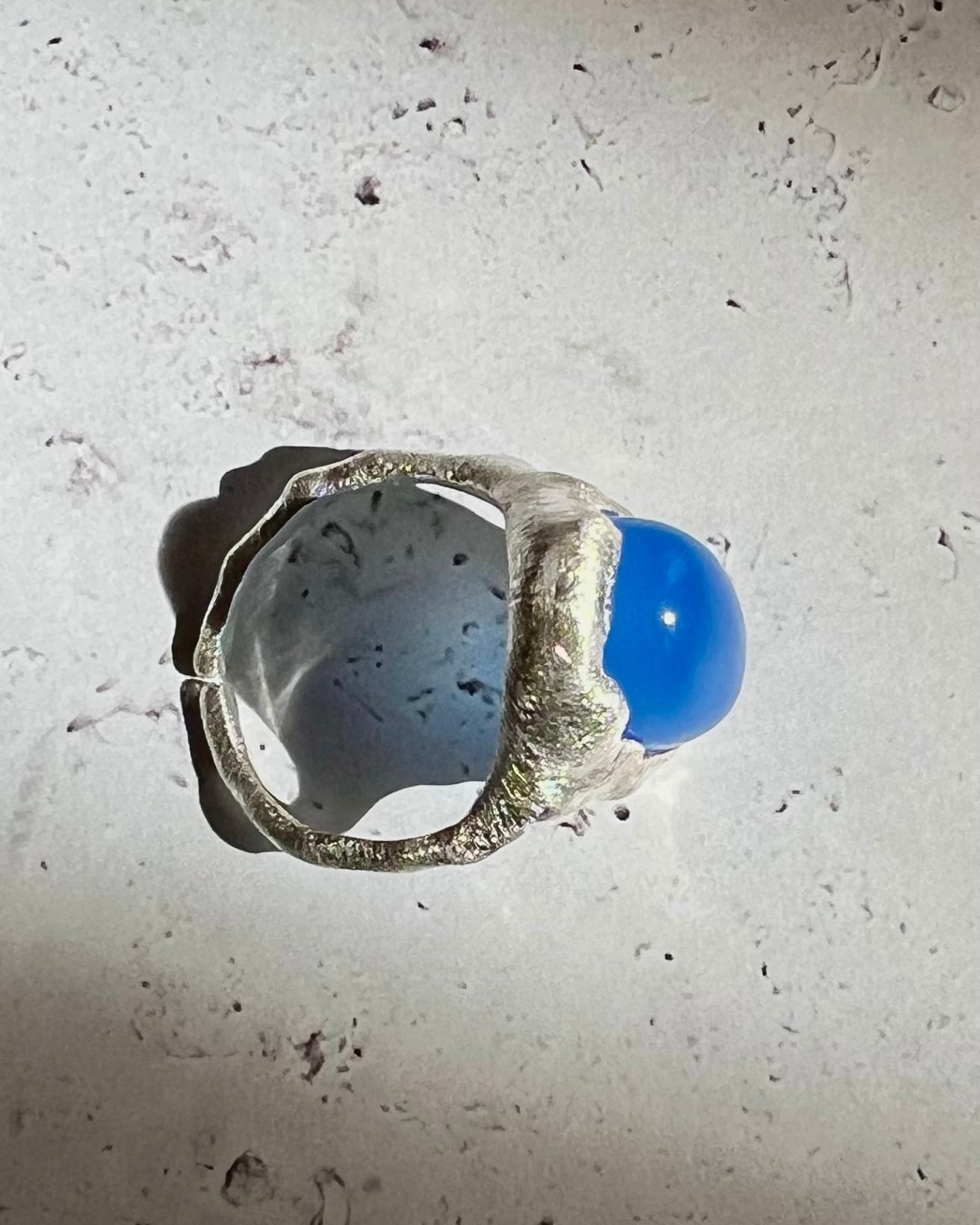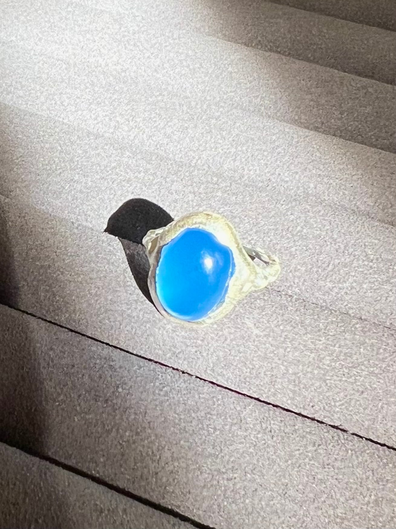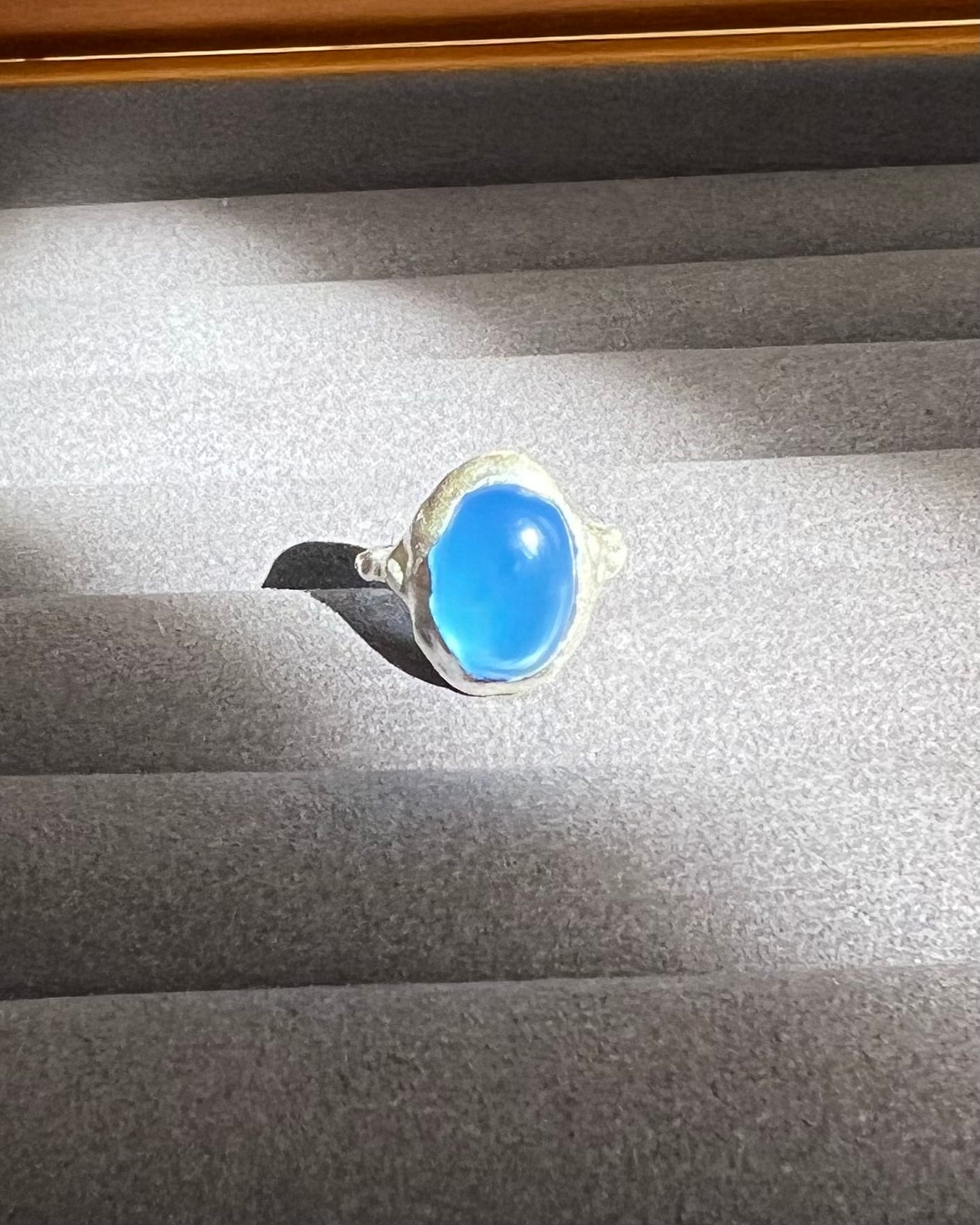 やわらかなブルーの半透明の輝きが美しいブルーカルセドニーを主役に仕立てたリング。
