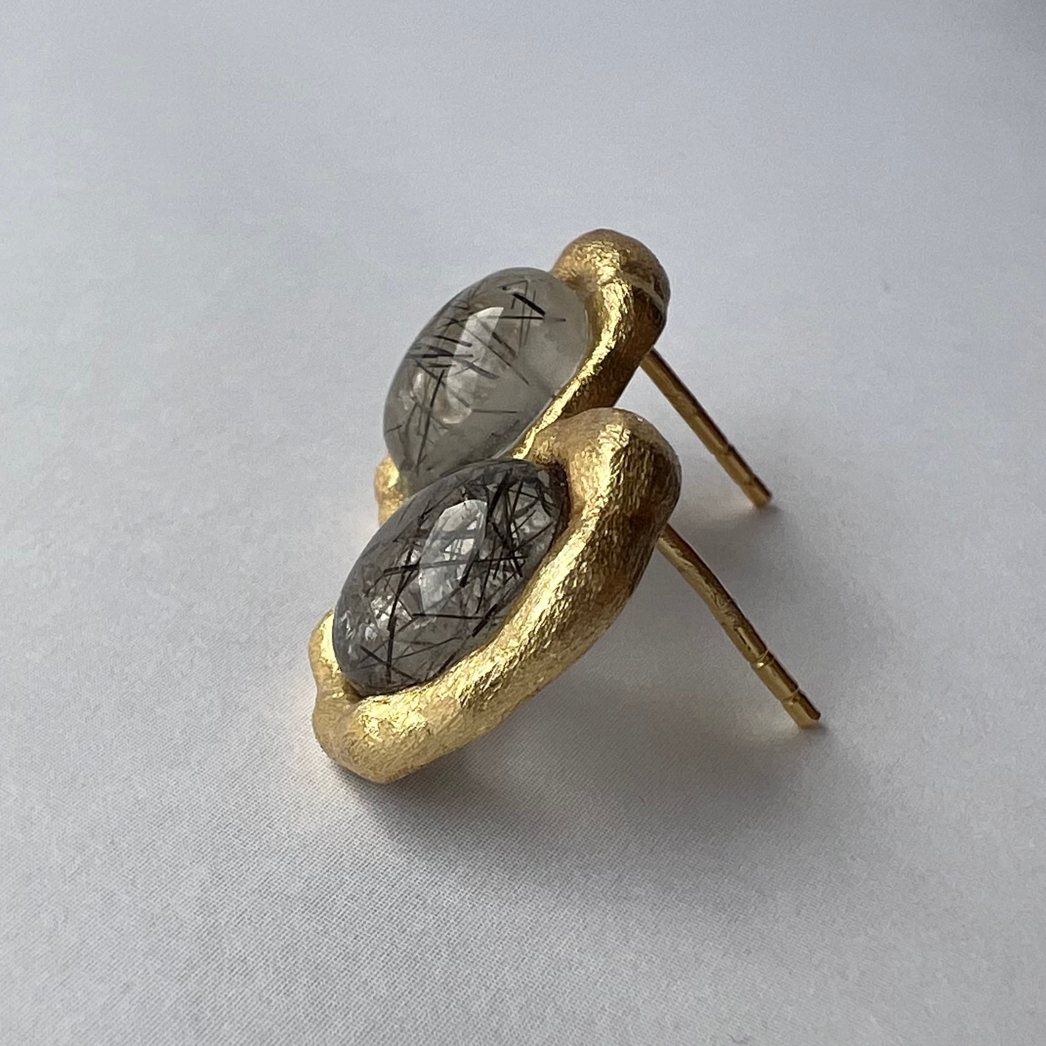 繊細なブラックの針状インクルージョンが印象的な、ブラックルチルクォーツをあしらったピアス。