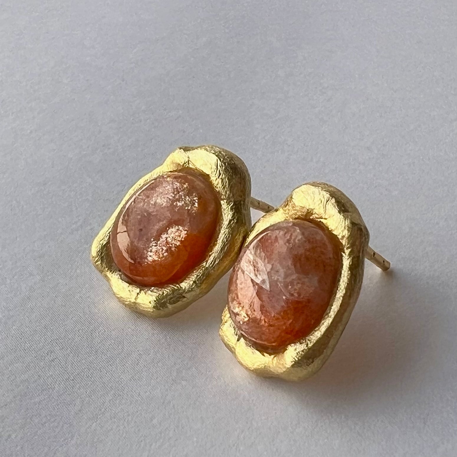 内側から光を宿したような輝きが美しい、サンストーンを主役に仕立てた一点物ピアス。