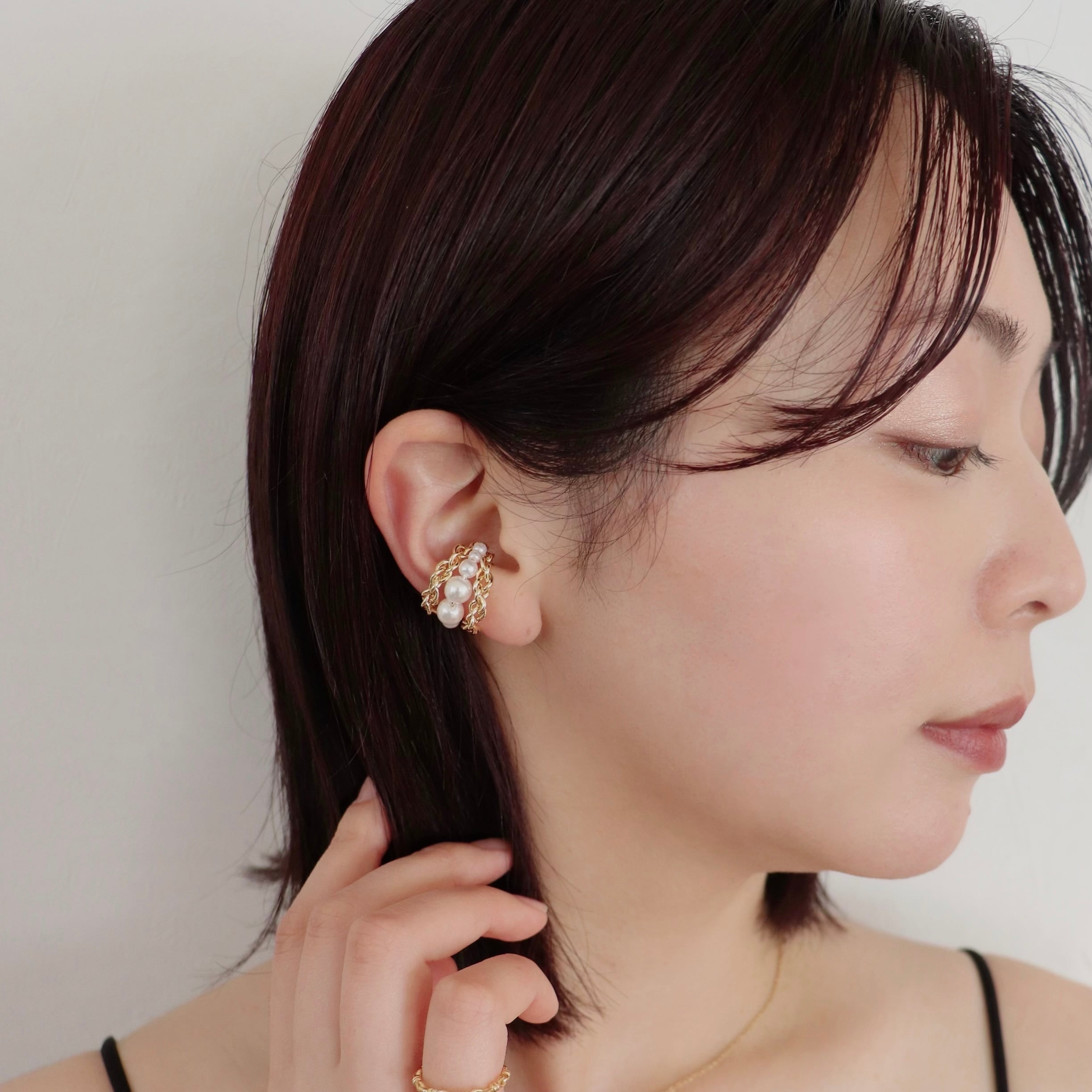 存在感のあるツイストチェーンに、やわらかな輝きのパールを組み合わせたイヤーカフ。