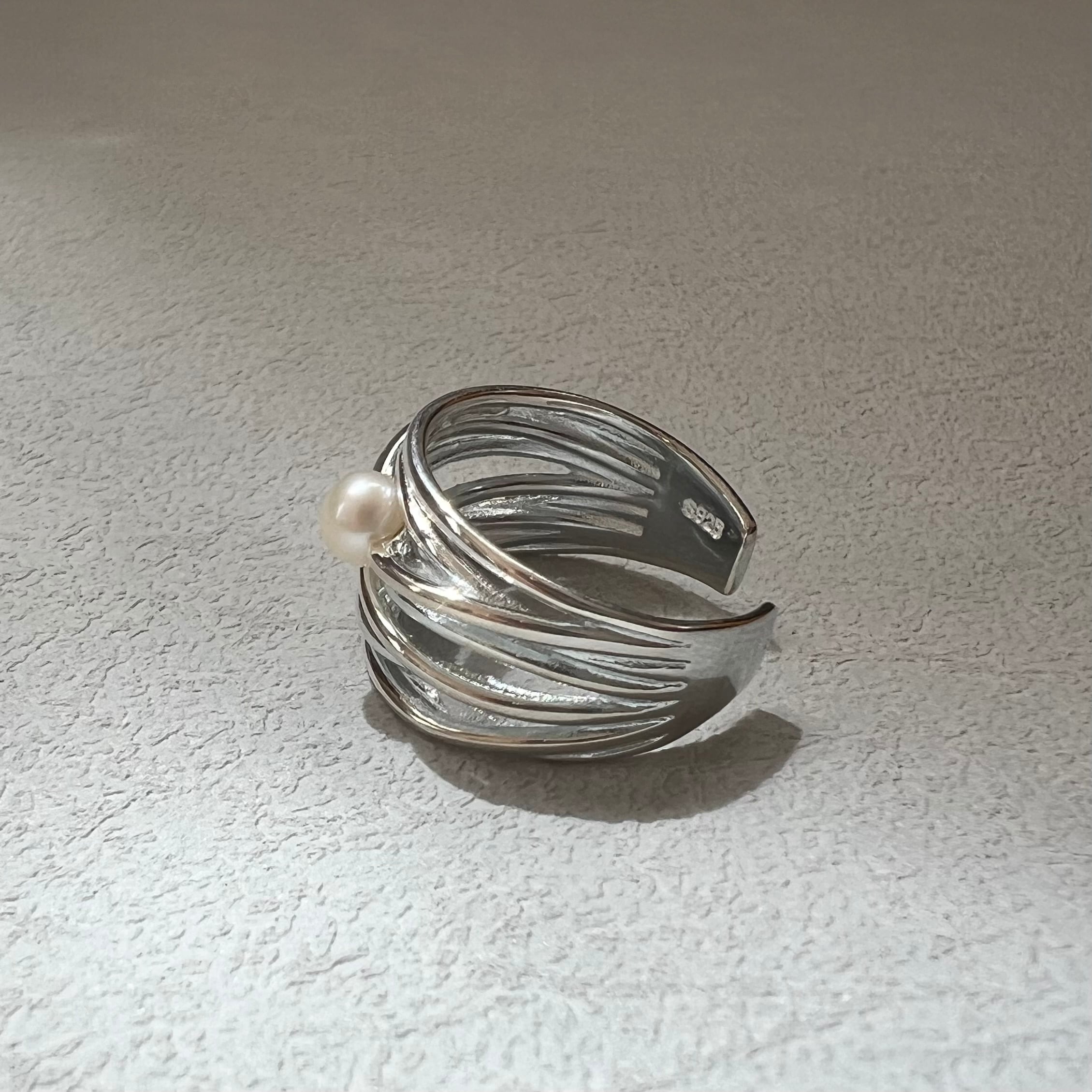 幾重にも重なるシルバーのラインが、指に沿って流れるように広がるデザインリング。