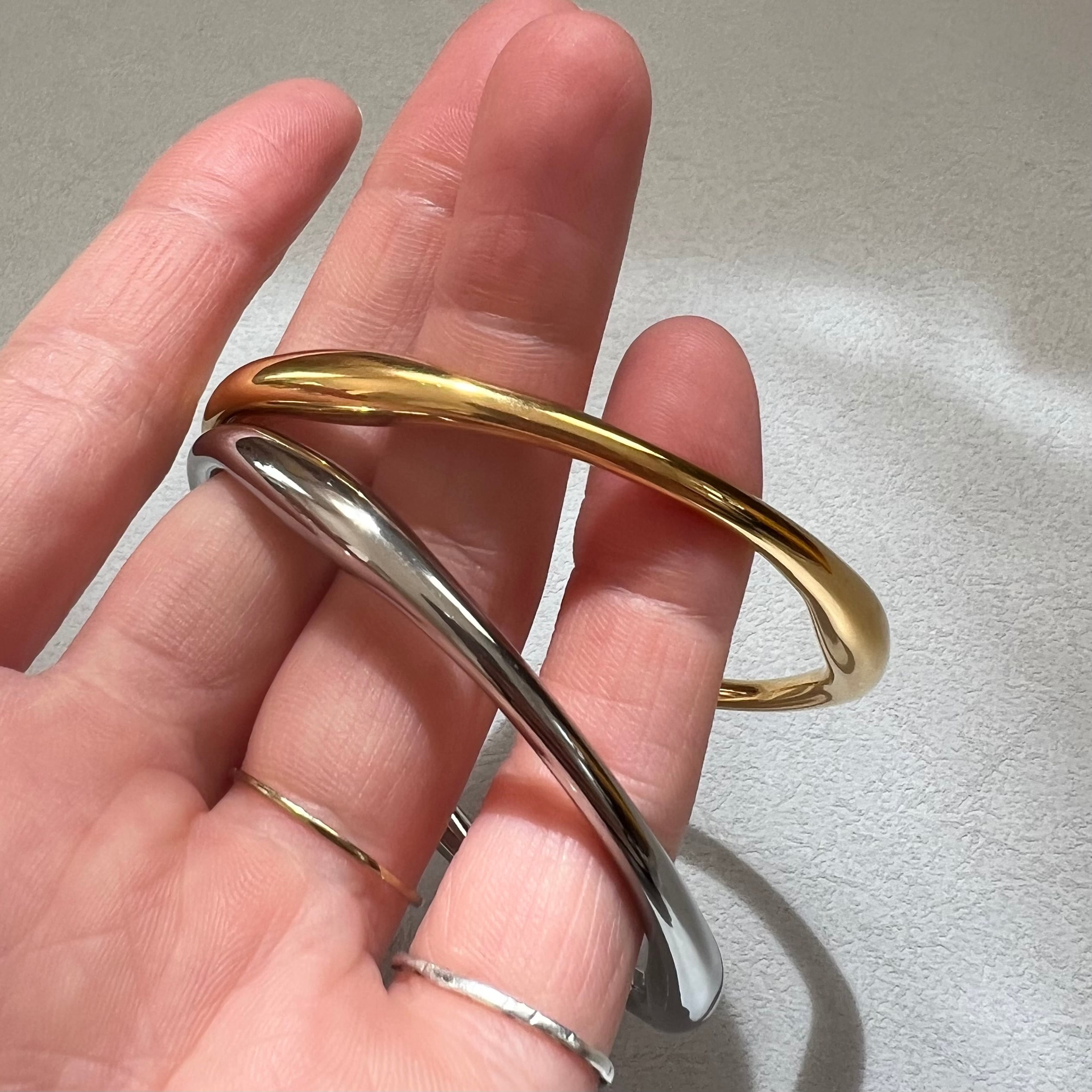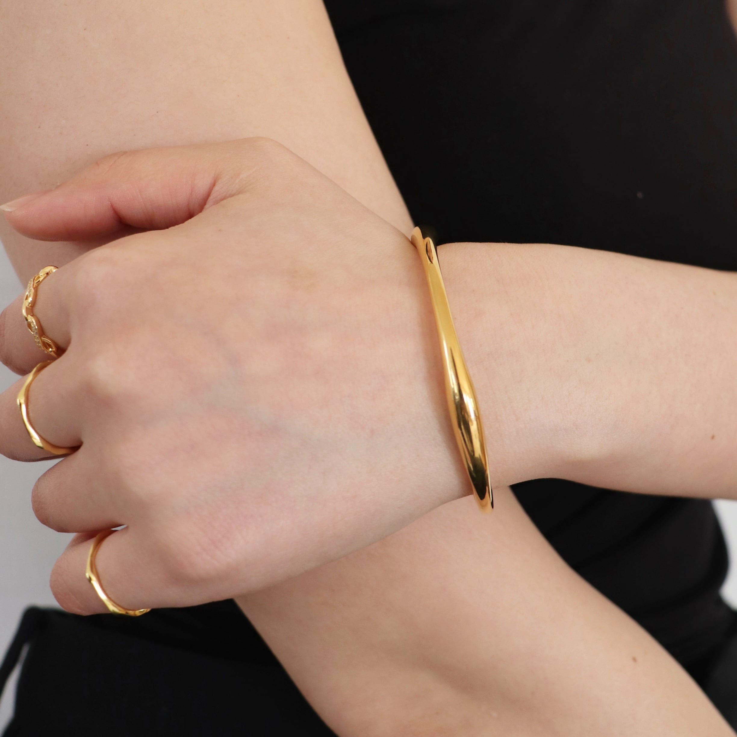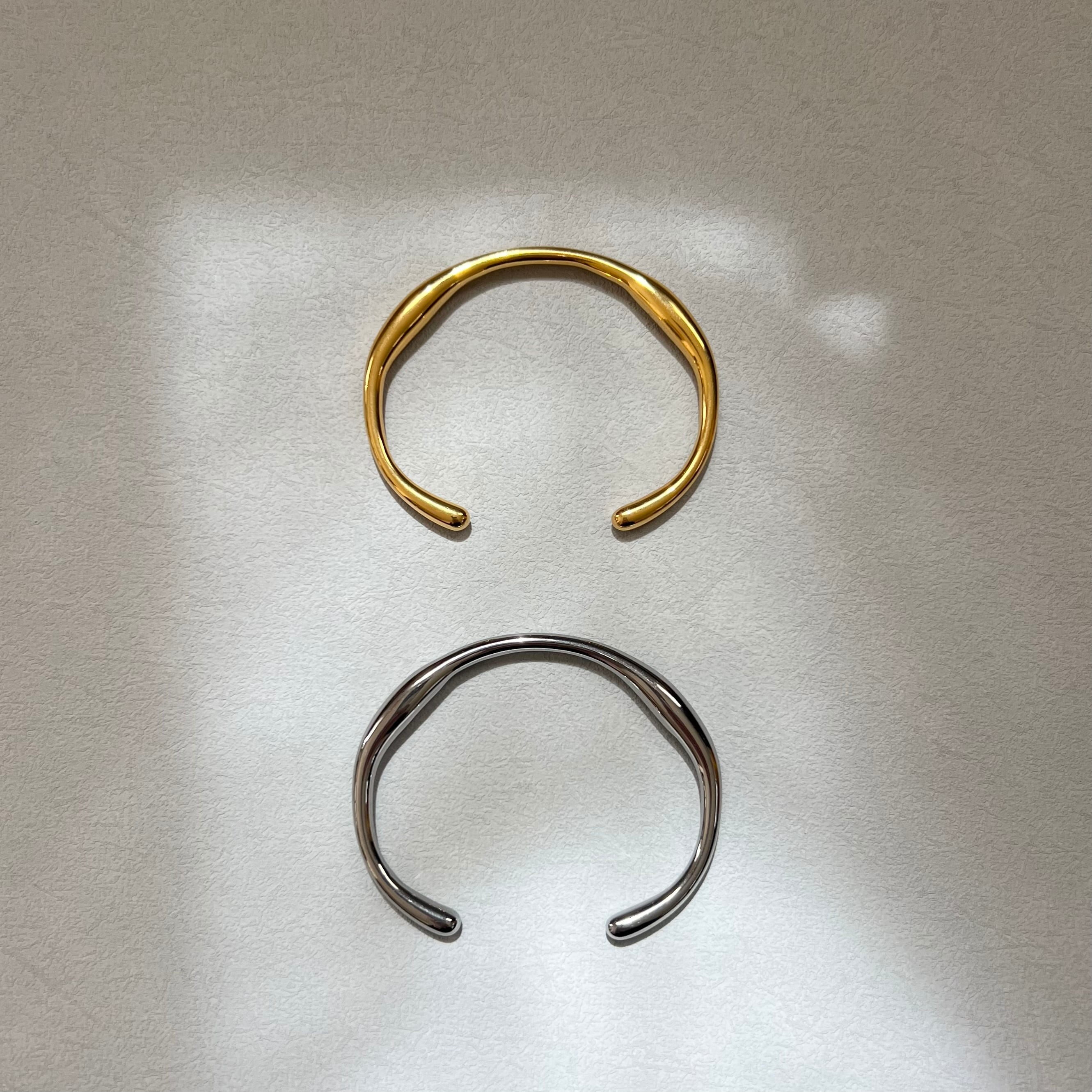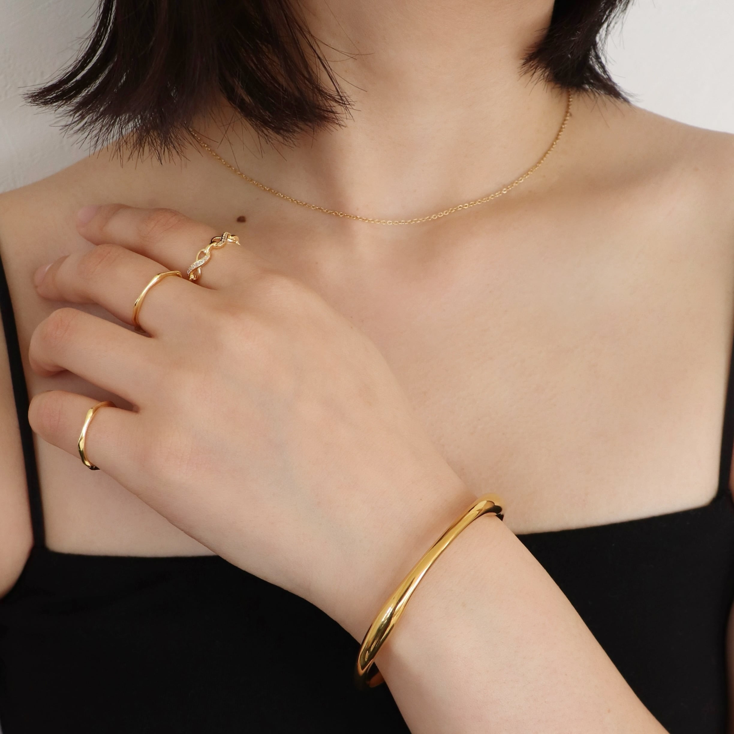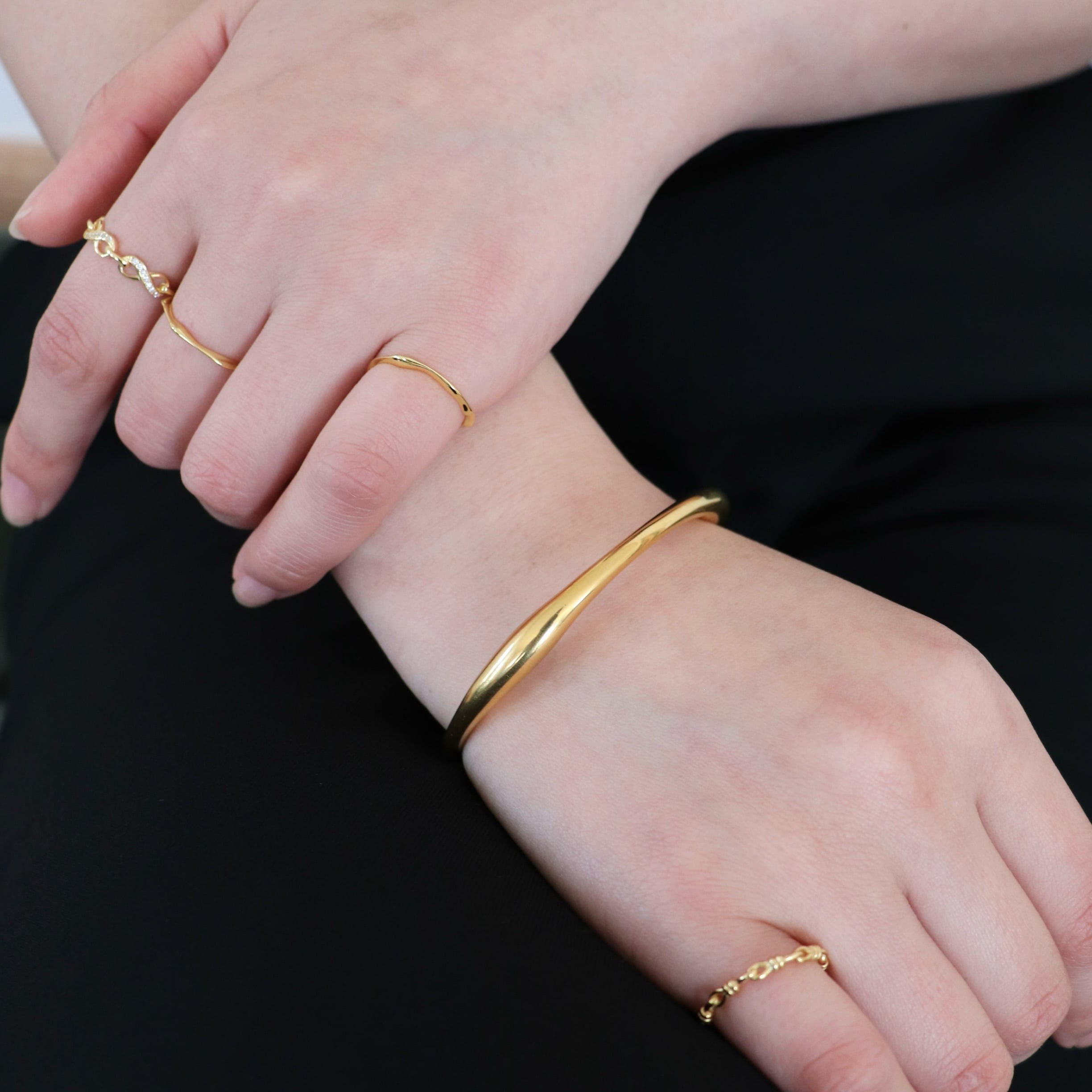 やわらかく流れるようなフォルムが手元に溶け込む、スリムウェーブバングル。