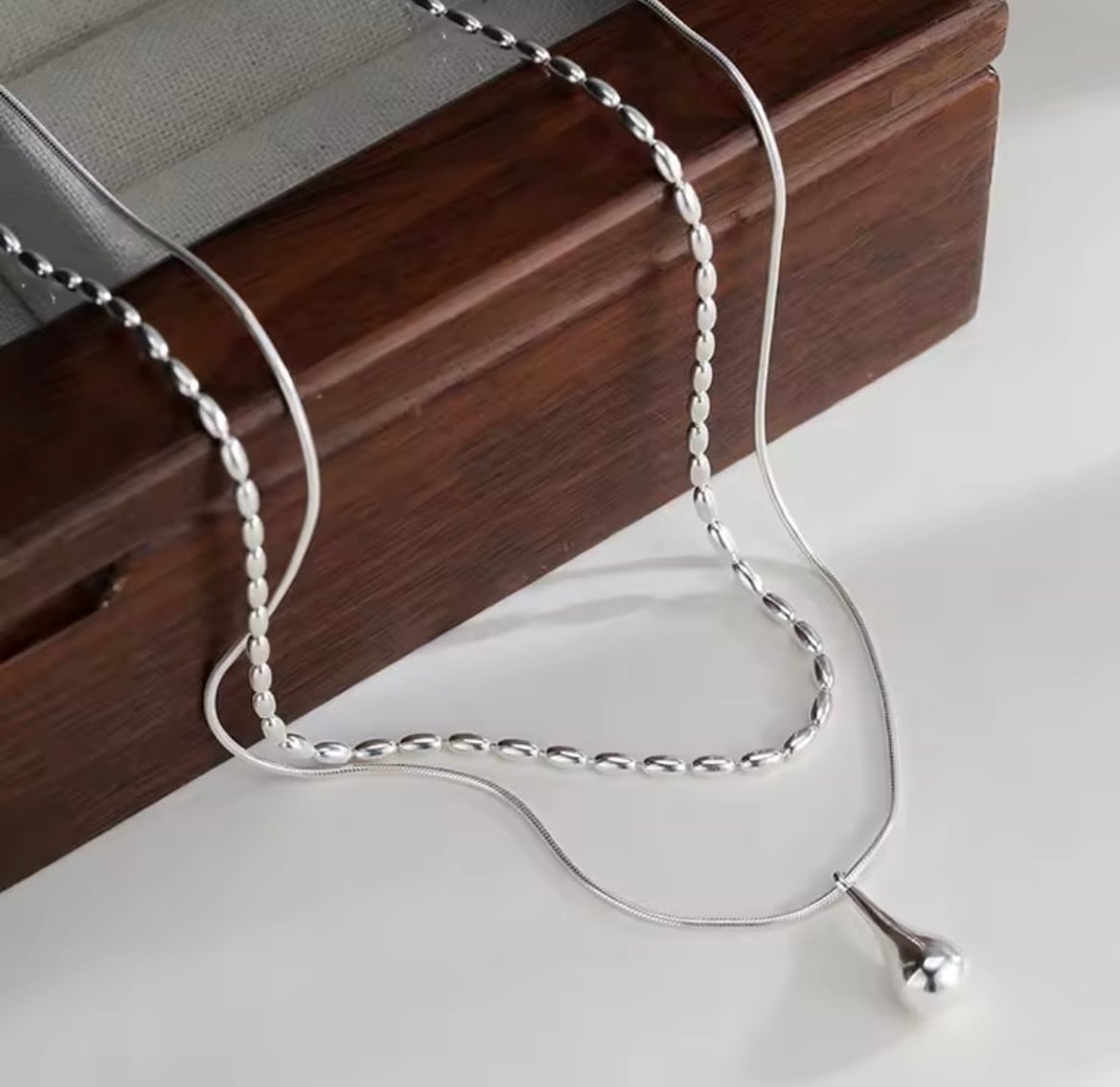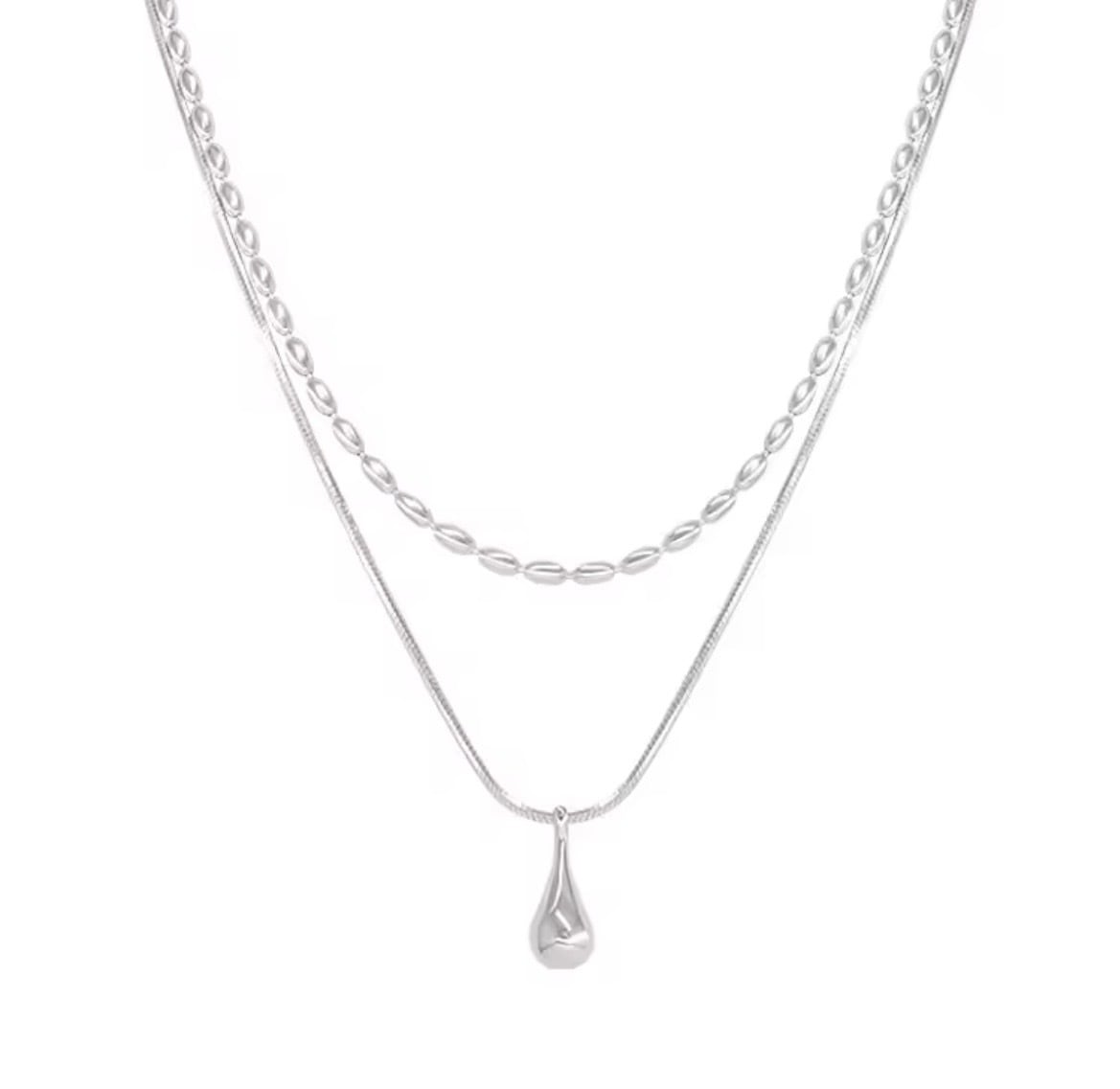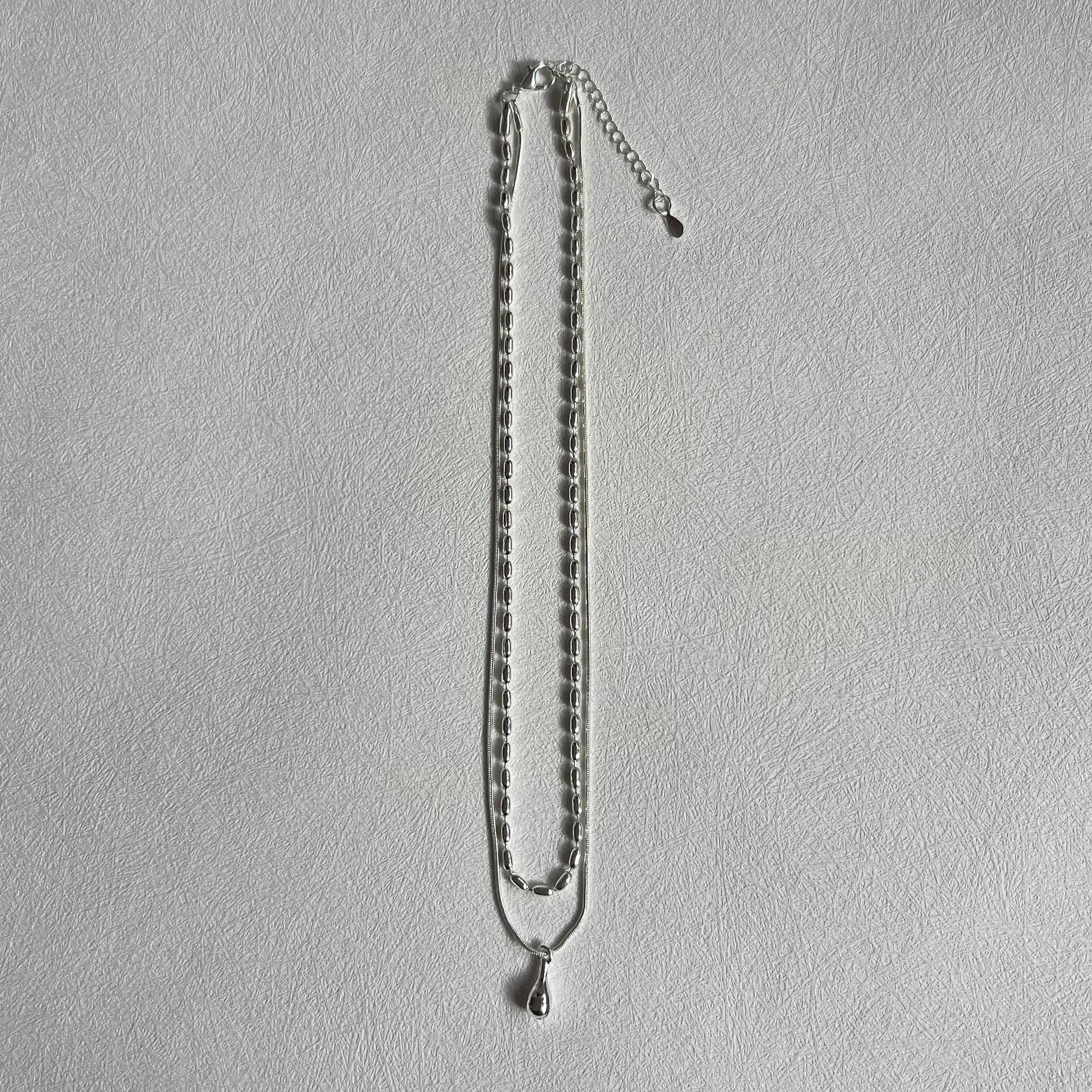 なめらかに流れるスネークチェーンと、立体感のあるオーバルチェーンを重ねたレイヤードネックレス。