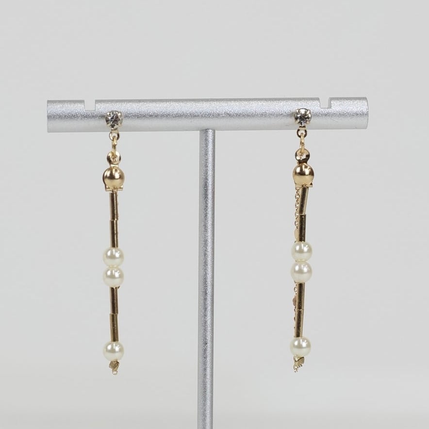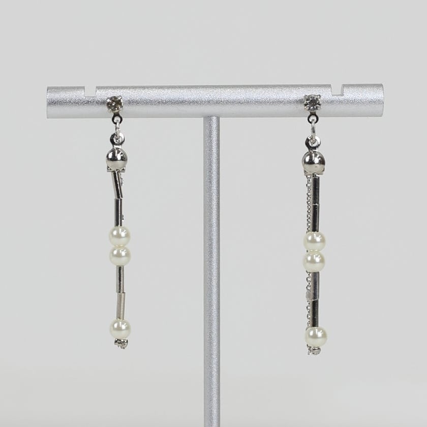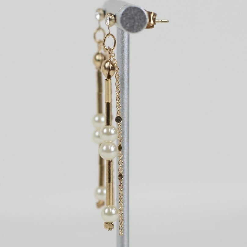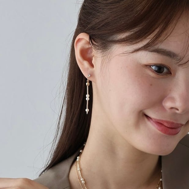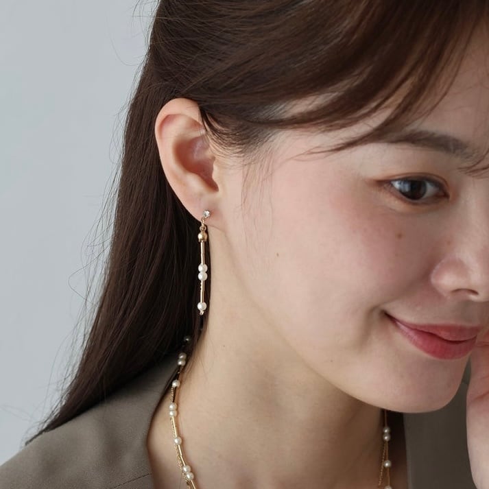動くたびに光を反射してきらきらと輝くチェーンと華奢なパール&メタルバーが連なった2本のチェーンが目を惹く縦長のデザイン。