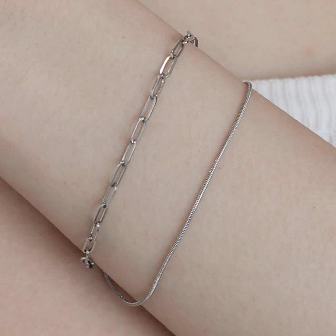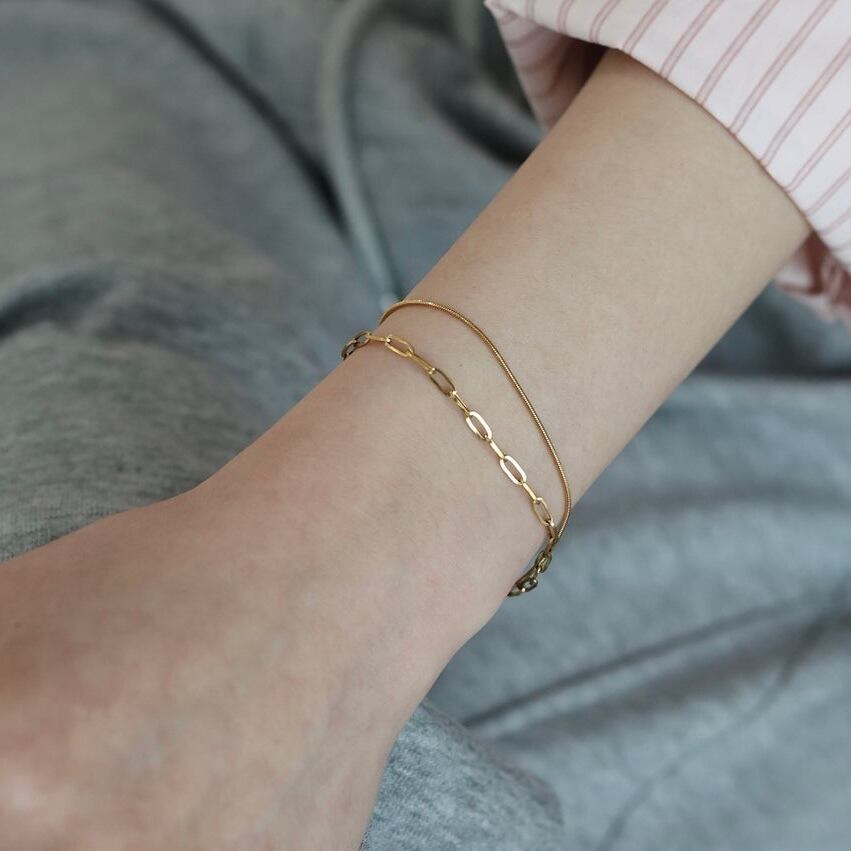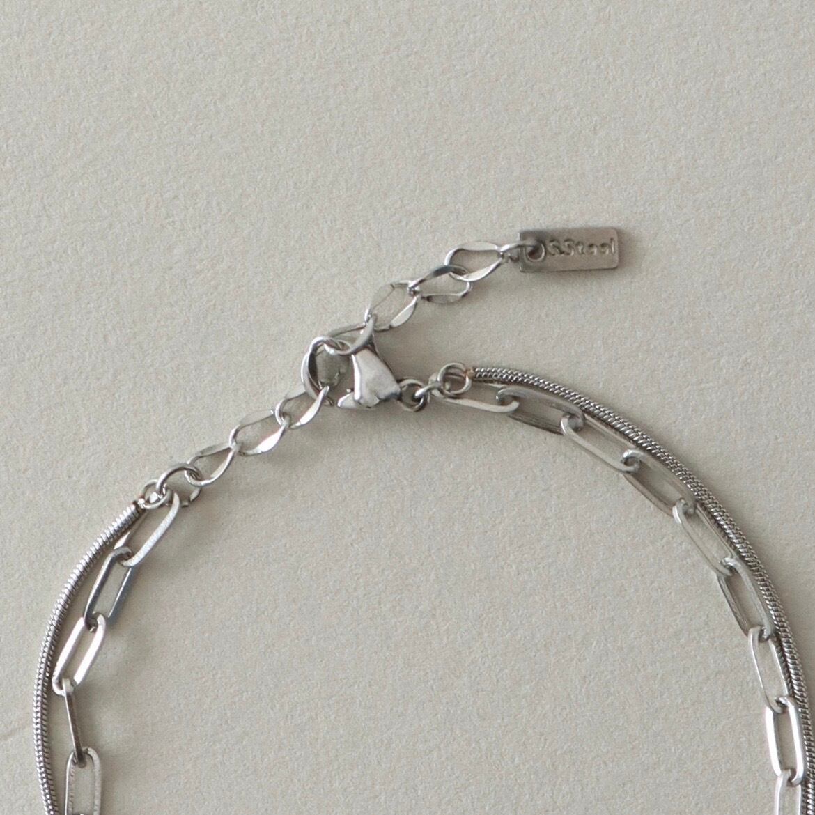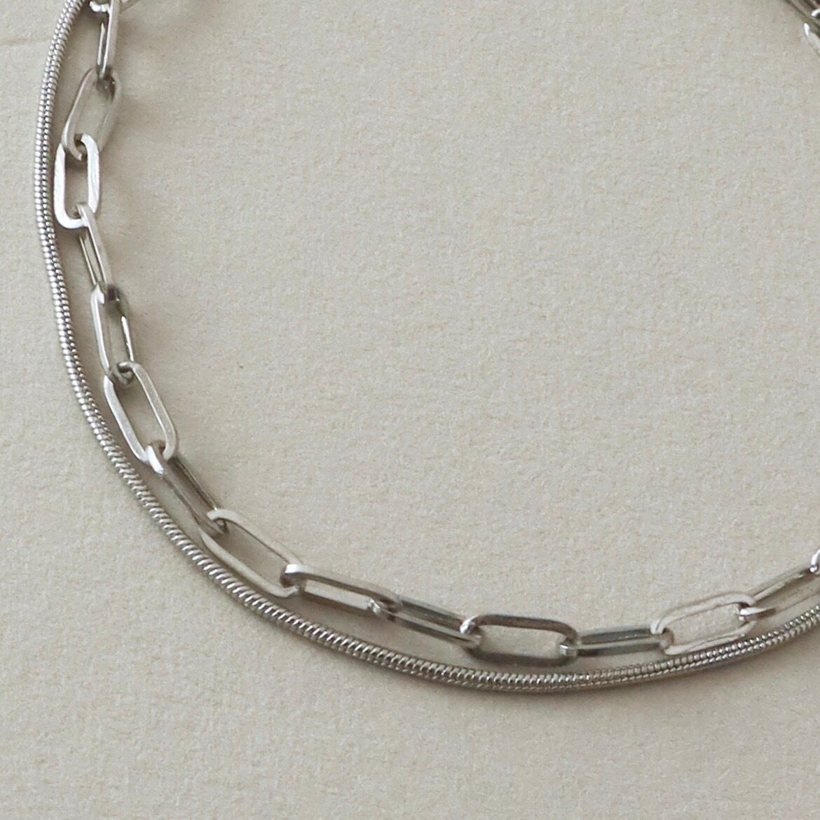 洗練された2種のチェーンが織りなす、モダンな2連レイヤードブレスレット。