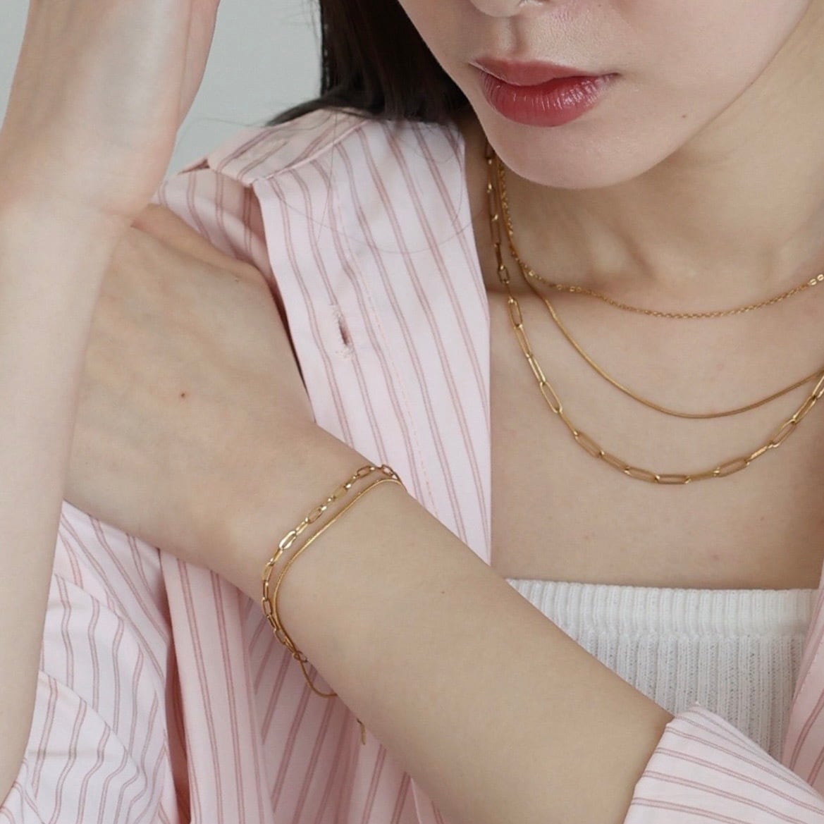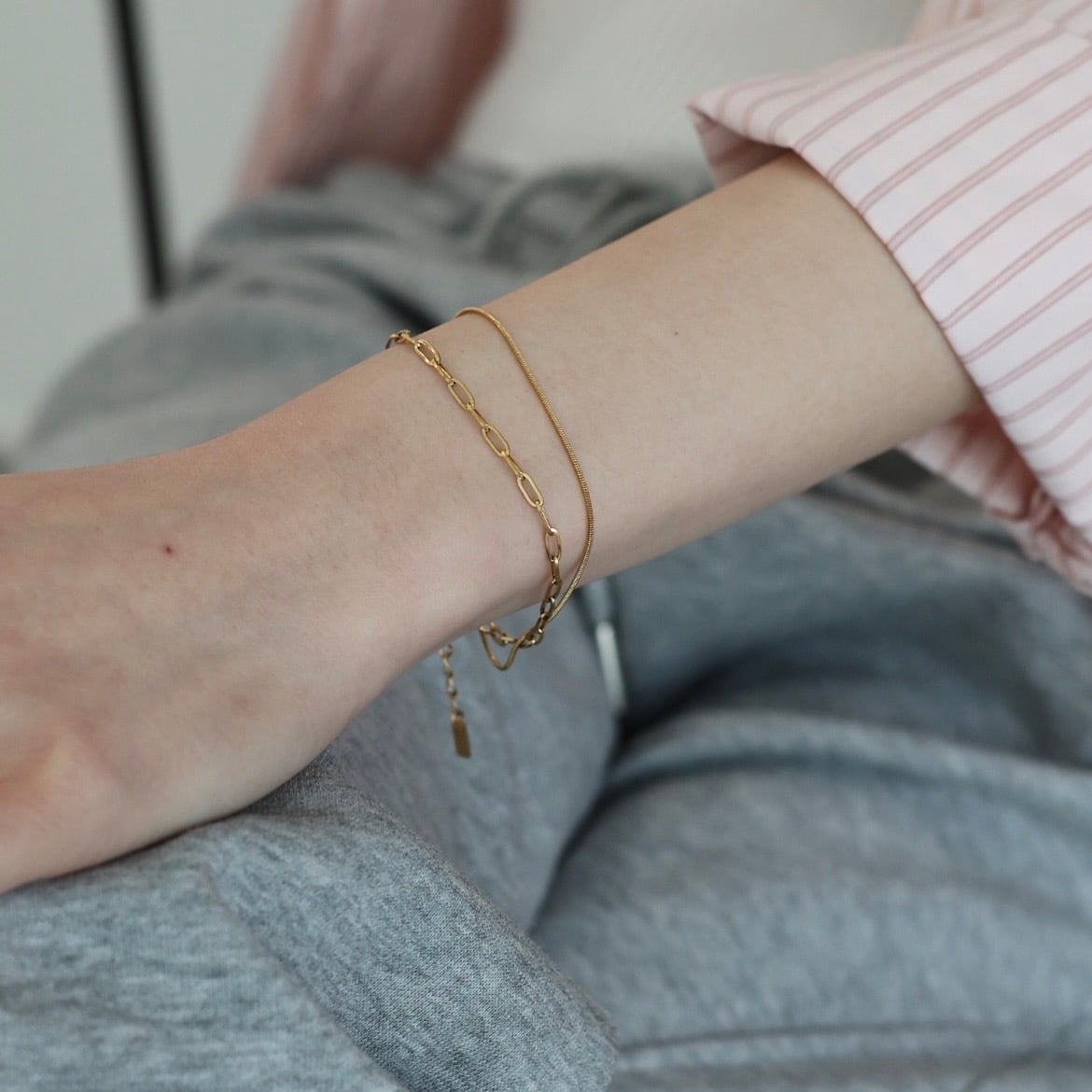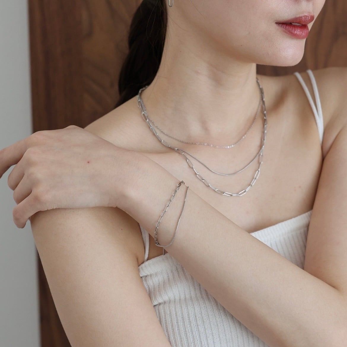 洗練された2種のチェーンが織りなす、モダンな2連レイヤードブレスレット。