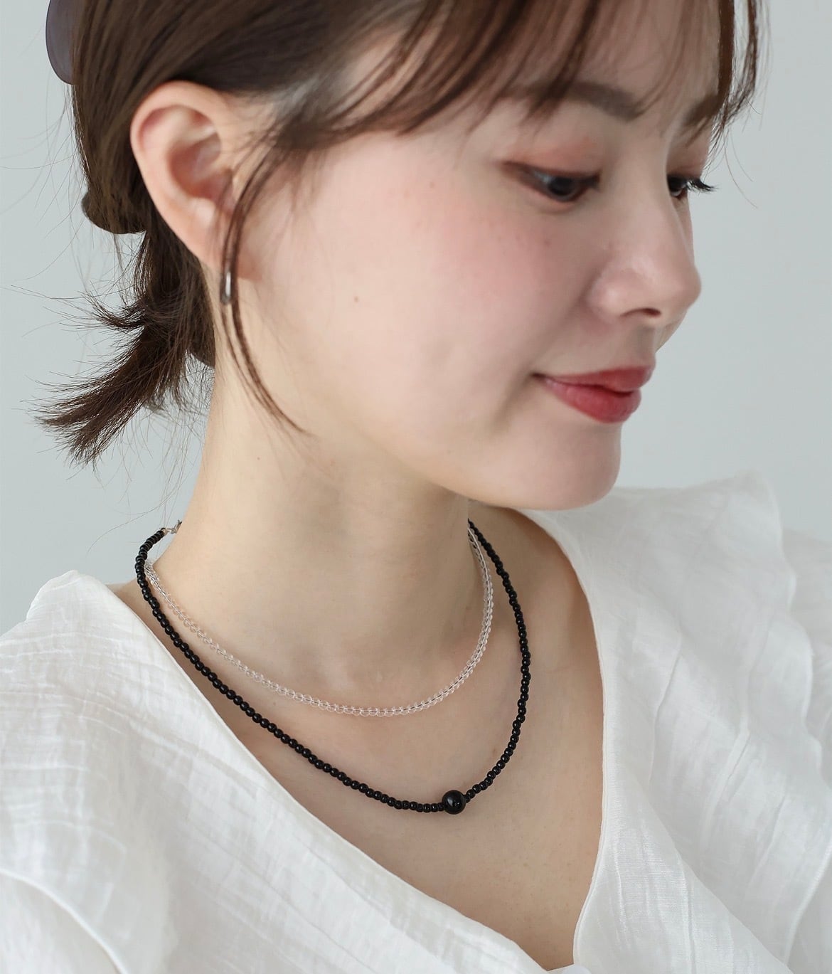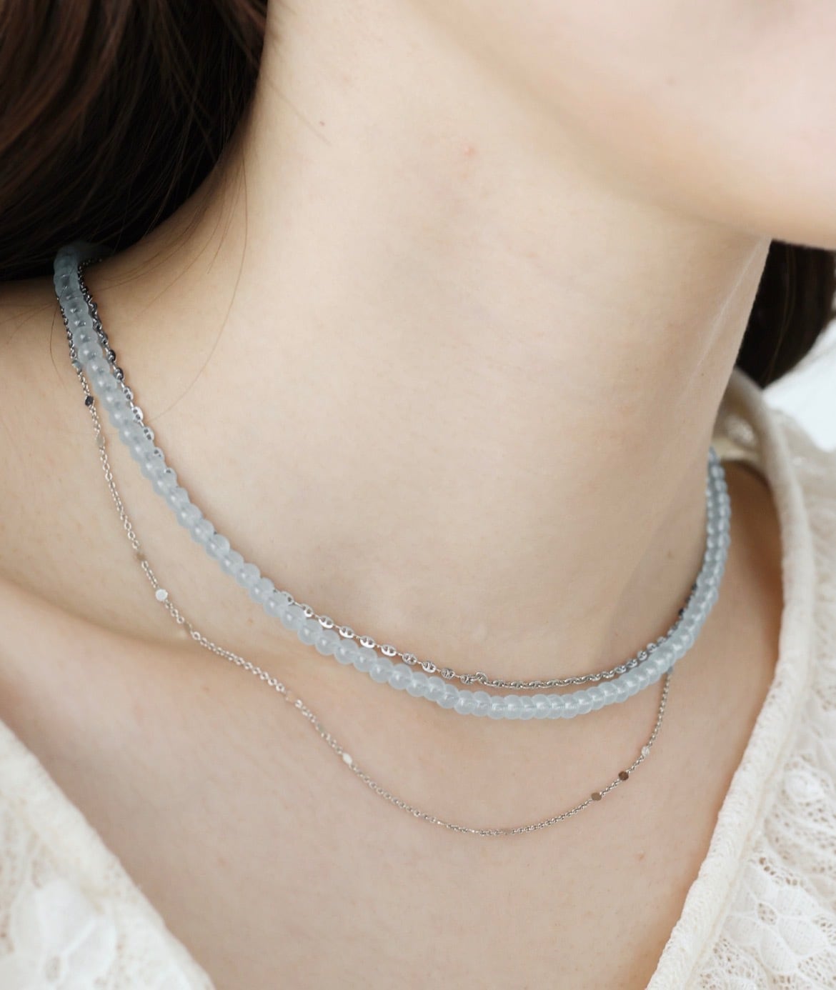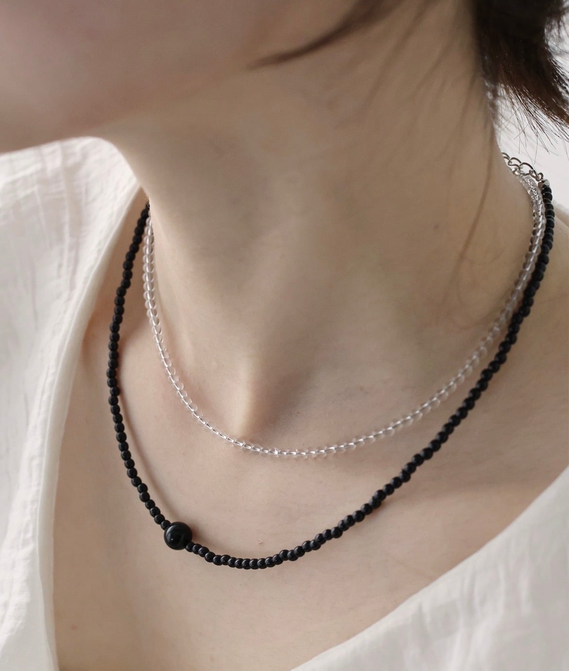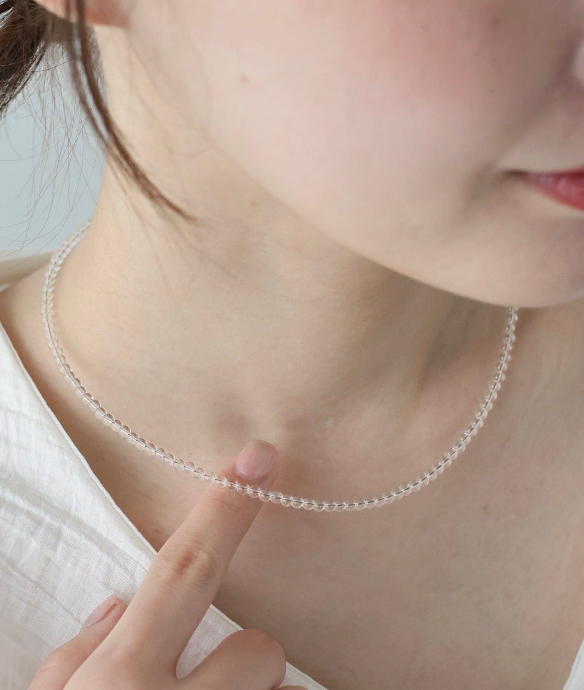 透け感のあるクリアで主張しすぎないカラーで、他のネックレスとレイヤードするのも◎